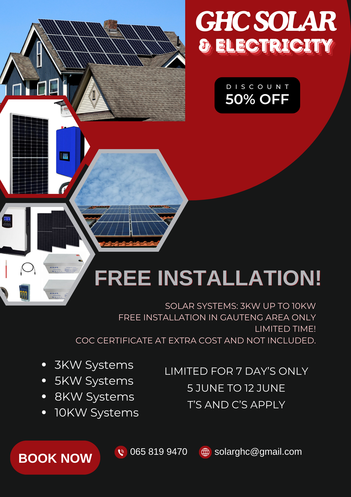 Solar systems 3kw up to 10kw systems with free installation, only valid for 1 week. Gauteng area only. Book now or enquire for more information.