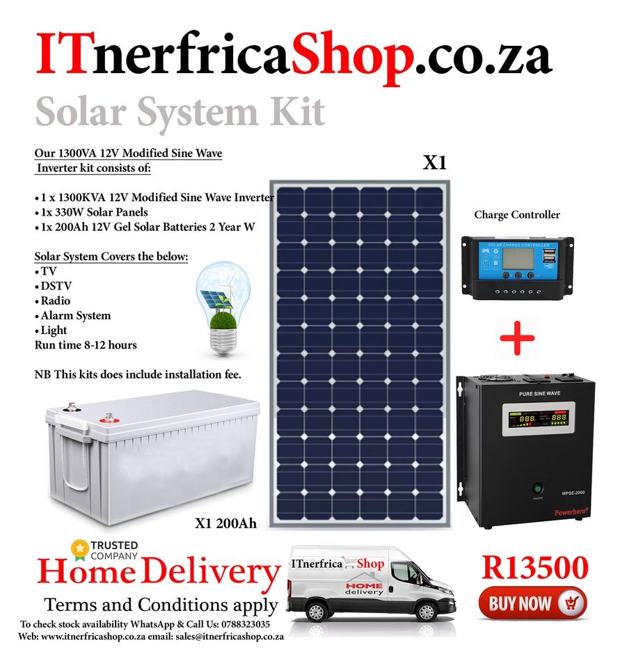 To check stock availability WhatsApp & Call Us: Our 1300VA 12V Modified Sine Wave Inverter kit consists of: • 1 x 1300KVA 12V Modified Sine Wave Inverter • 1x 330W Solar Panels • 1x 200Ah 12V Gel Solar Batteries 2 Year W Solar System Covers the below: • TV • DSTV • Radio • Alarm System • Light Run time 8-12 hours NB This kits does include installation fee. You can place your order at our Online shop ITnerfricashop or we can place the order for you from our website Online Shopping, The delivery or collect will take place after the successful payment or EFT, Unfortunately we don't do Cash of Delivery from all our Orders at ITnerfricashop.