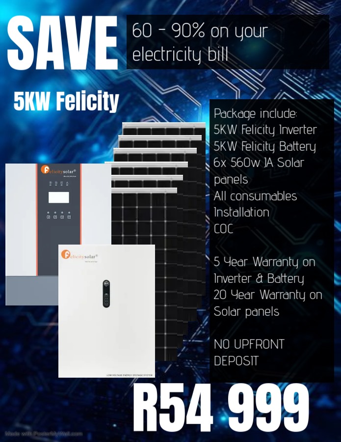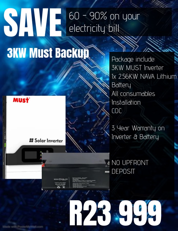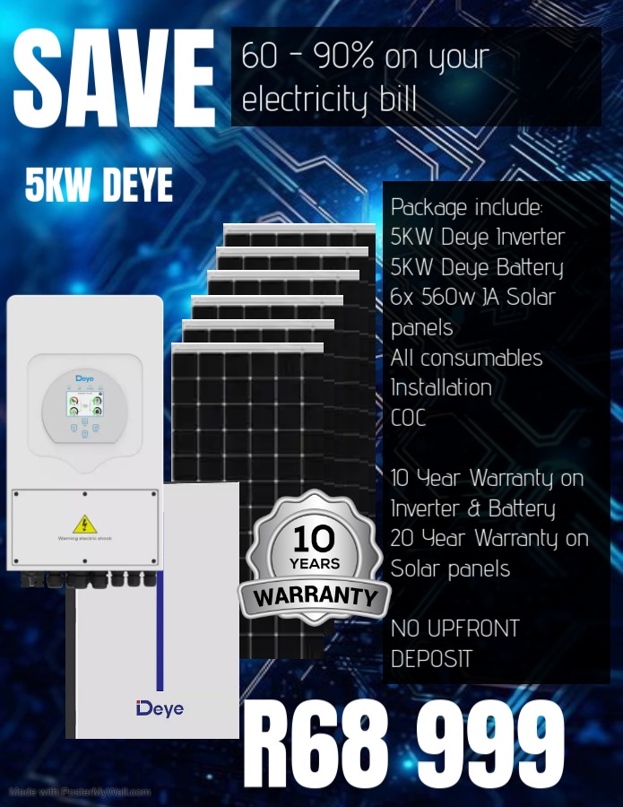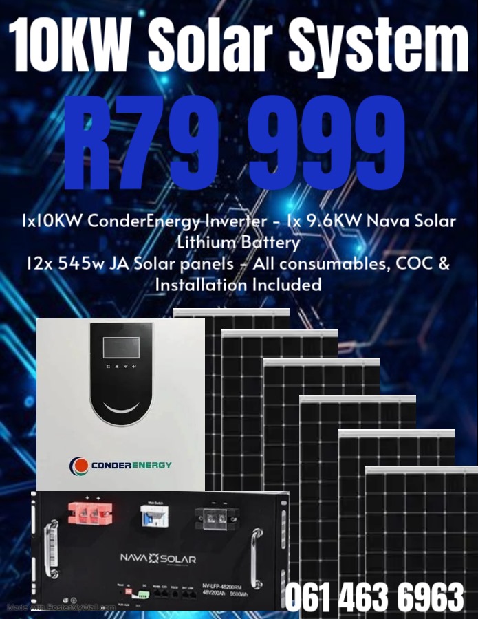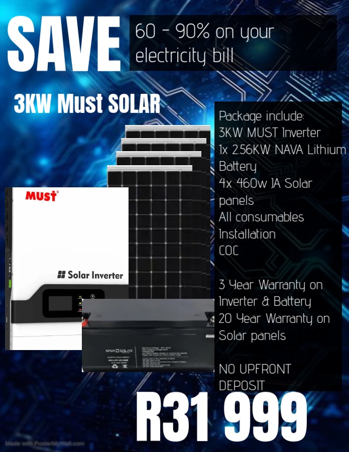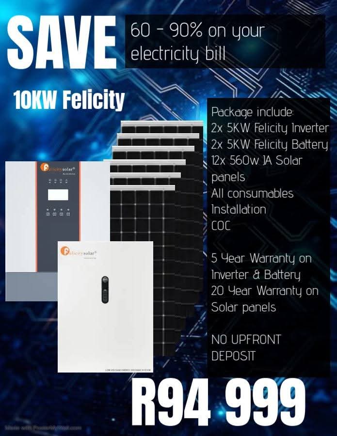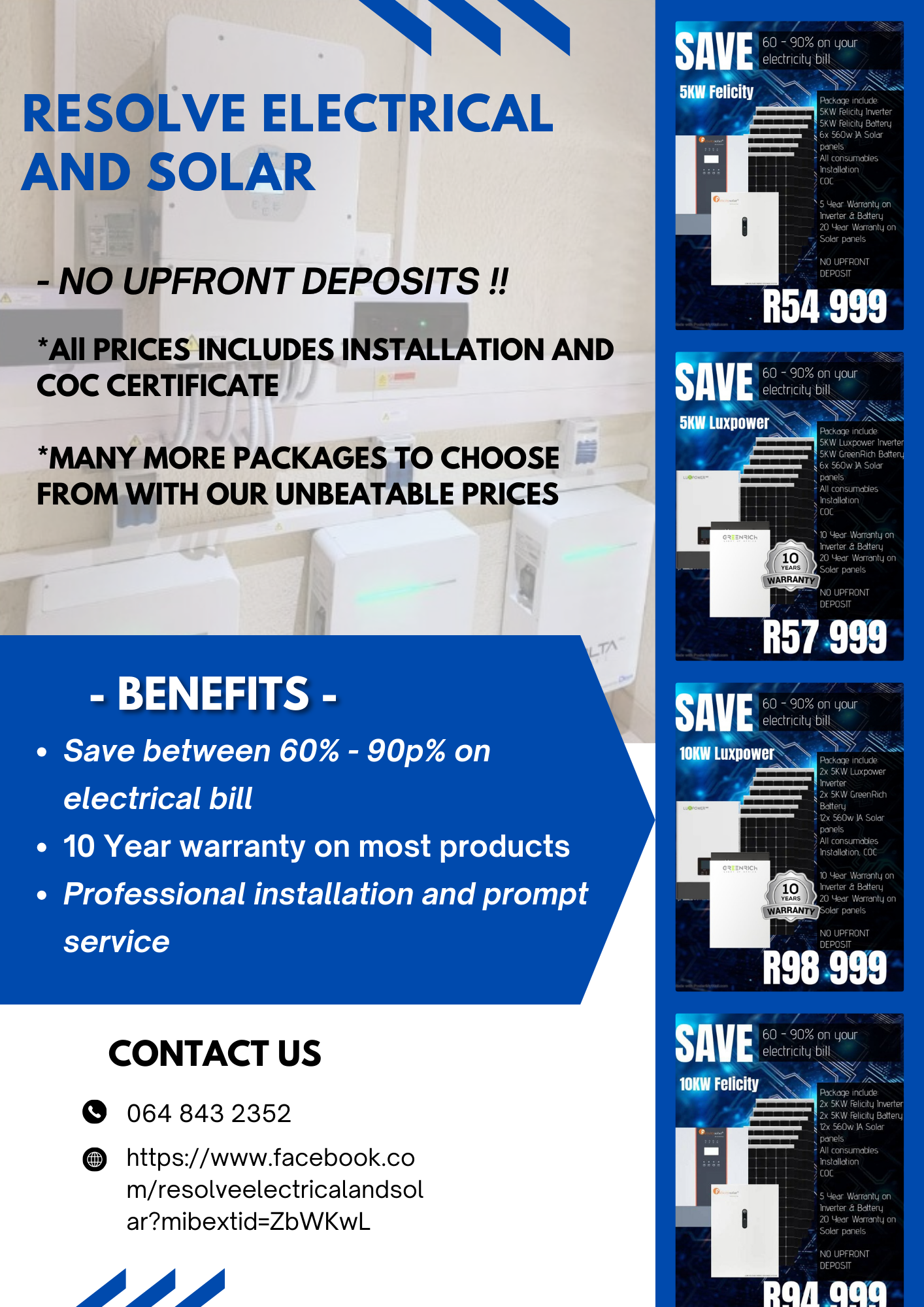Best prices on solar packages with no upfront deposits. Save 60% to 90% on your electrical bill. All packages includes installation and COC certificate. Don't be left in the dark and call 064 843 2352view more to book your installation today..