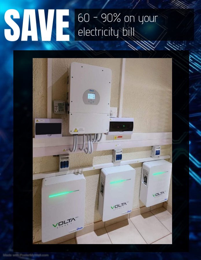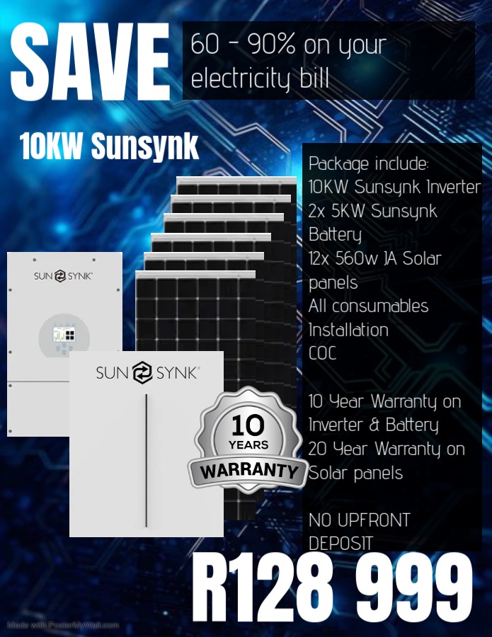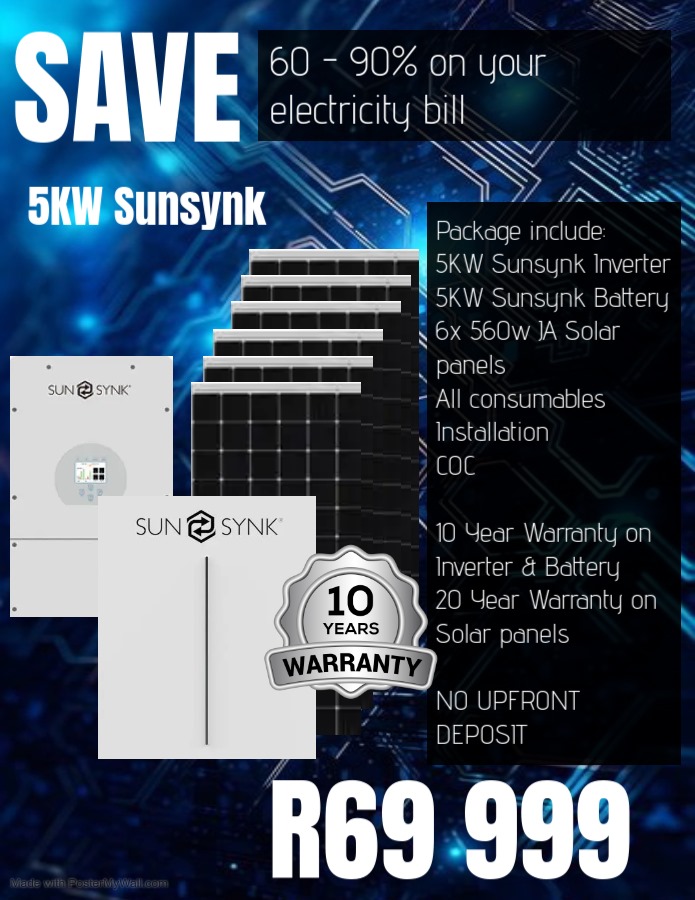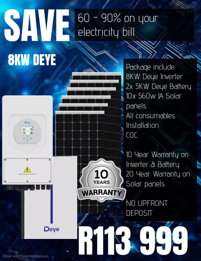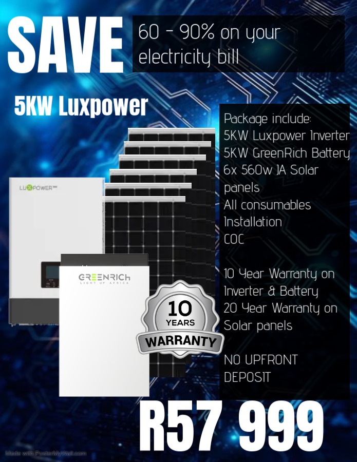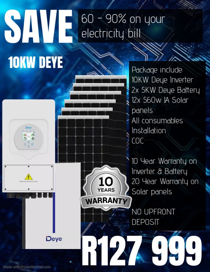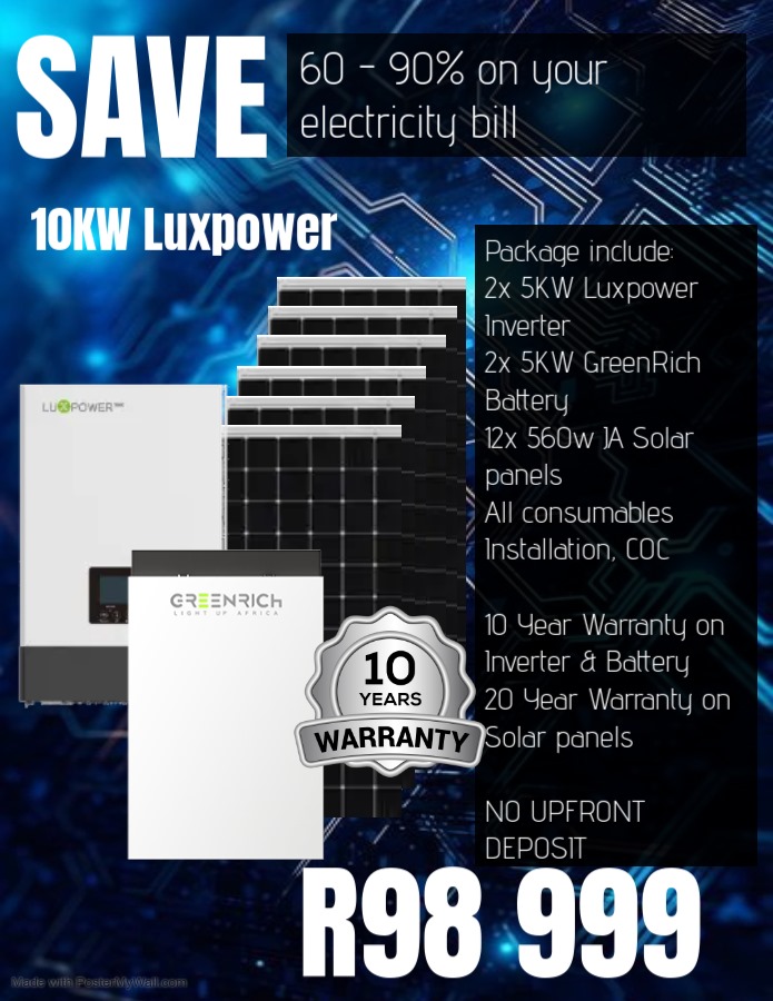 Best prices on solar packages with no upfront deposits. Save 60% to 90% on your electrical bill. All packages includes installation and COC certificate. Don't be left in the dark and call 064 843 2352view more to book your installation today..