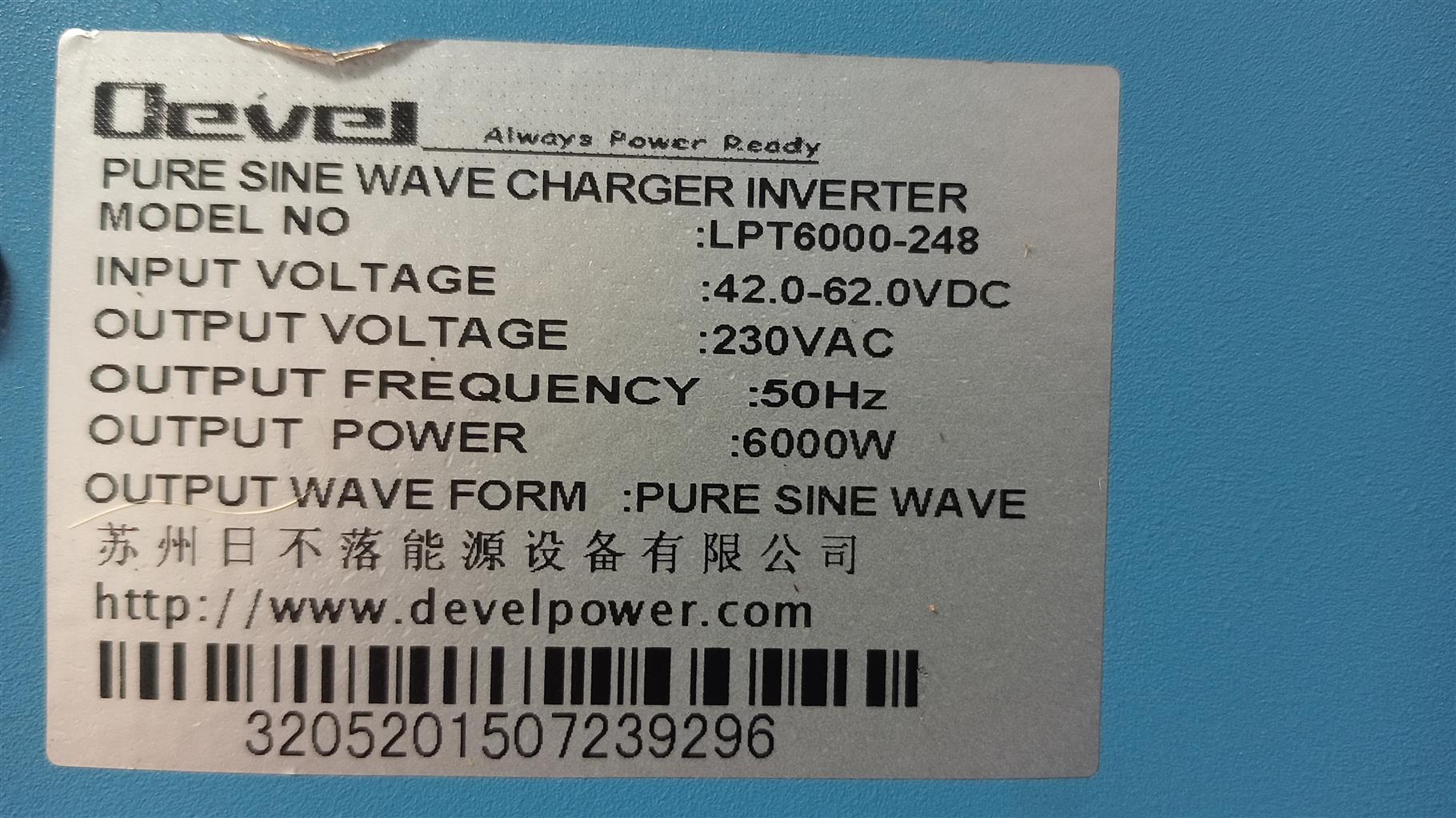 Pure sine wave output, input & output fully isolated - Built-in AC charger with 4-stage charge mode. Up to 75A - High efficiency design up to 88%, energy saving mode - Excellent loads with 3 x-rated start power - Built-in-LCD display, show date of working - Built-in AC bypass relay. UPS function - Advanced microprocessor control - Input polarity/UVP/OVP/OSP/OLP/OYP - Remote control RJ11 Specifications: - Models: LPPT-6000 - Output Power: 6000W - Surge Power: 18000W - DC Input Voltage: 48V DC - Output Voltage: 220/230/240V AC 10% - Output Frequency: 50/60HZ 0.5% - Output Wavefoam: True sine wave (THD < 5%) - Power Factor: 0.1-1 - Efficiency: 88% - No Load Power: < 10W (Power saving model) - Transfer Time: < 8ms - AC Range: 90-135VAC/190-245VAC - Voltage Range: 42.0-62.0VDC - Charger Current: 50A - Fault indication: LED Red - Remote Control: RJ11 - Safety: LVD (EN60950) - EMC: CE (EN55022: 2006+A1: 2007) - Operating Temp:-20-50 Degrees Celsius - Working Humidity: 20-90% RH - Storage Temp: -30 - 70 Degrees Celsius - Cooling: Automatically controlled cooling fan - Weight: 45kg - Dimensions: 600mm x 218mm x 180mm - Application: Vehicle, Yacht, Solar Power System, Portable equipments, Power tools, Home and office appliances