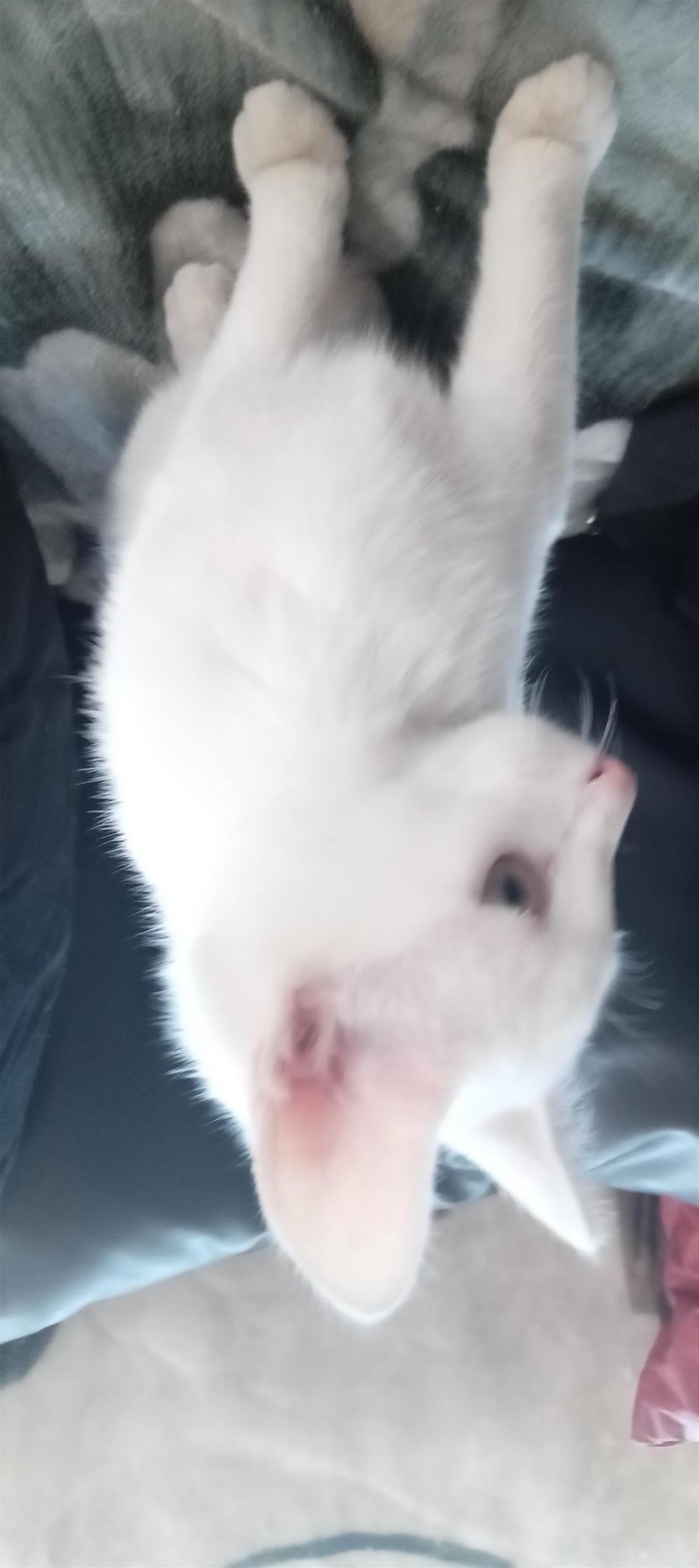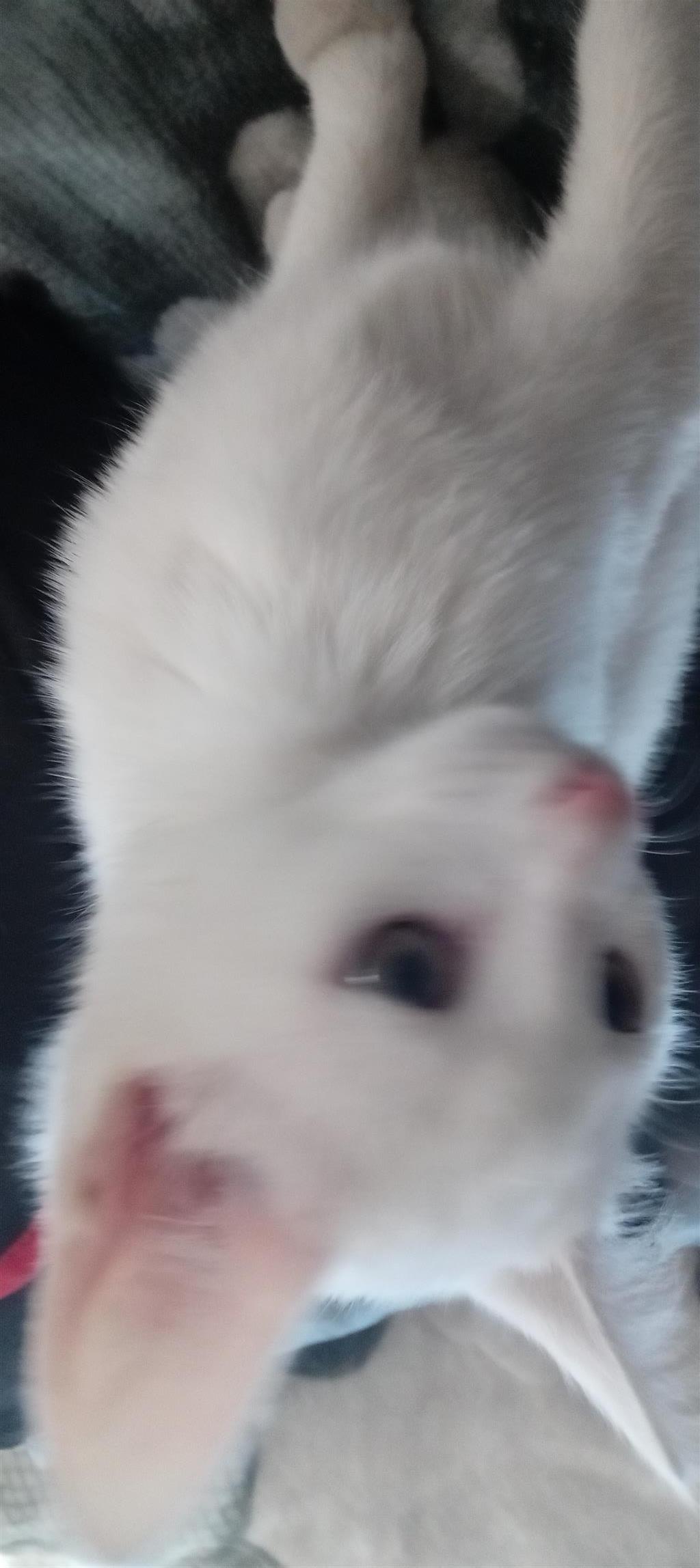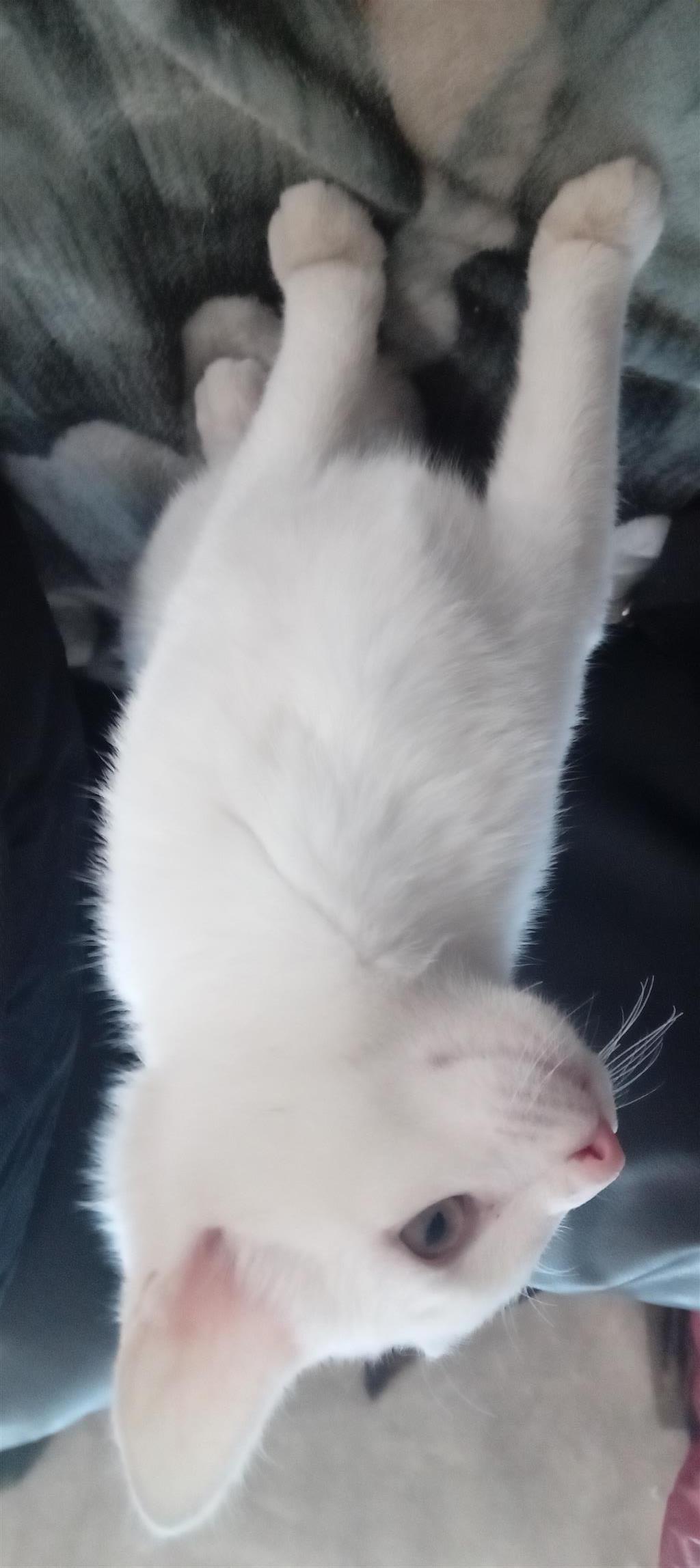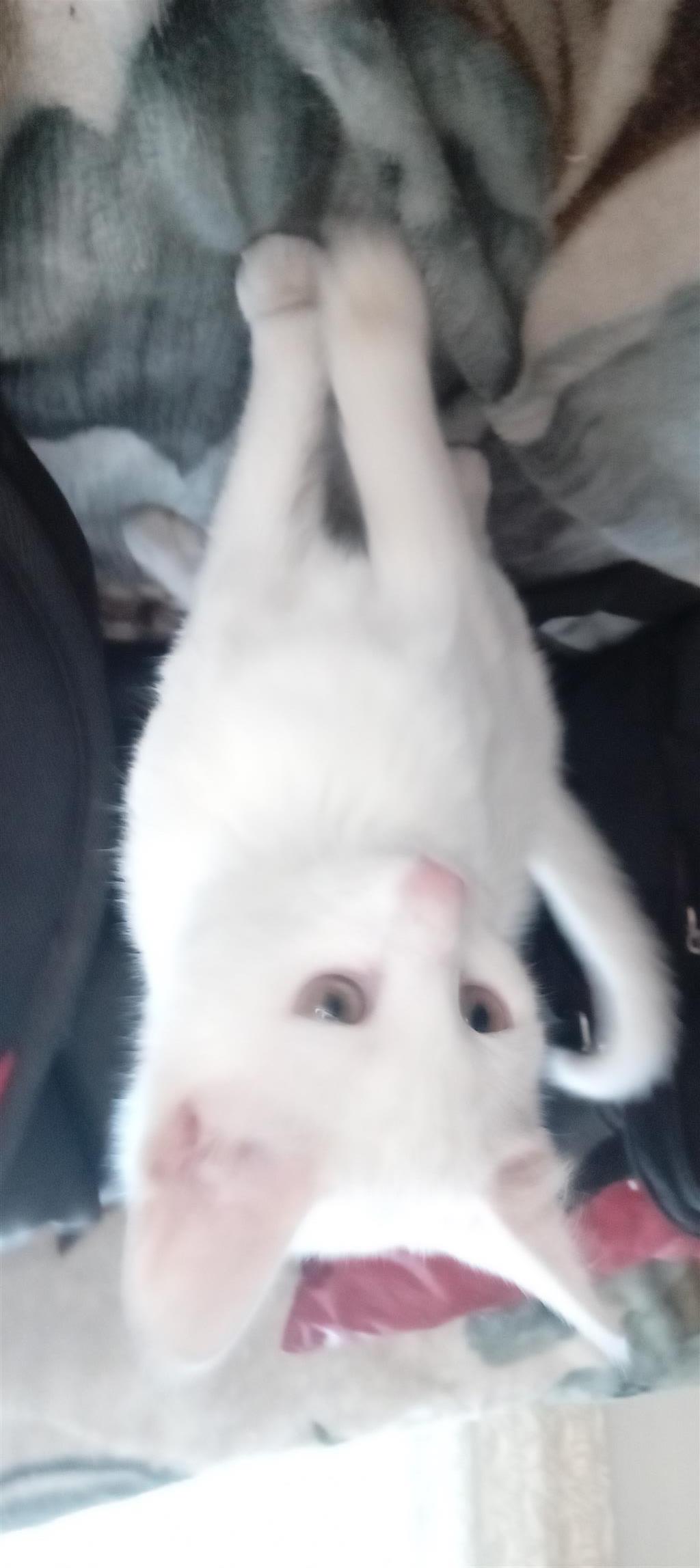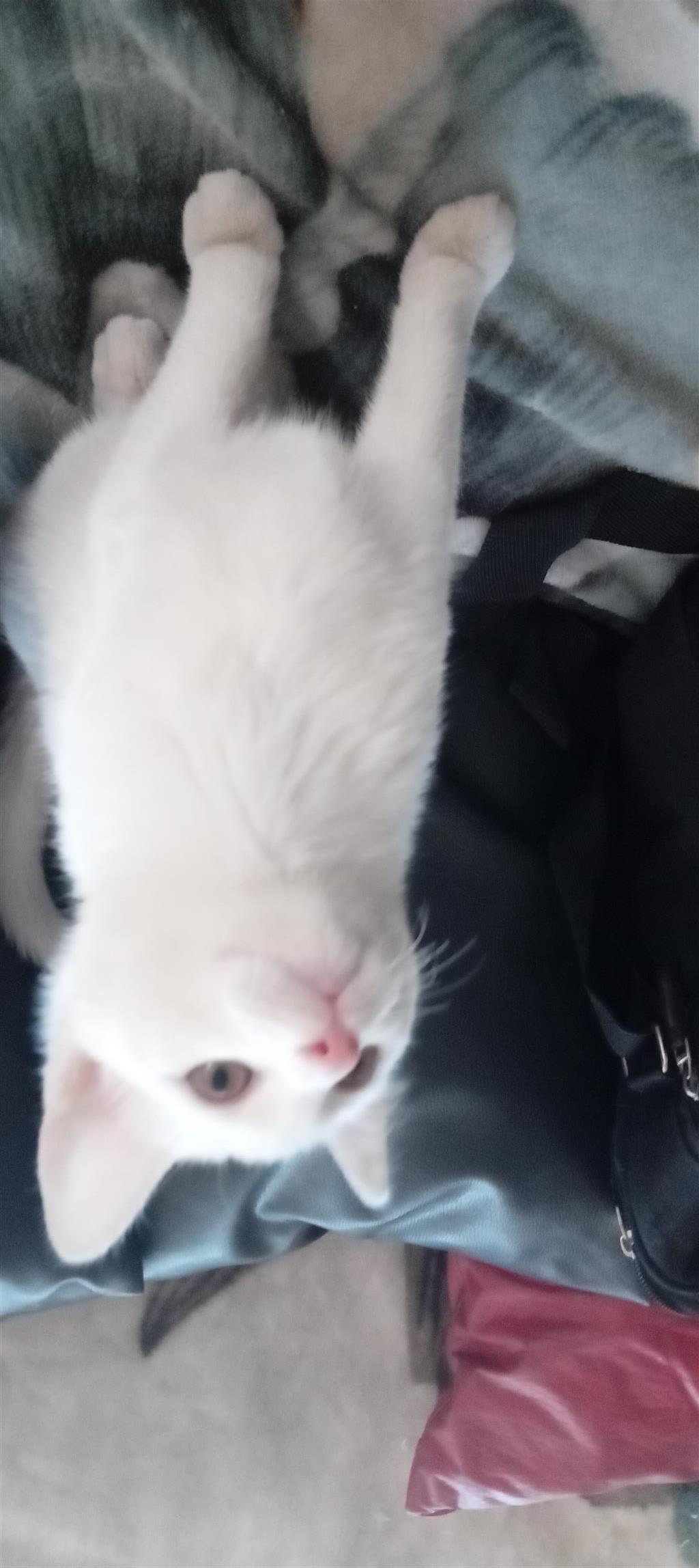 Full white kitten. Born 4 March 2025. Three months old. Very playful. Needs a home. Trained to use cat litter.