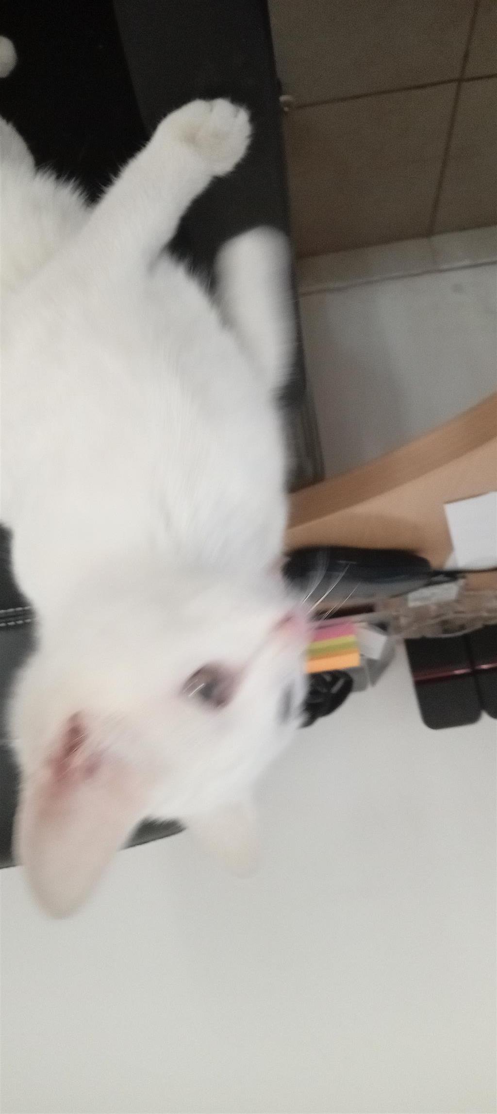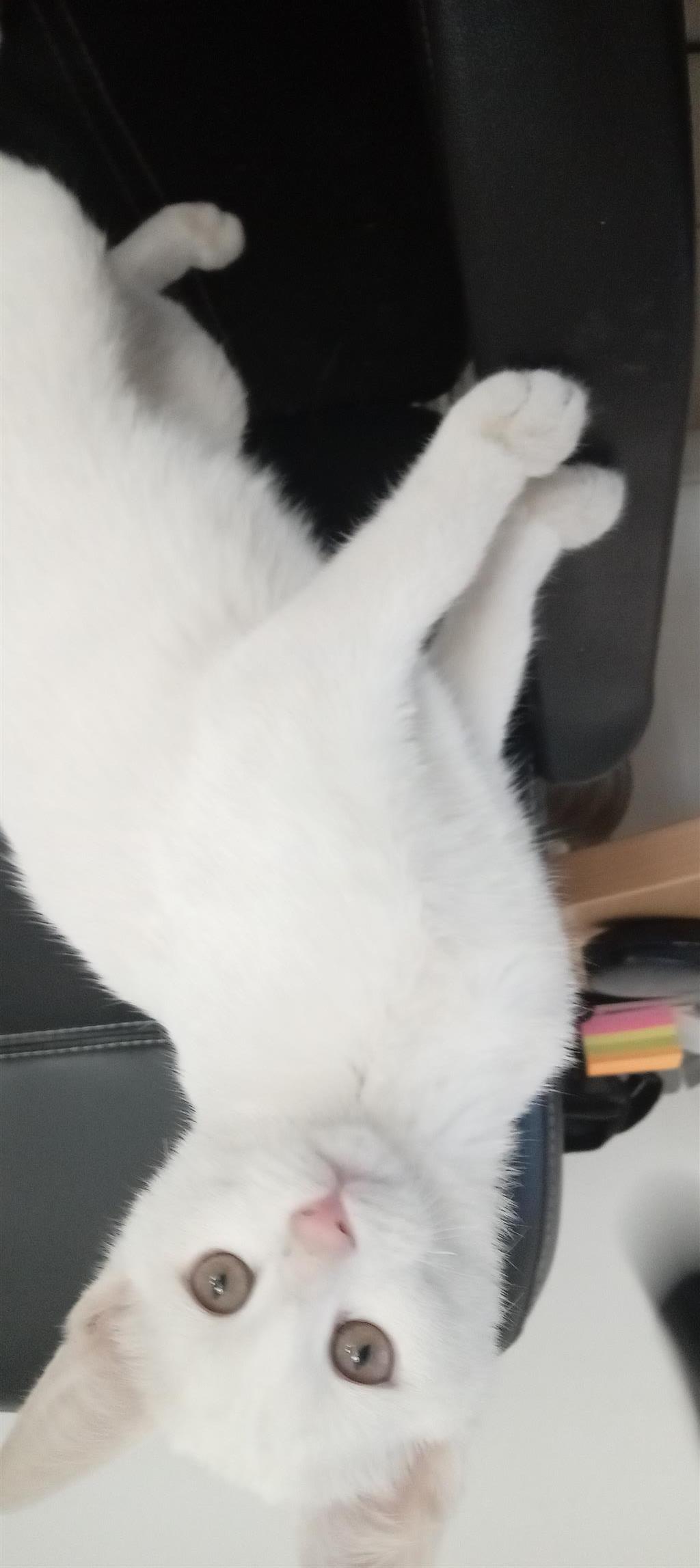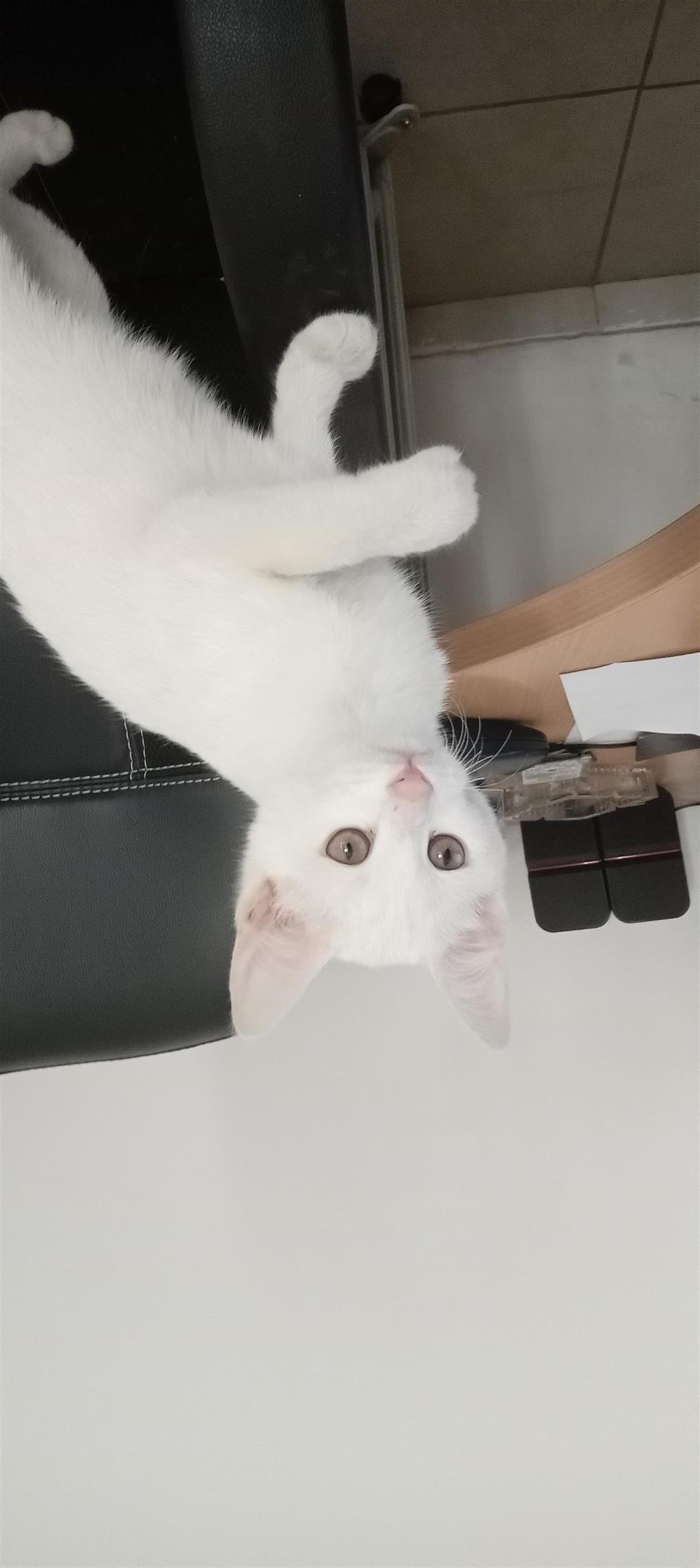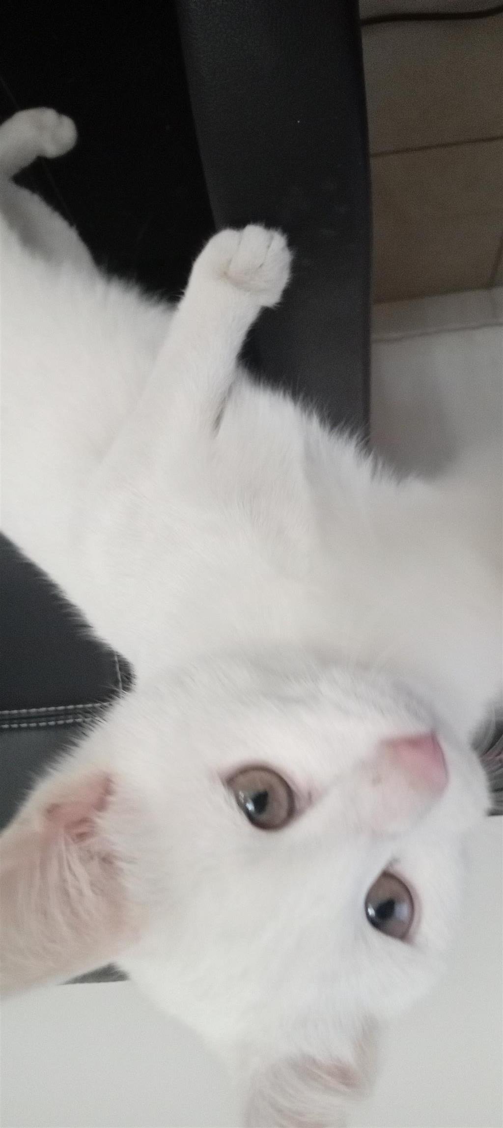 Full white kitten. Born 4 March 2025. Three months old. Very playful. Needs a home. Trained to use cat litter.