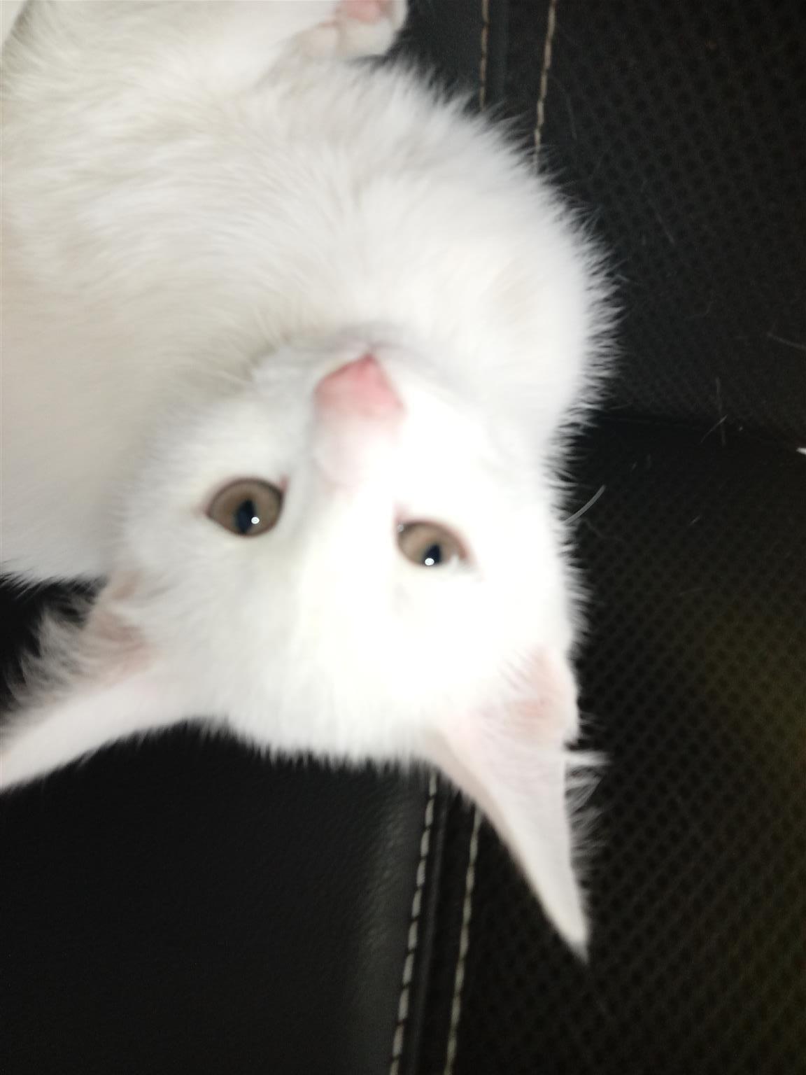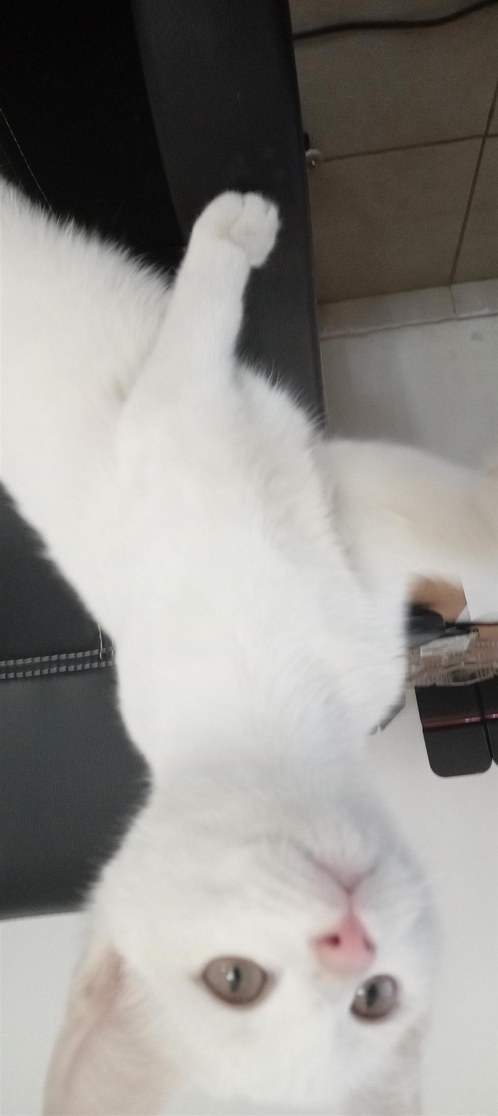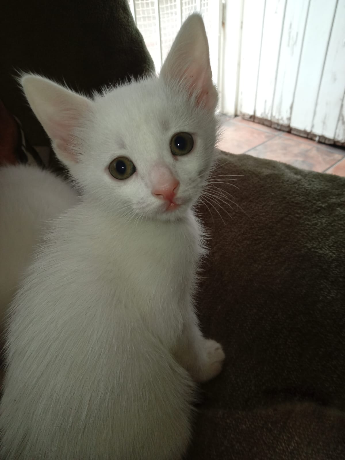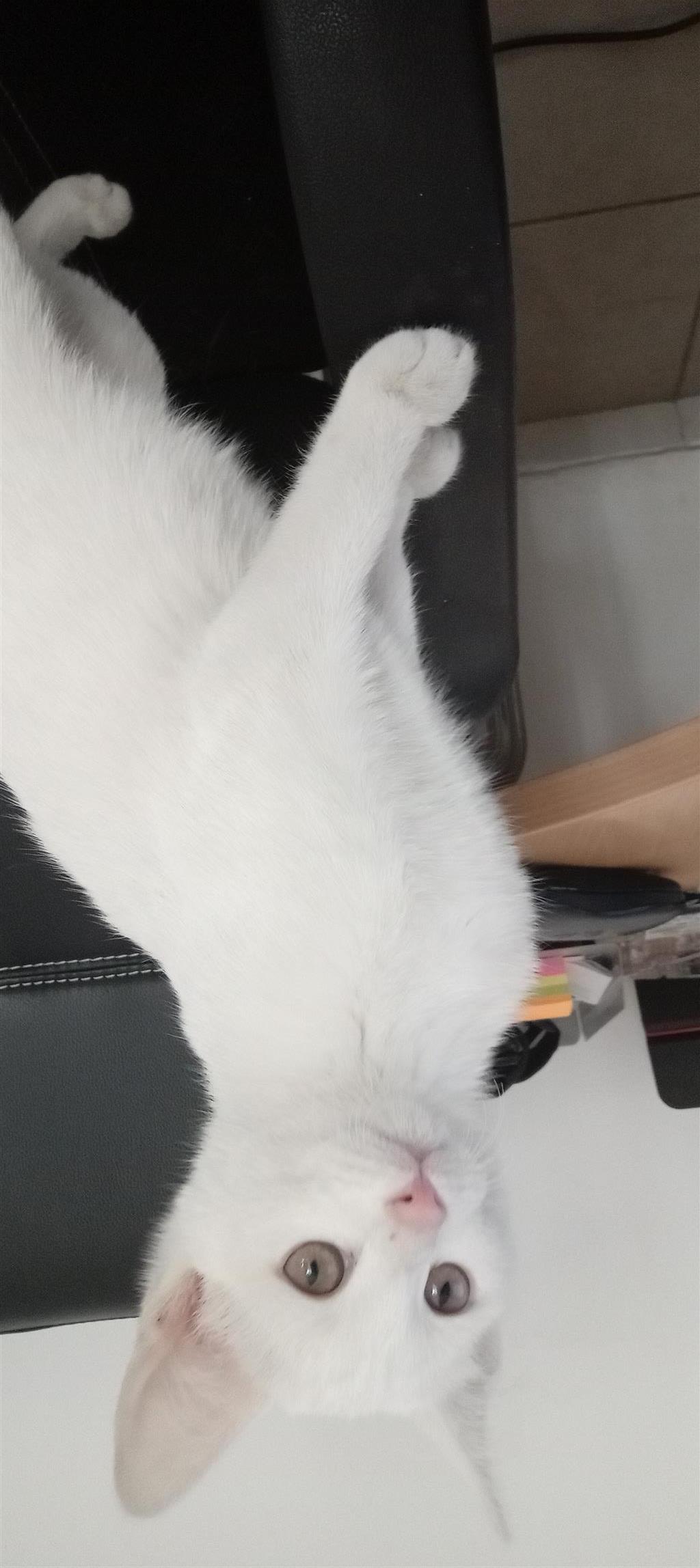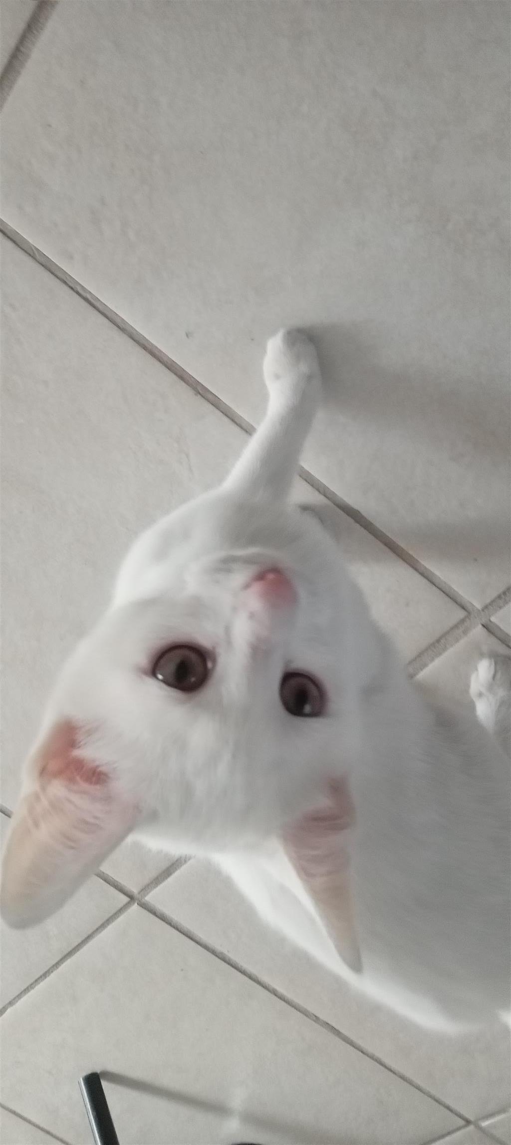 Full white kitten. Born 4 March 2025. Three months old. Very playful. Needs a home. Trained to use cat litter.