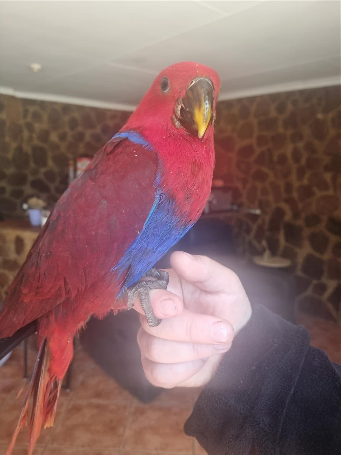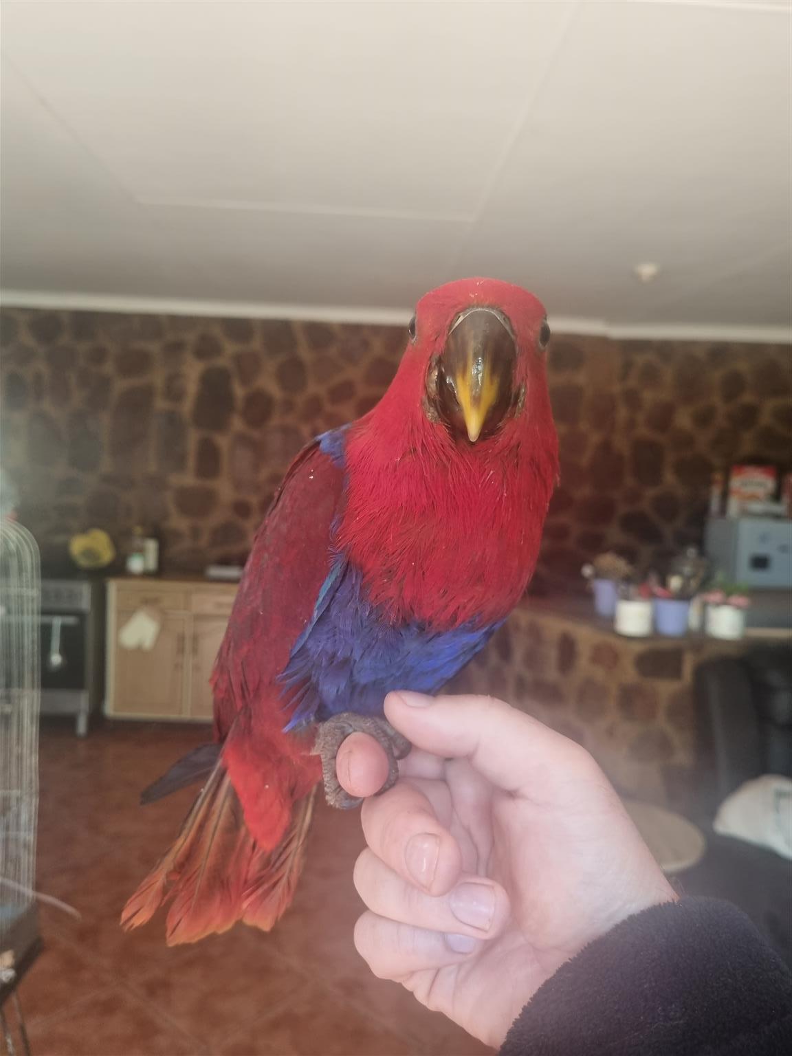 Eclectus female 5months old. Hand tame, eats solids enjoys warm food. Only selling due to her not getting on with our flock of afrcian greys and ringnecks