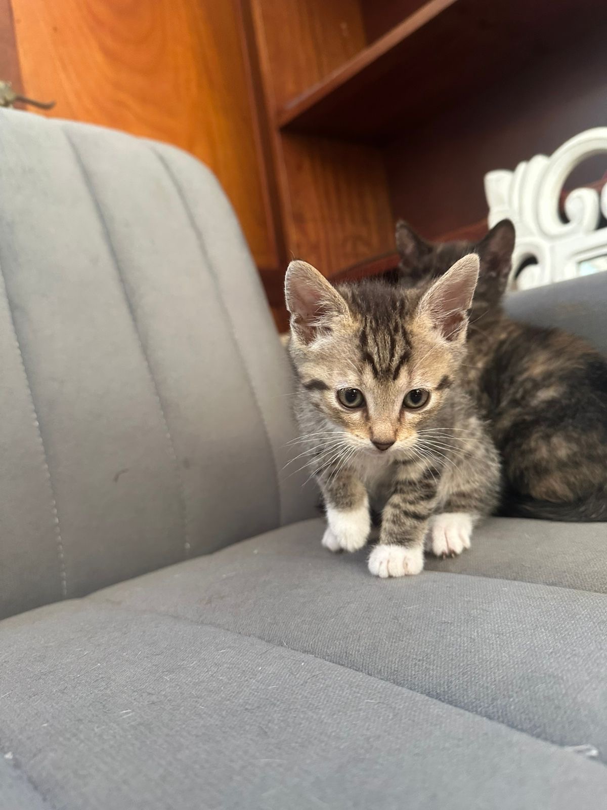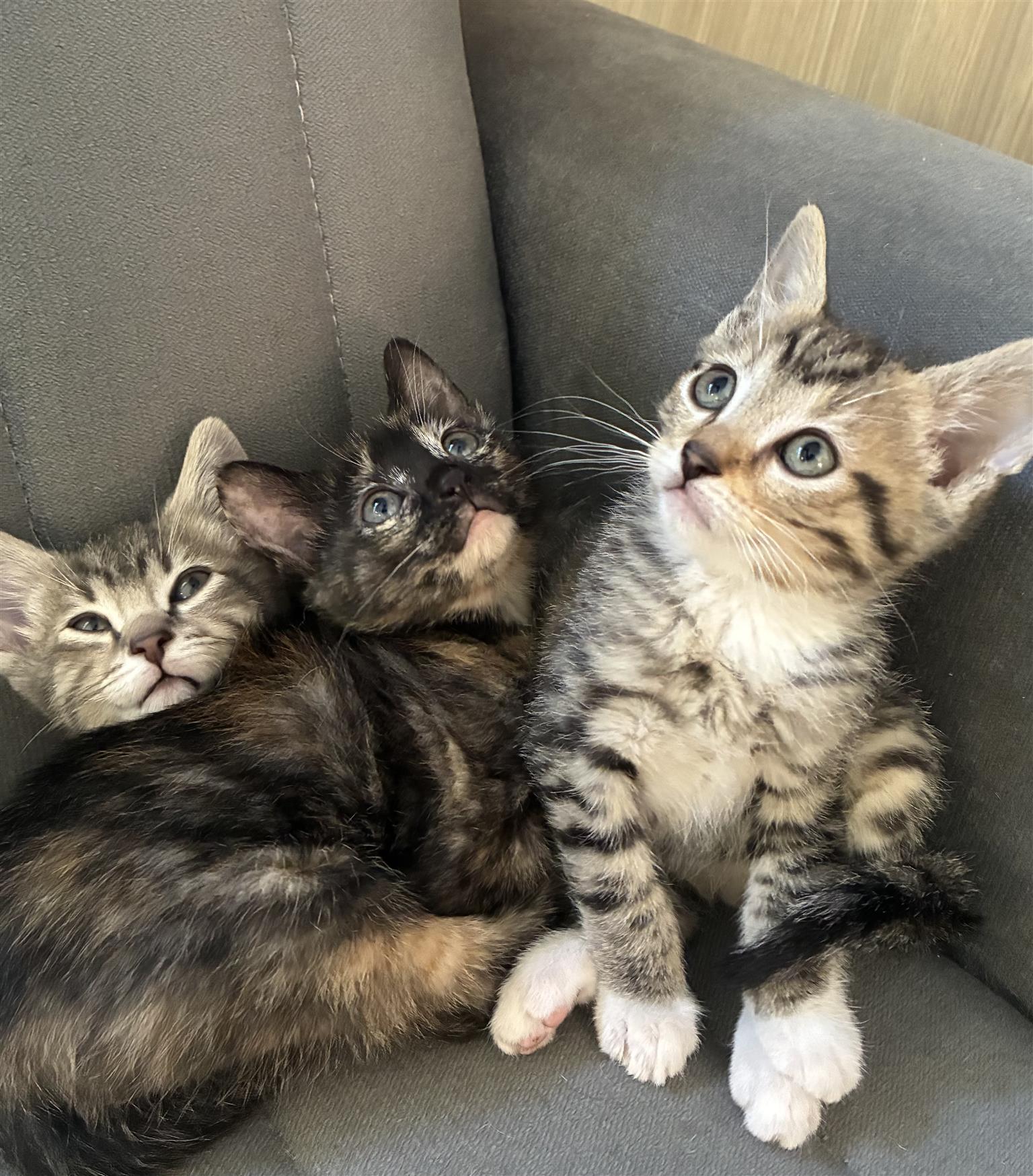 We have 3 curious, loving, playful babies. They are 8 weeks and ready for their forever homes. A Tortoiseshell girl, a Grey Tabby boy(with white socks) and another Grey Tabby boy(with longer hair)
