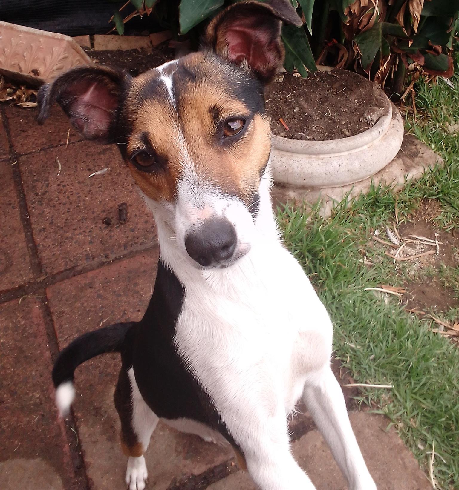 Lovely female long leg Fox terrier. She is 1 year old with a super temperament. Gets on well with all dogs and excellent with kids. House trained vaccinated and dewormed. Good watch dog. Sterilized.