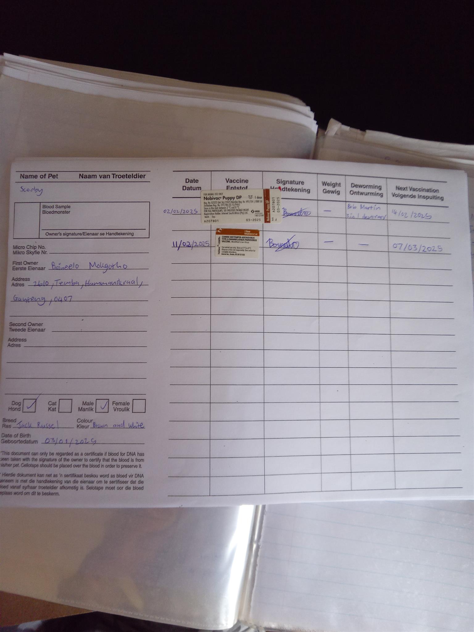 2 Months old Pure bred Jack Russells for sale in Hammanskraal(Pretoria) for R2500 each . They are vaccinated with puppy dp plus for immunity against parvo and also vaccinated with 5 in 1. They are dewormed and ready to go. There are 3 females and 3 males. They are loving and cheeky, they make good pets and will follow you wherever you go. If interested call Andrew 0796931788view more