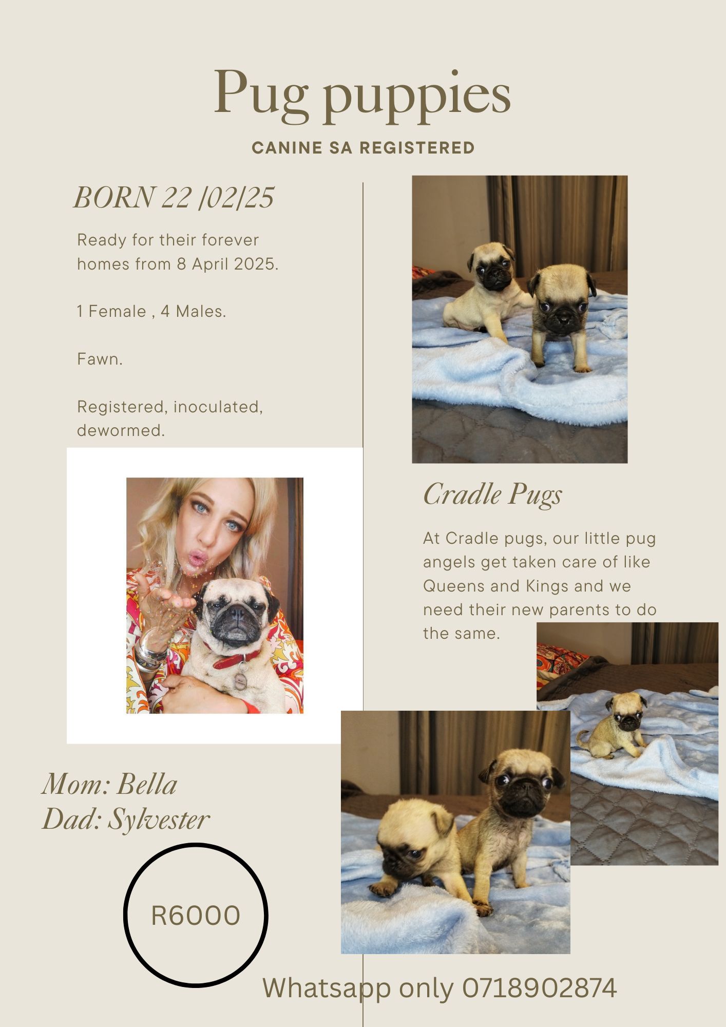 Registered Pug puppies, ready to go on 8 April to approved buyers. One female, 4 males. Fawn.