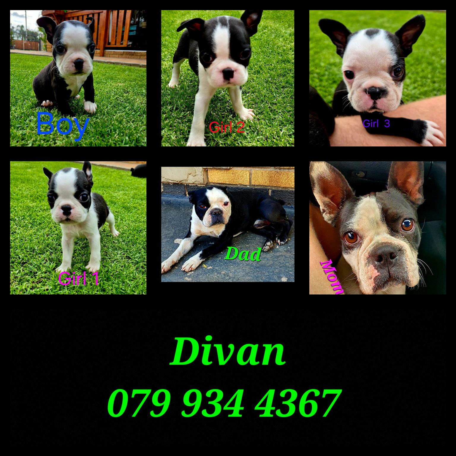 Boston Terrier puppies available for booking they are pure breed and they are vaccinated and Dewormed they are 5 weeks old and will be ready at min age of 8 weeks old. I'm in Springs East Rand can contact me for more info on 079 934 4367view more male R4000 and female R4500