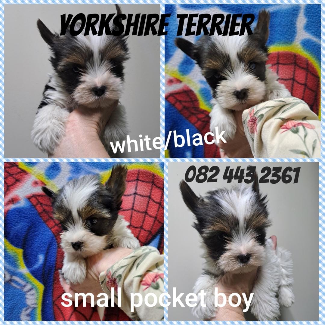 Small pocket yorkie boy. White with black. 8weeks. CanineSA First vacc + corona vacc every 2nd week dewormed. Short leg and short body very small. With small hamper. 082 443 2361view more