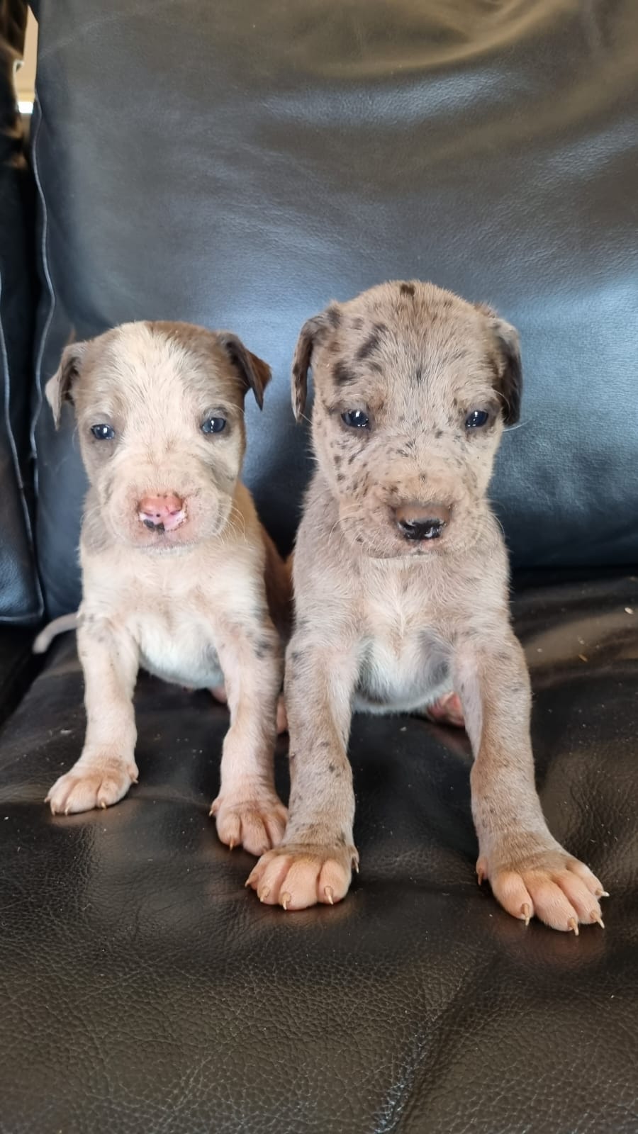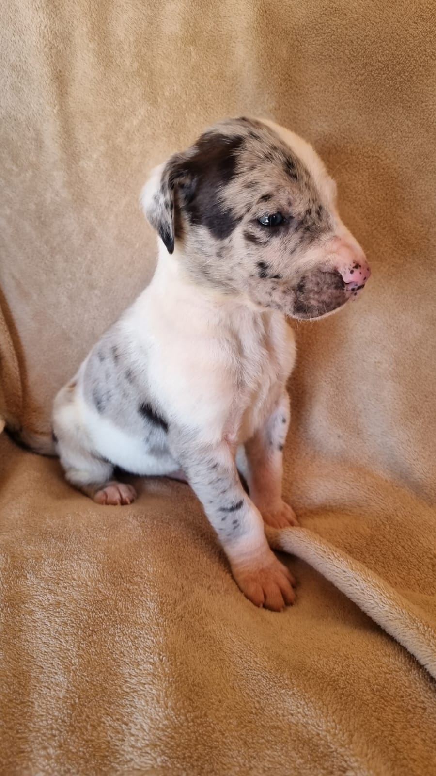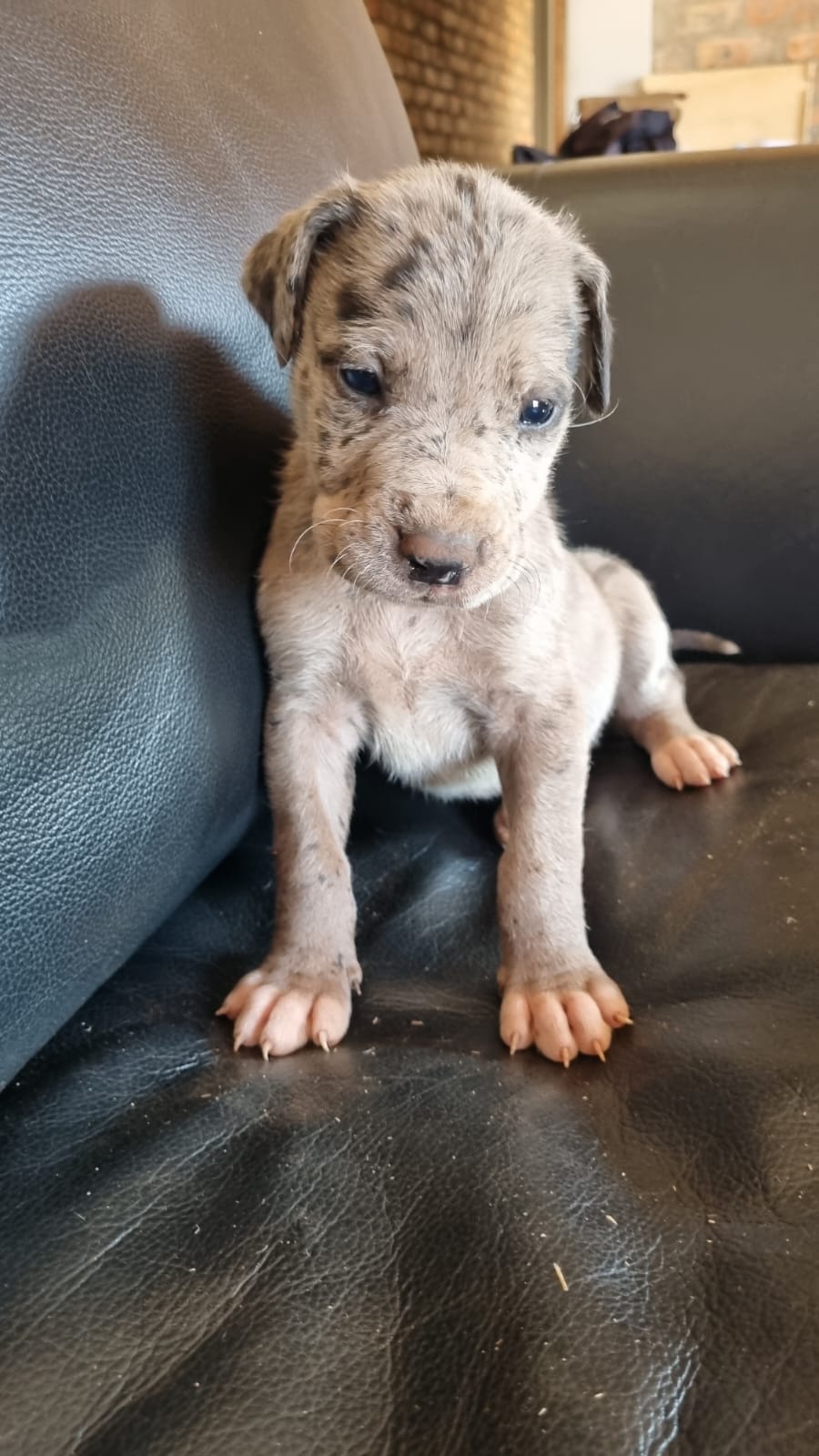 Canine SA registered Great Dane puppies. From Niemandia kennels. Colours: Black, Merle R6000 and Merlequin puppies are R6800. Innocolated and dewormed by Vet. The puppies are 8 weeks of age and ready for there new owners from July. Great Danes are typically good family dogs and do well with children when trained and socialized from an early age. Contact for more information.