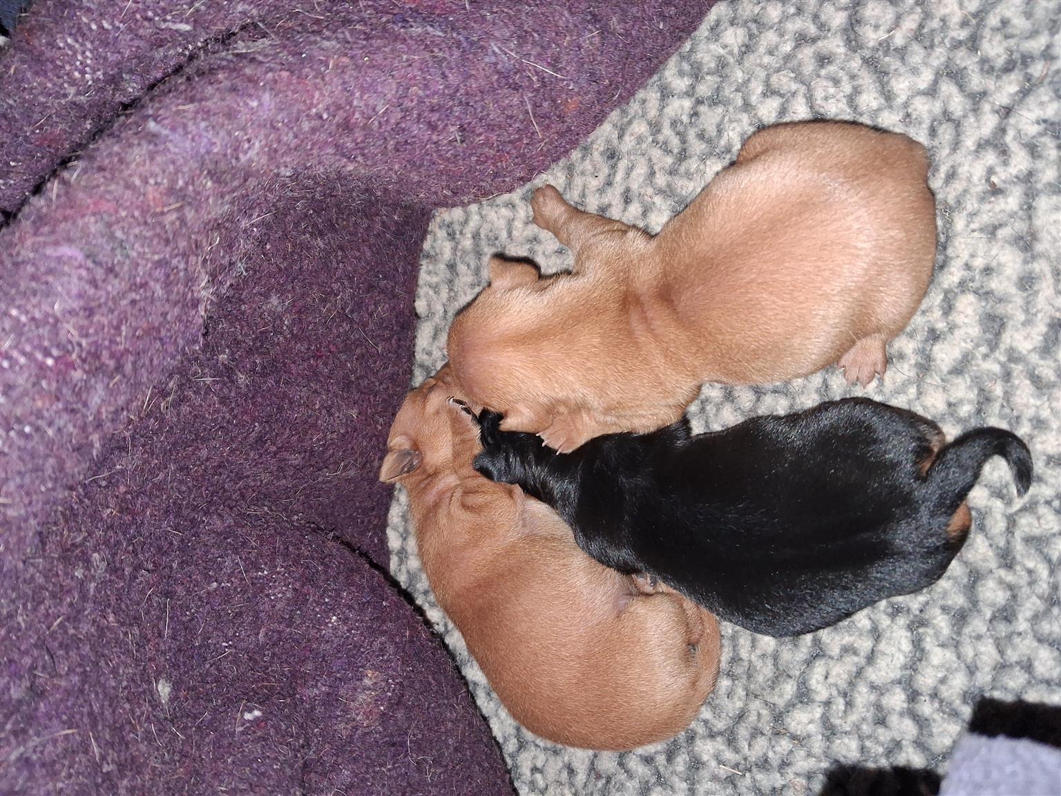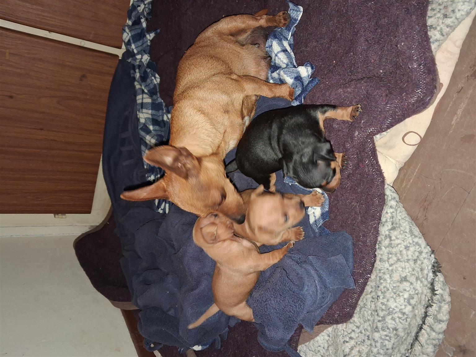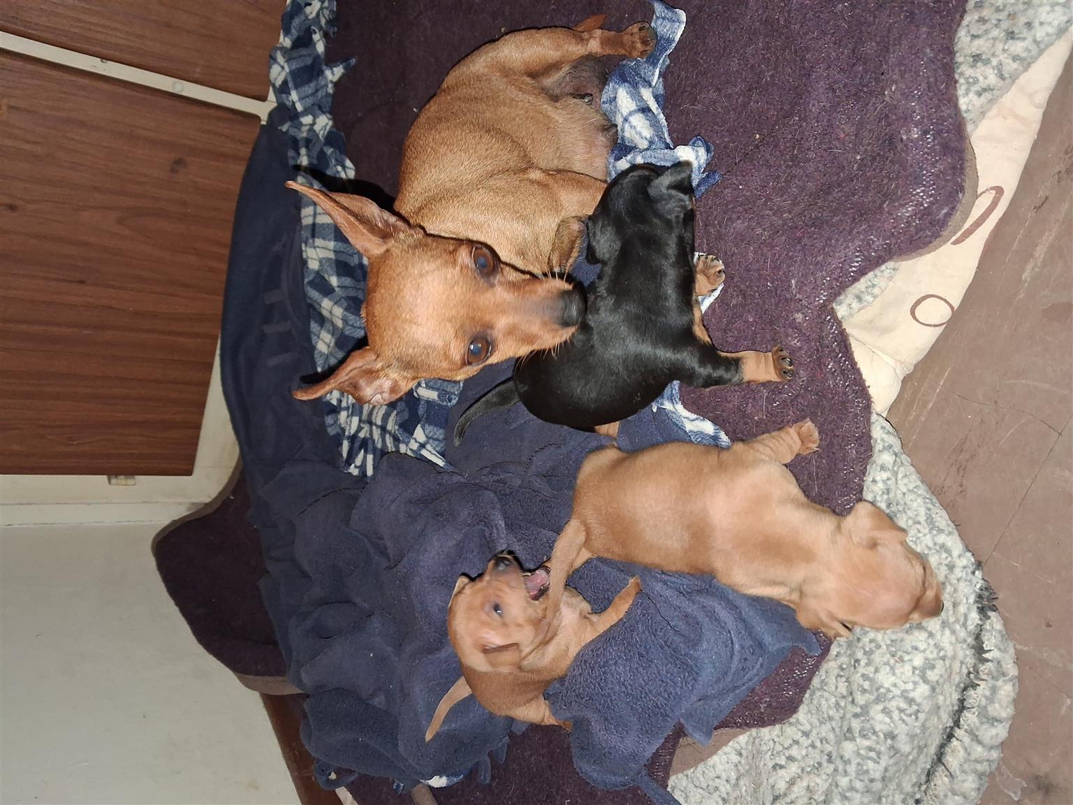 Miniature Doberman pincher puppies for sale (short legs/pincher) The puppies were born on 4 August 2025 and are in a very good and healthy condition. The eyes will open in 2 weeks and They will be hand fed from 4 weeks and will be ready for their new families they are 8 weeks, when they can eat and drink on their own. (Early September - mid September ).The mom and dad of the puppies are in a very healthy condition. We have 3 puppies:- 1 x red/tan male puppy R2500 1 x red/tan female puppy R3000 1 x black/tan female puppy R3000 Please contact for more info on the Pincher Miniature Doberman breed or for more pics 067 349 0184view more or for viewing we are situated in Witbank Mpumalanga.