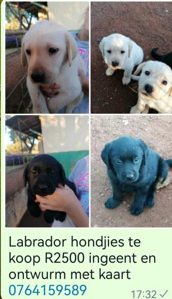Pure bred labradors for sale. Born 30 March. Vaccination and deworming included. Mom is chocolate Labrador and dad was white labrador. Price is R2500 Contact person Maritsa 0764159589view more
