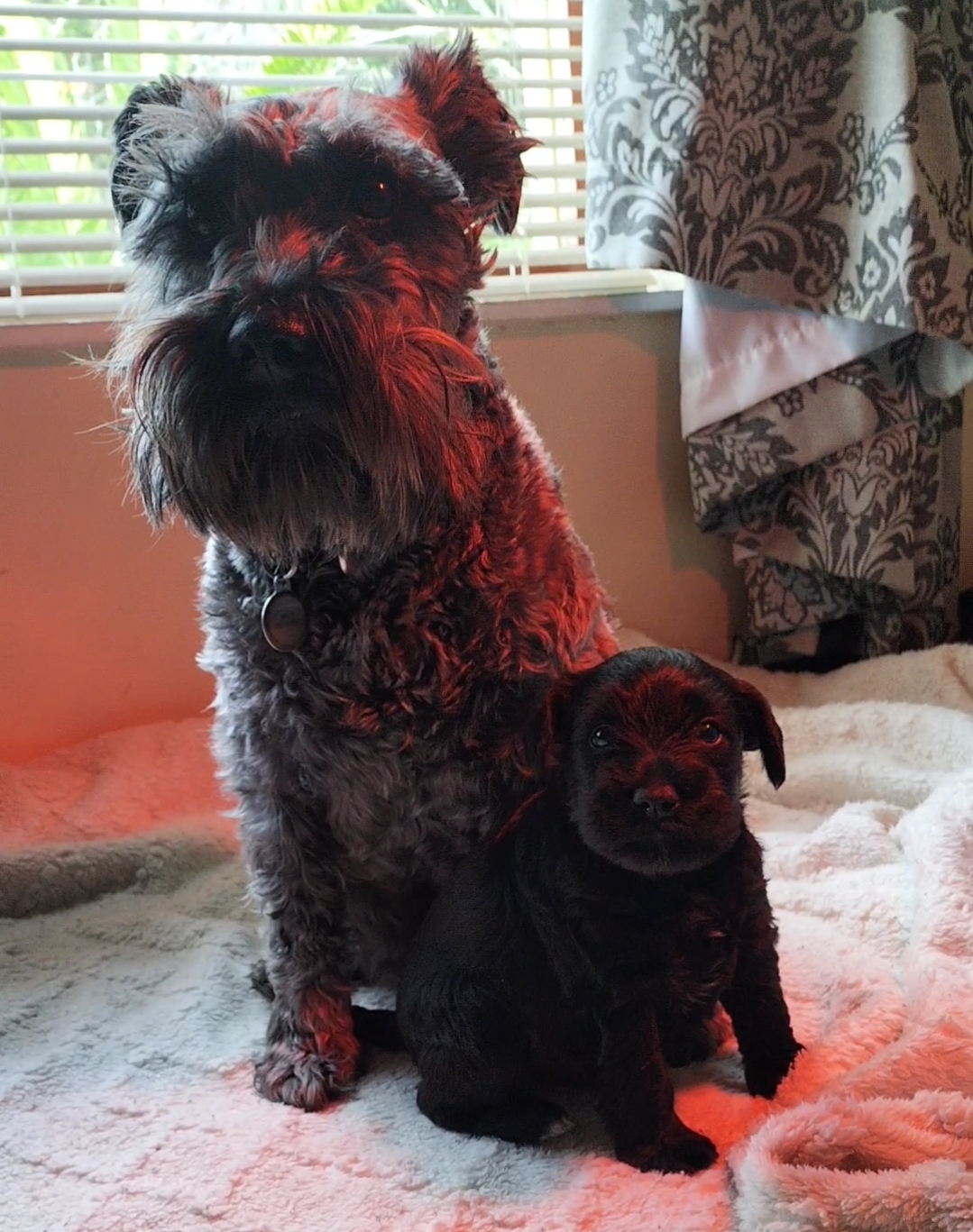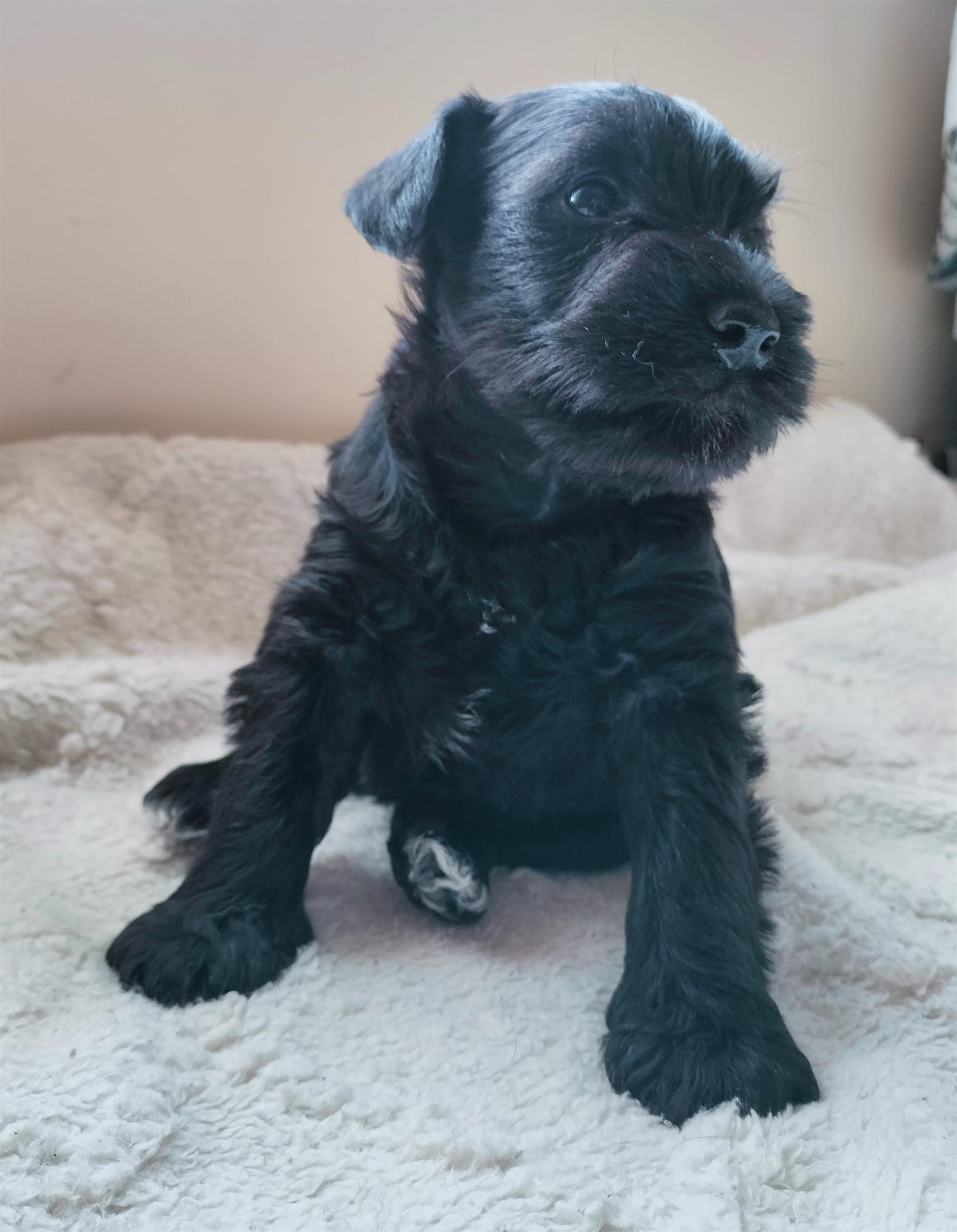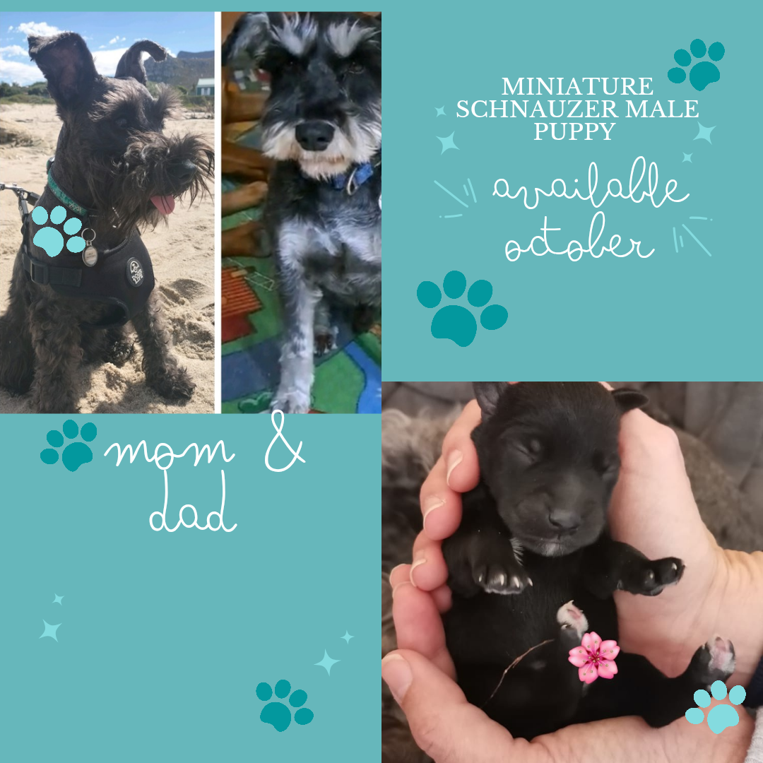 Pure bred male miniature schnauzer. He will be available on 23 October when he is 8 weeks old. He was born on 28 August.