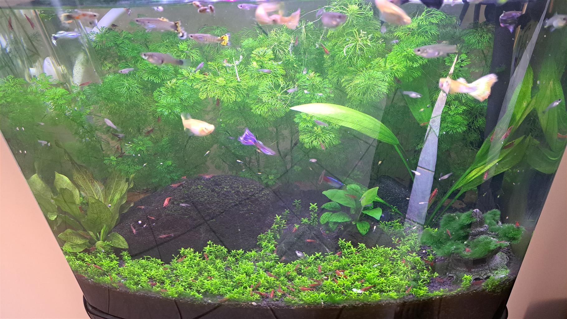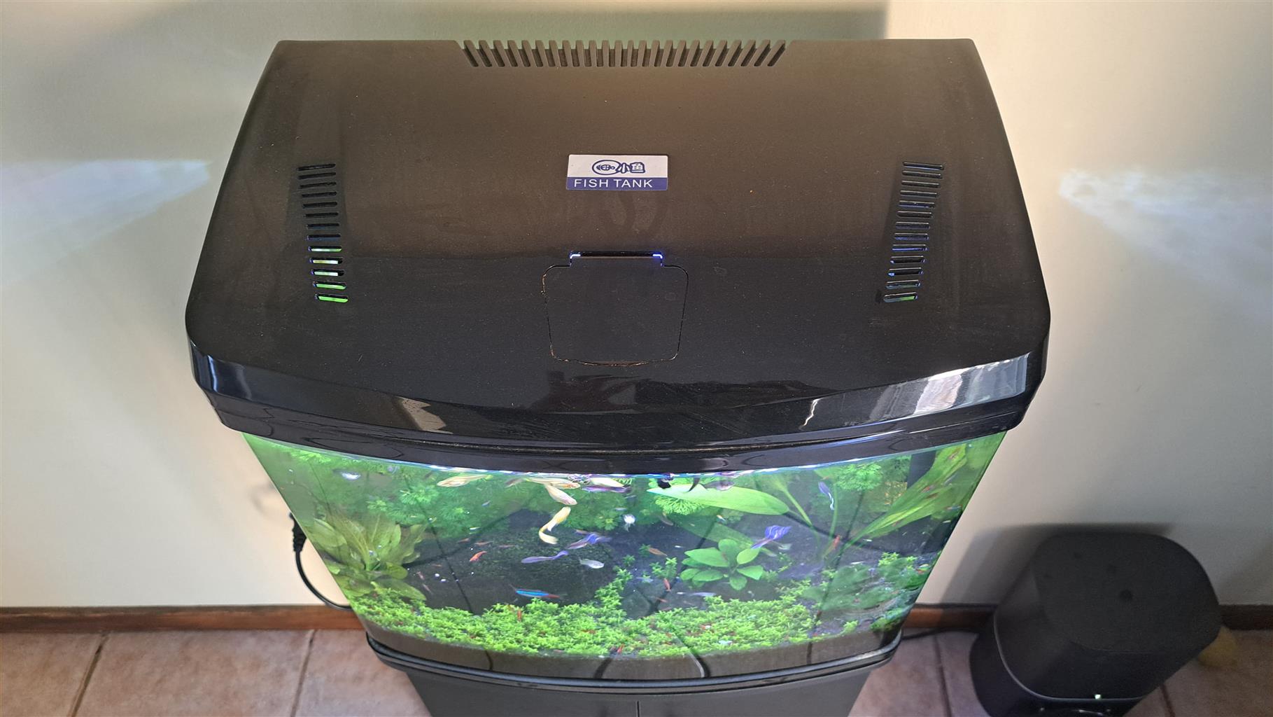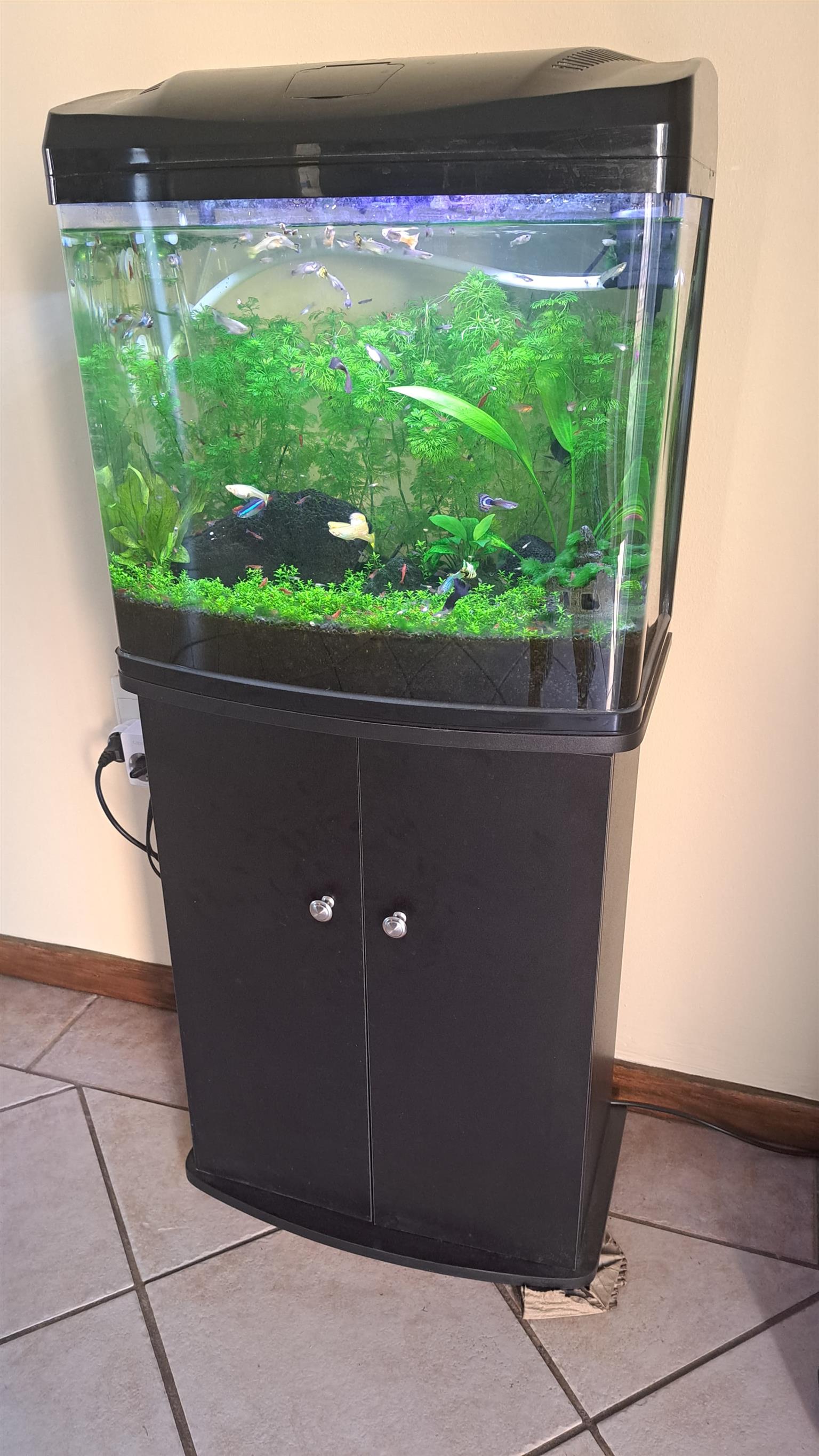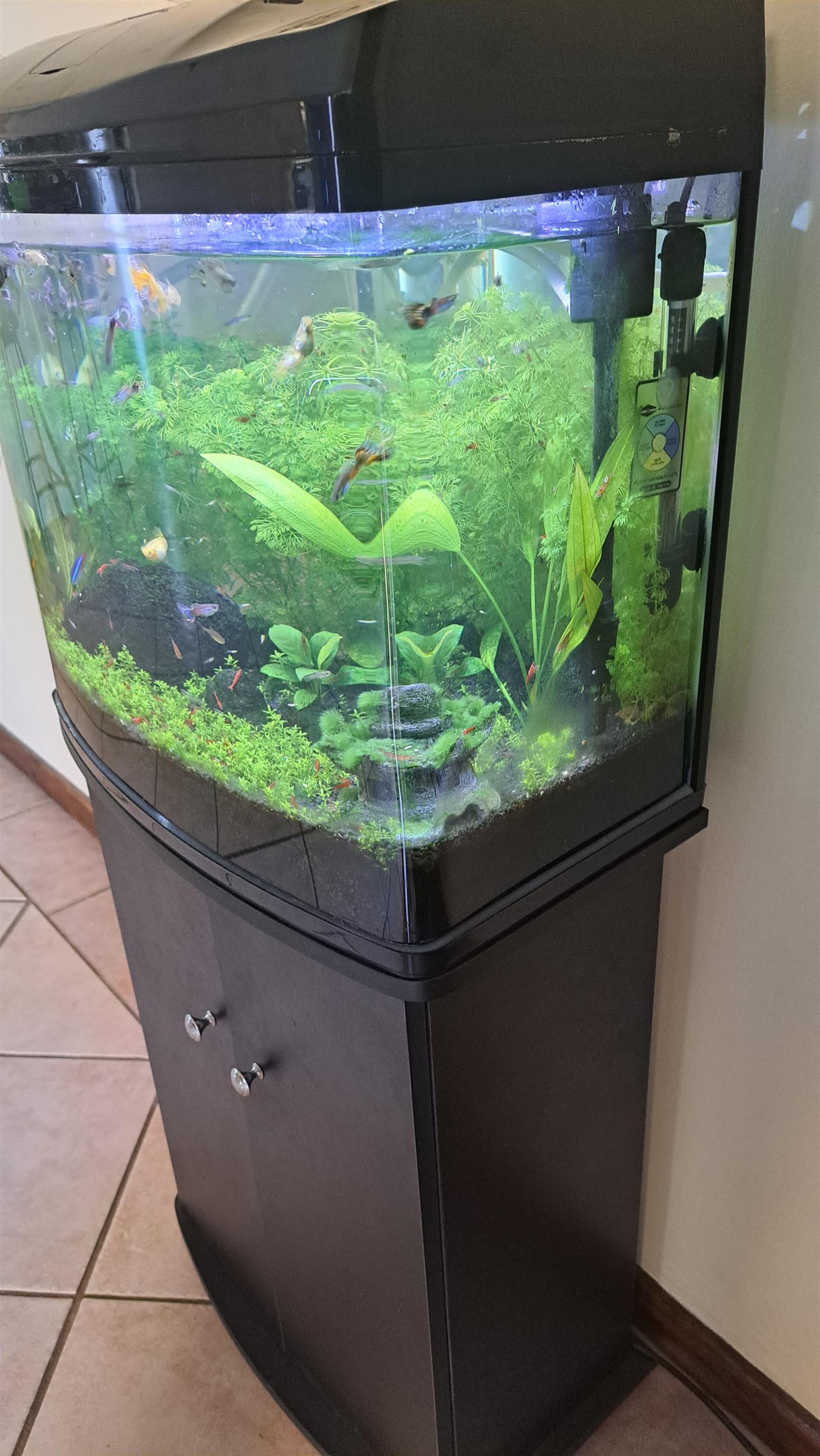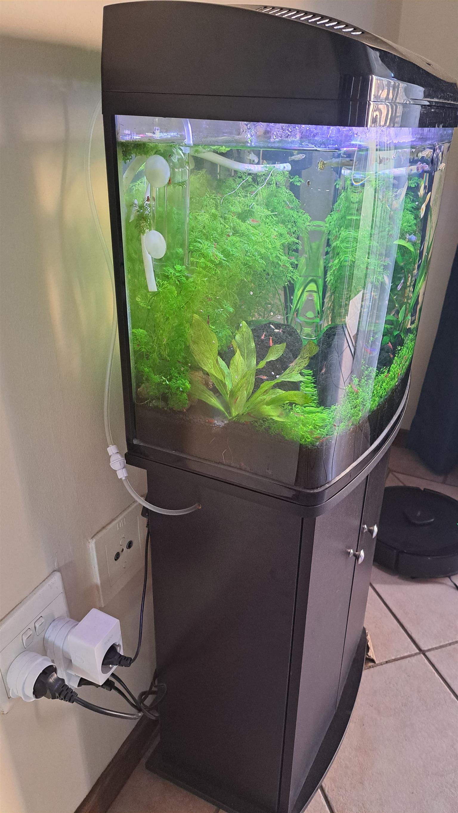 The setup includes a medium-sized curved fish tank with stand (approximately 30L), a submerged heater, a CO2 system with disposable CO2 canister, and a built-in waterfall filter, pump, and light.