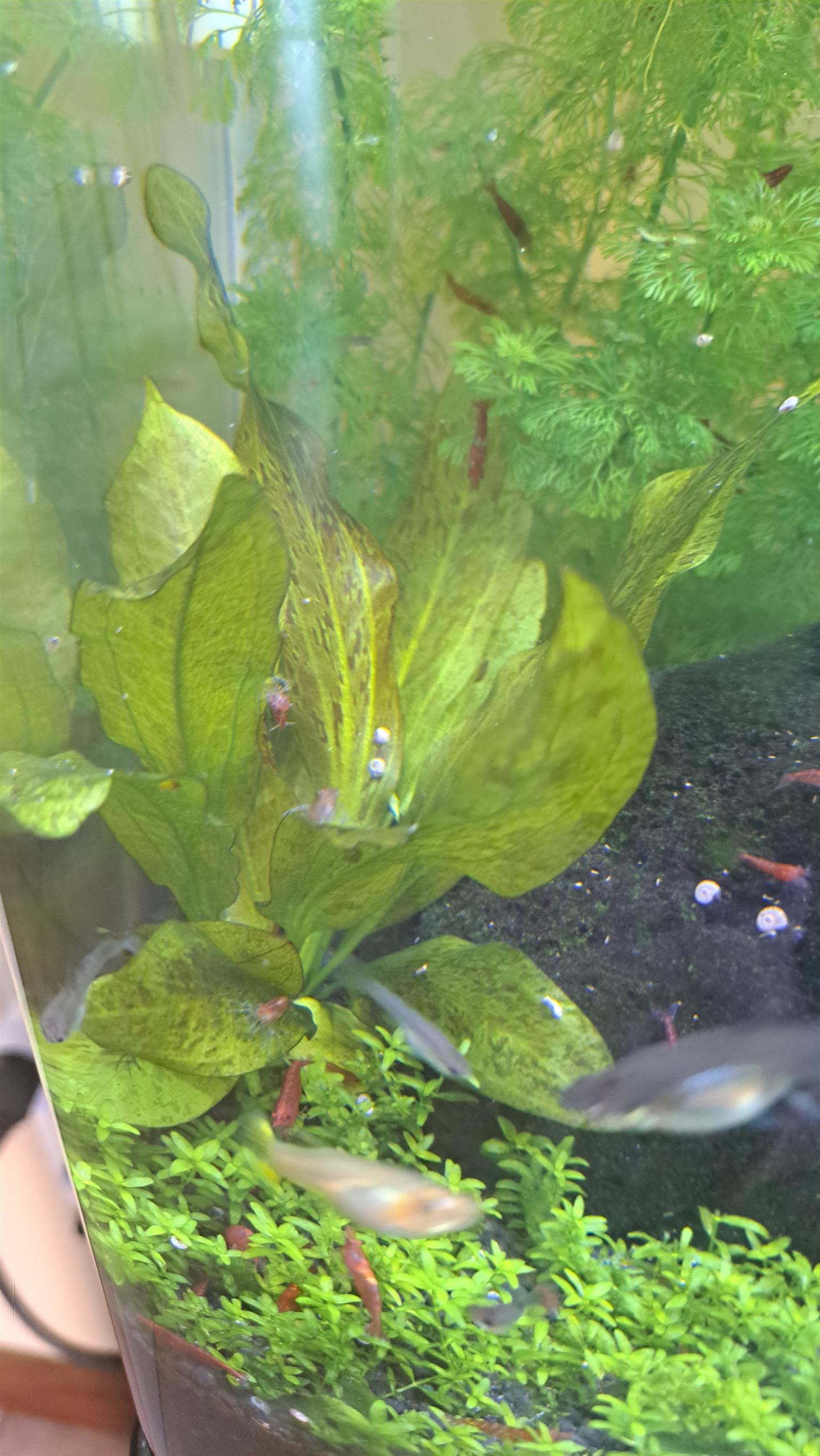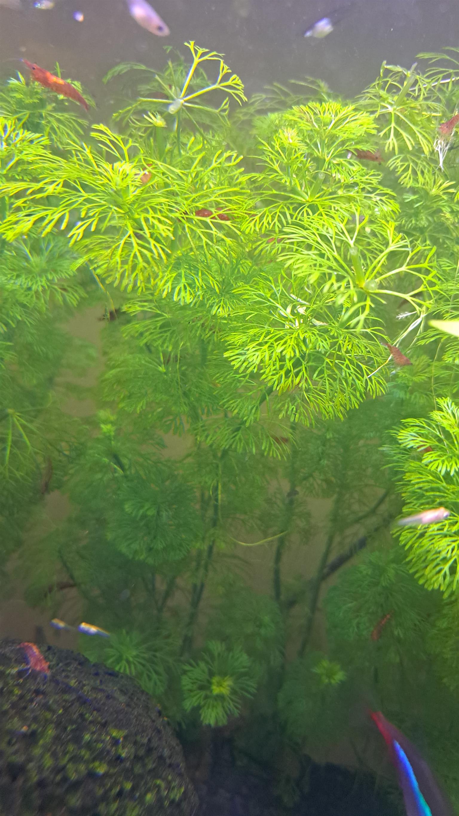 The tank is decorated with live plants including pearlweed, Amazon sword, anubias, hornwort, and ozelot, as well as black lava rocks and a Japanese house ornament.