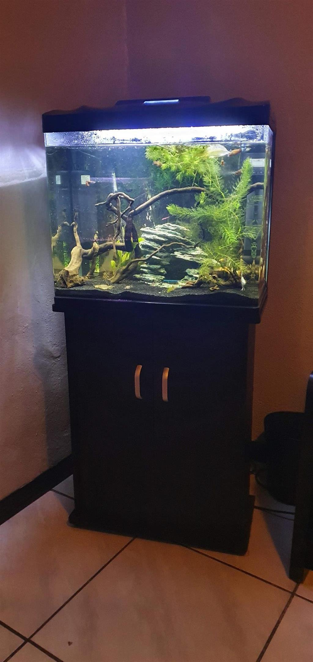 66L Sunsun fish tank with all the extras such as extra black sand, rock, medicine, food, air pumps, breeding box, etc. Filter not working, but easily replaceable. No longer interested in the hobby. Collection only. Fish not included.
