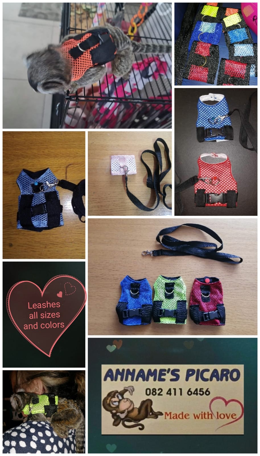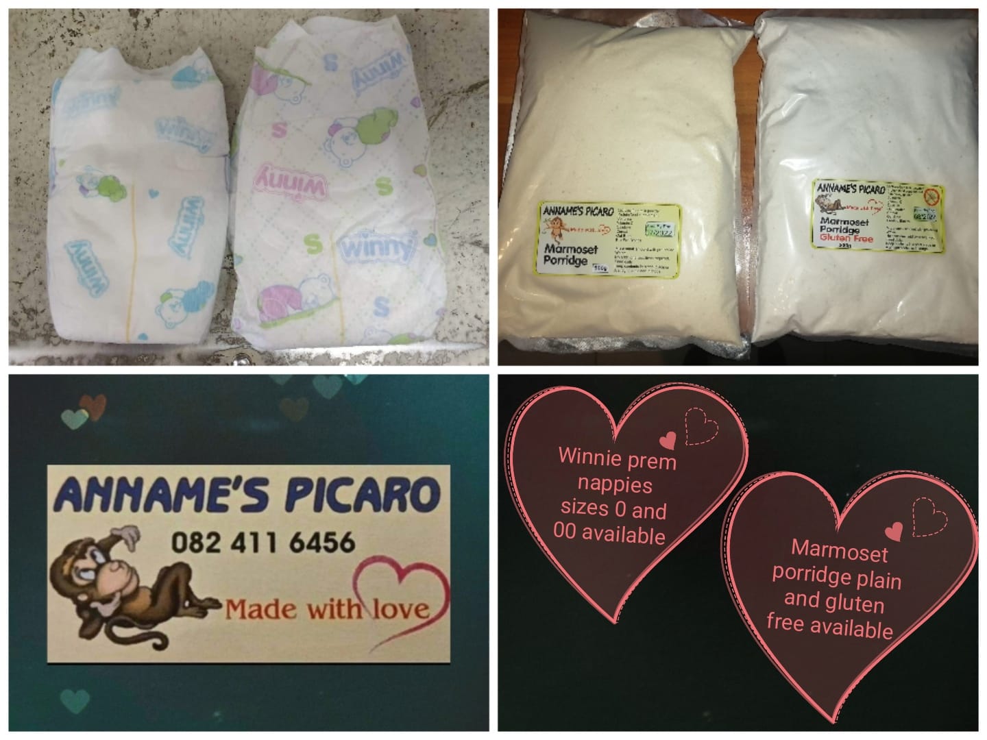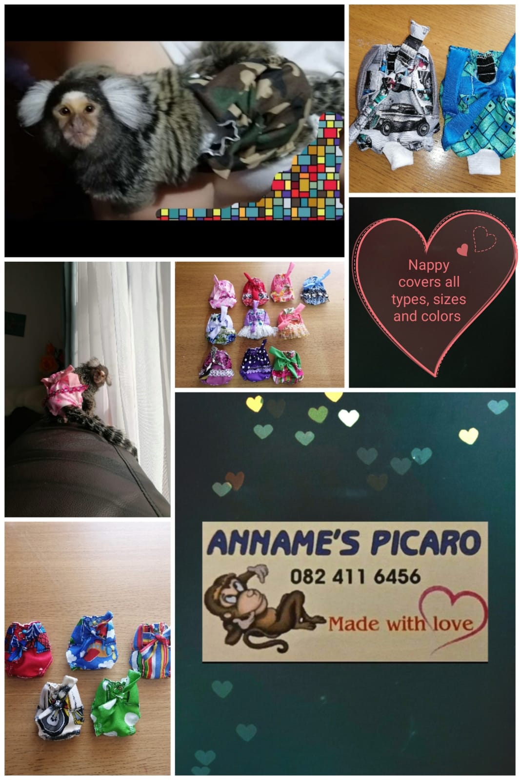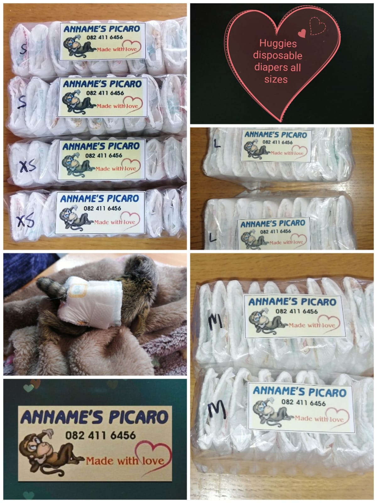 Huggies nappies, washable nappies, clothing, full body leashes, cage accessories, starter packs and special formulated porridge for your monkey children