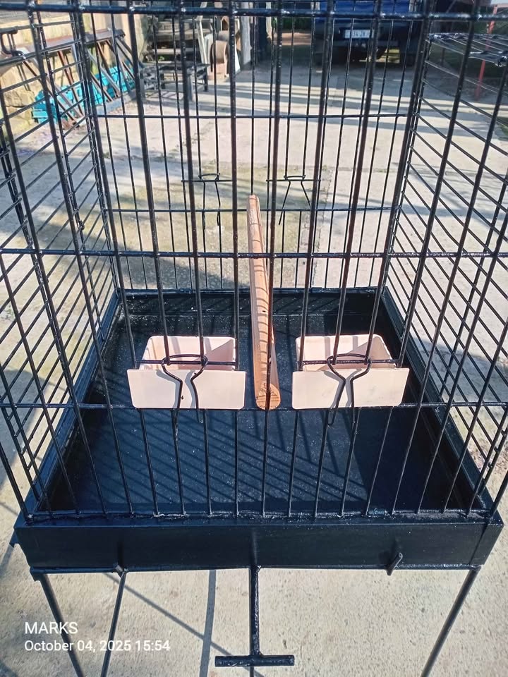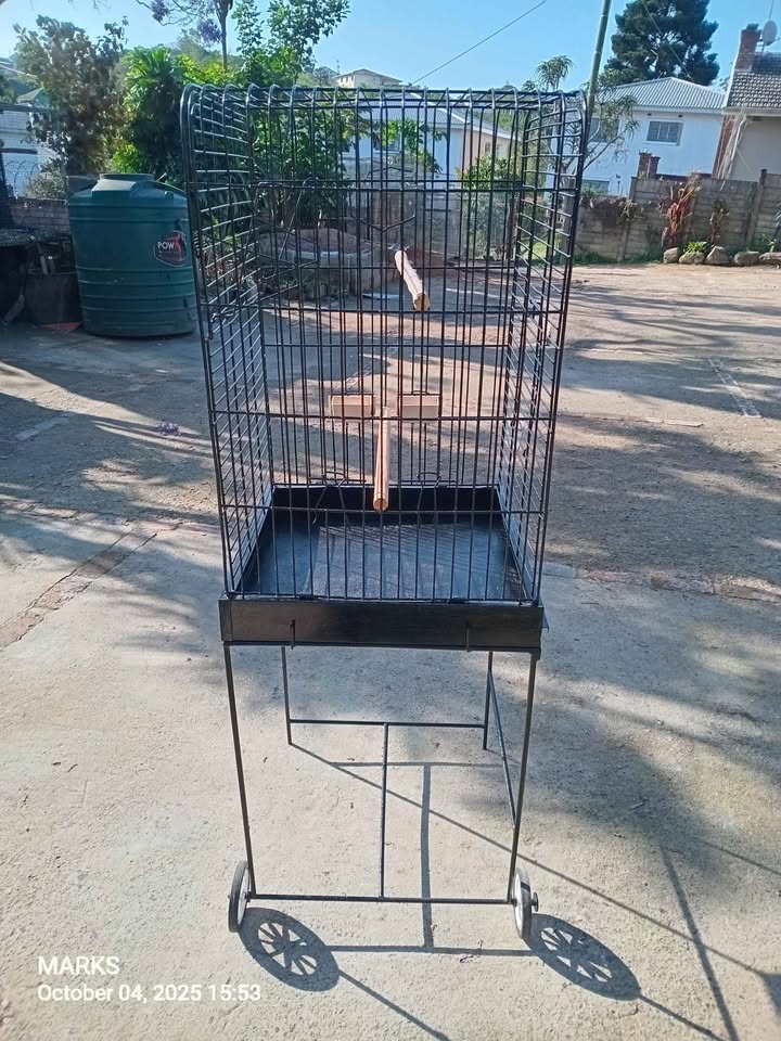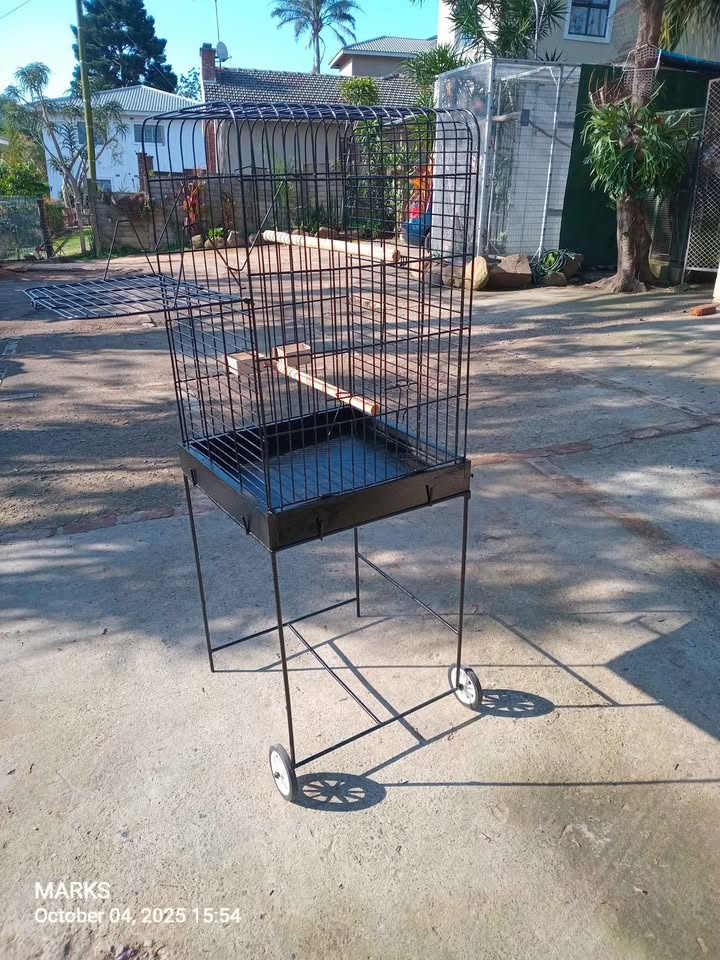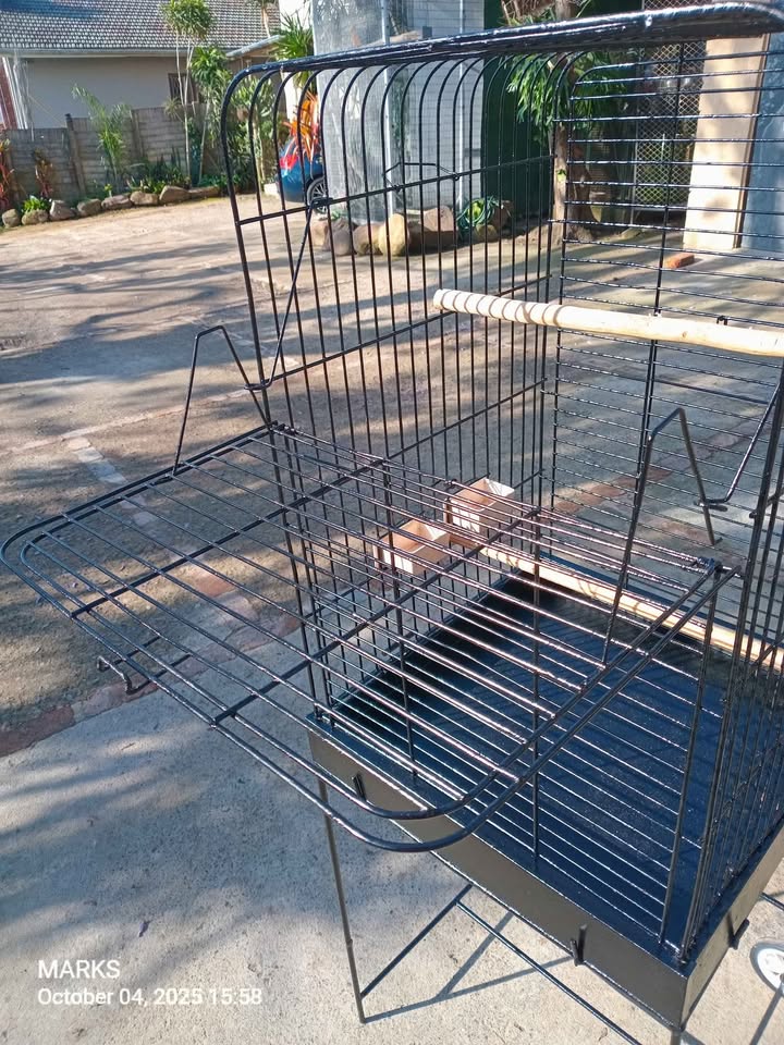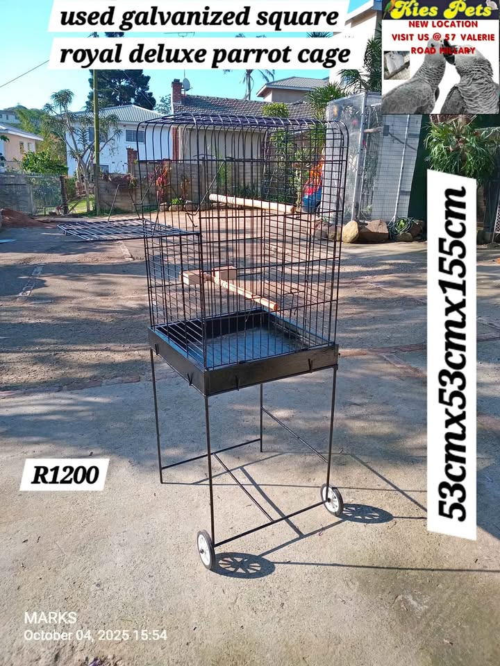 Galvanized square cage in excellent condition . Comes complete with 2 feeding bowls 2 perches A removable tray and a stand . The cage has a large gate that hangs to create a play area for the bird . The cage is used but in good condition for only R1200 Contact if interested or visit 57 valerie road memorial park hillary at Kies pets