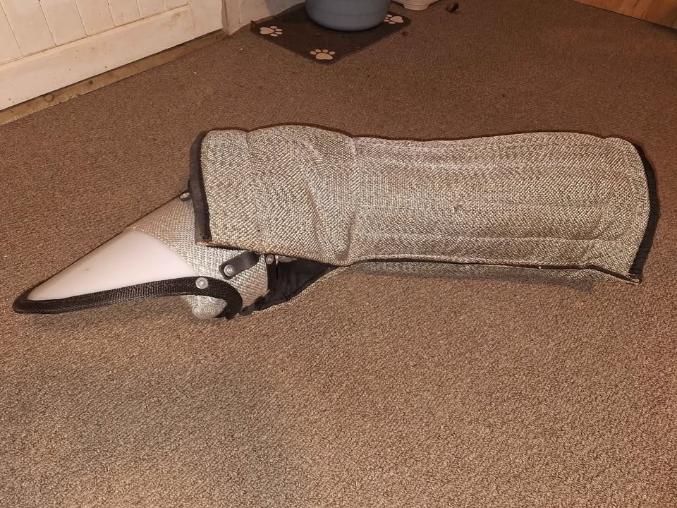 Hardly been used. sleeve itself been used once. cover been used not more than 10 times, pretty much brand new, just has some dirty marks on the cover here and there. left hand arm, comes as the arm, a cover and a leather trap holding them both together. Bite arm was bought new from SADTC. No longer need the sleeve, is in very good condition. R2300. Based in KZN midlands, Rosetta. PM Katie on for more info.