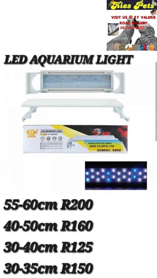 LED Aquarium Light, designed to enhance the environment for both fish and aquatic plants. FeatIt combines LED lights to simulate natural daylight and moonlight, promoting healthy plant growth and intensifying the colors of fish and aquarium decor. The light typically comes in a clip-on or hanging stylewith an arc-angle shell design for concentrated light and reduced glare. These lights are suitable for freshwater aquariums and are designed to create optimal conditions for fish and aquatic plants and are energy-efficient, offering bright illumination while minimizing power consumption. Different sizes available at 57 valerie road memorial park hillary at Kies pets. Also available on google maps