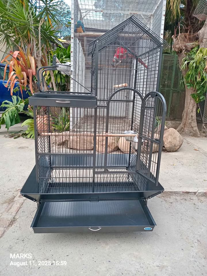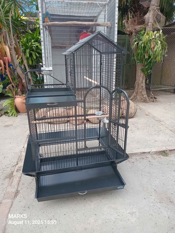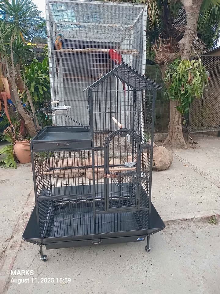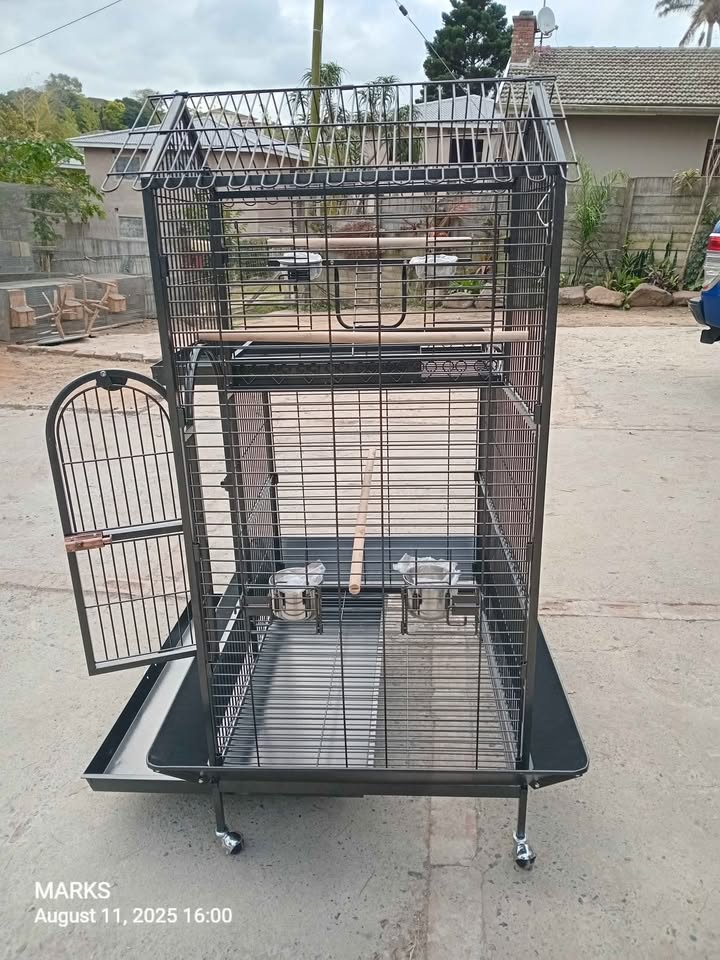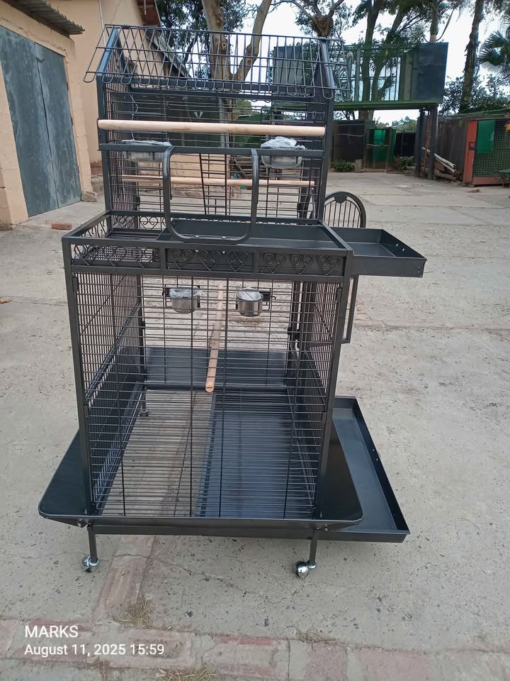 Brand new fancy parrot cage available at 57 valerie road memorial park hillary. Big cage ideal for big birds .comes with spacious internal with 2 stainless steel feeding bowls ,2 internal perches,a removable tray and seed shield . It has an outer play ground with its well designed perch stand ,2 feeding bowls and a removable tray . Equiped with 4 wheels for easy movement. Best cage on the market . Contact us or visit us any day from 8am till 5pm , is my number . Dimensions :114cmx91cmx160cm
