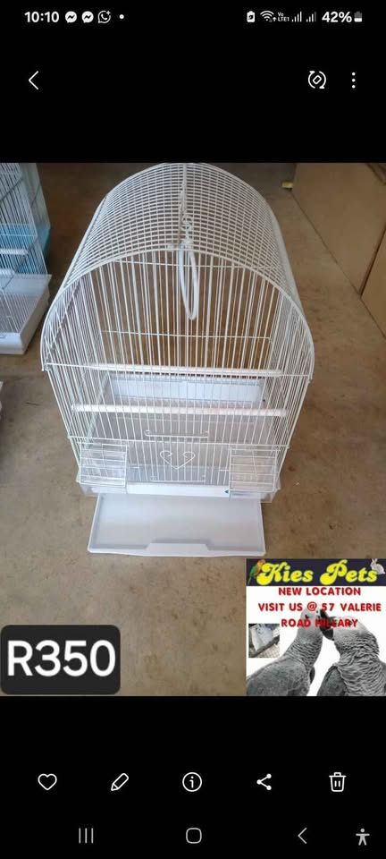 All sizes bird cages available at 57 valerie road memorial park hillary at Kies Pets. From the smallest budgies,finch and canary to the biggest bird . Brand new and used cages all available. Visit us or send us a whatsapp message on if interested