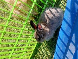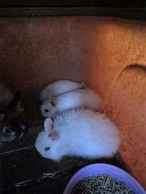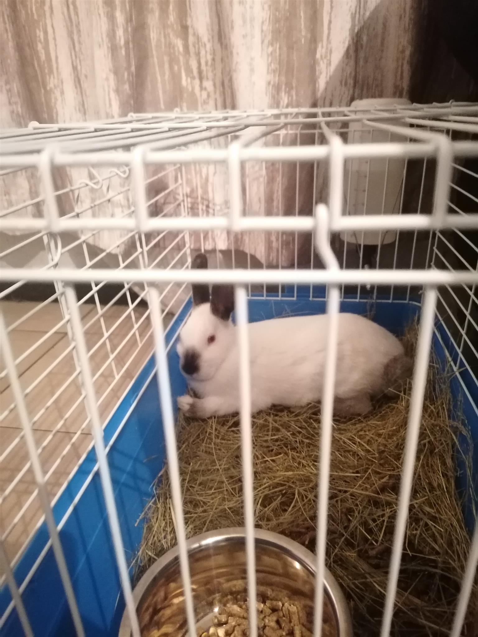 Healthy White male rabbit for sale (red eyes grey ears, feet and tail) comes with starter pack (cage to the value of R800, vitamins, steel bowl and water bottle)