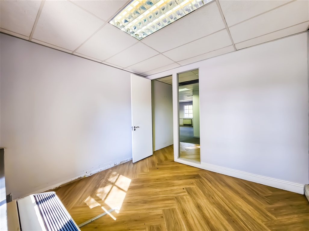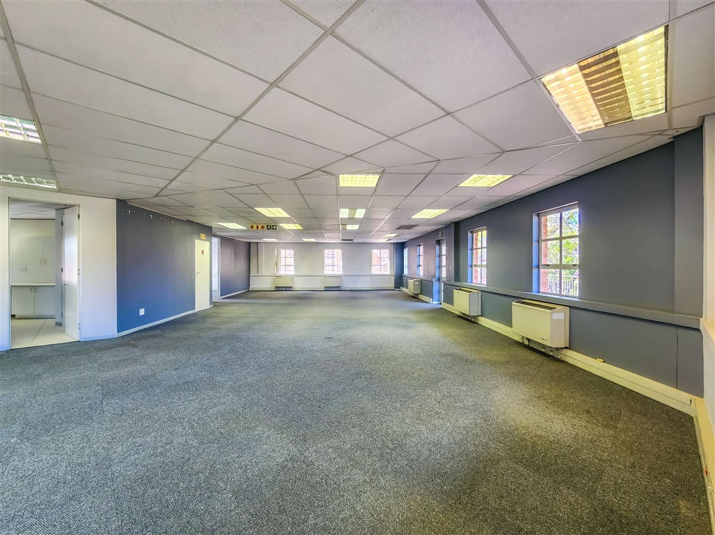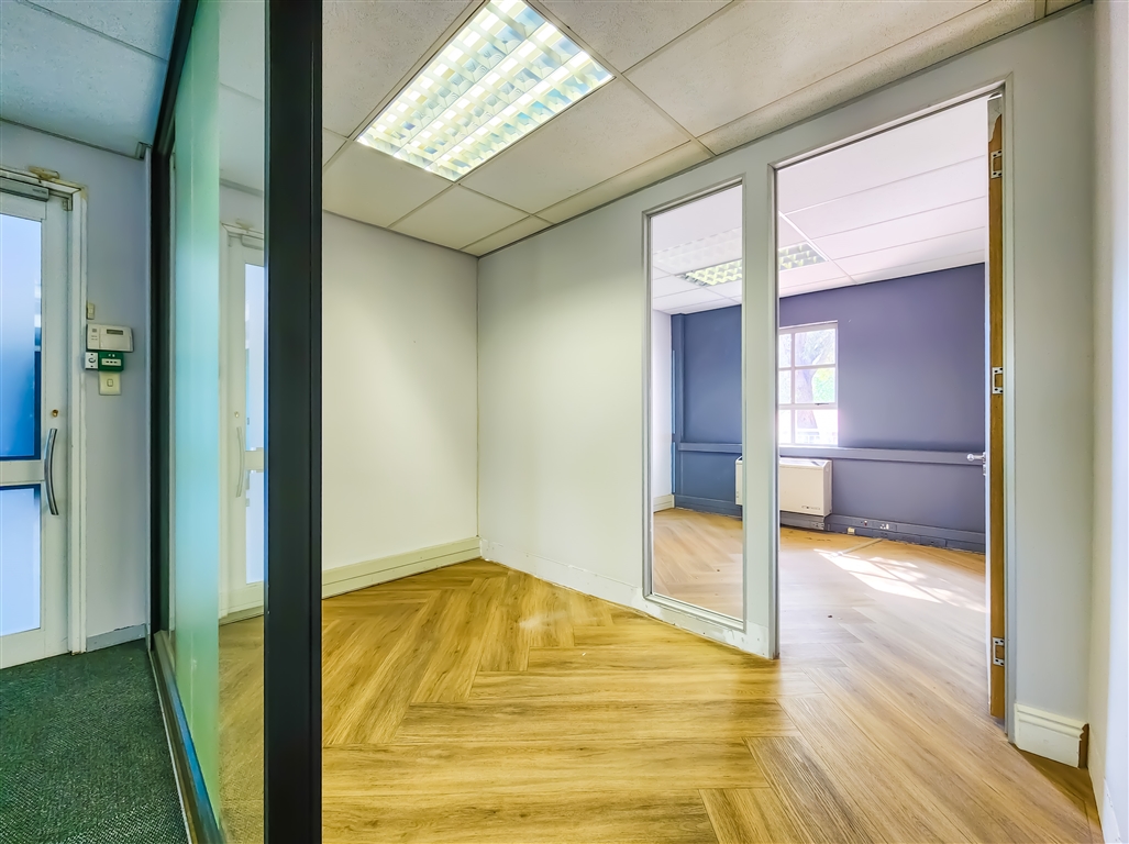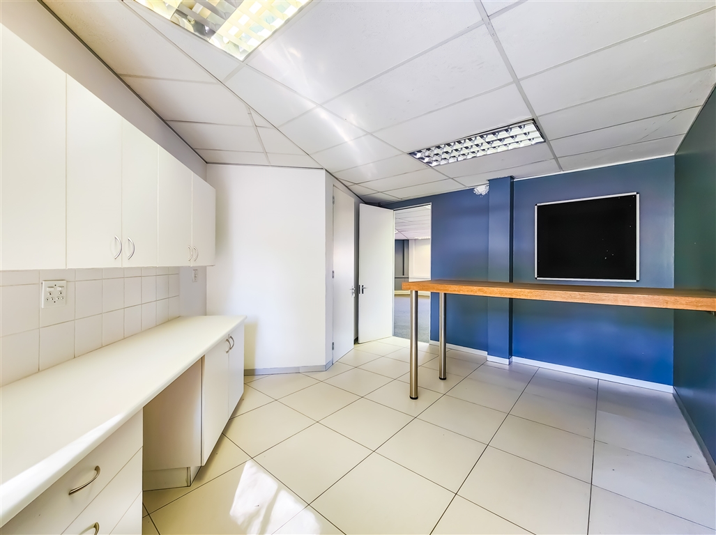 This ground-floor office to let in the prestigious Fourways Golf Park, offers a welcoming workspace in a serene setting. As you enter, you are greeted by a contemporary reception area leading to a storeroom and a spacious open-plan office, complete with direct access to a shared patio overlooking the lush golf course. The office layout includes a private, fully fitted kitchen and two generously sized individual offices, ensuring both functionality and privacy.