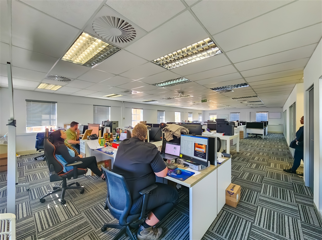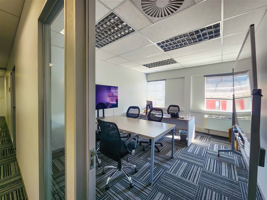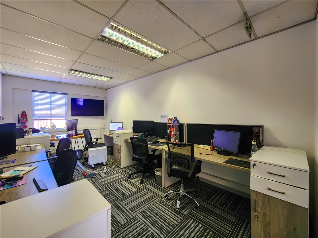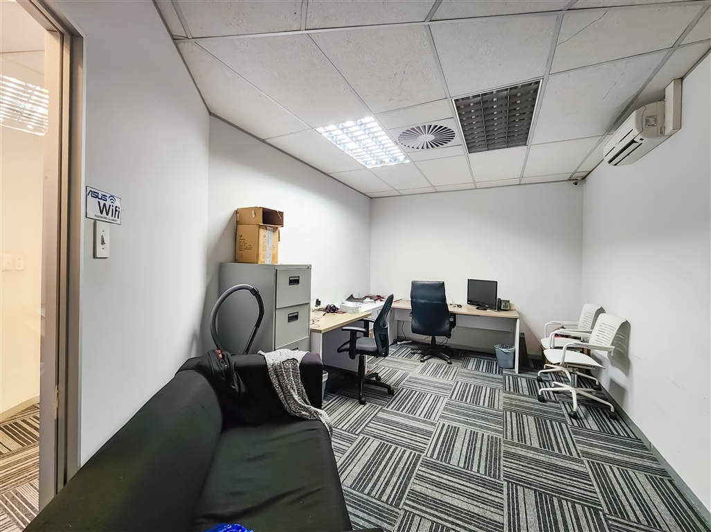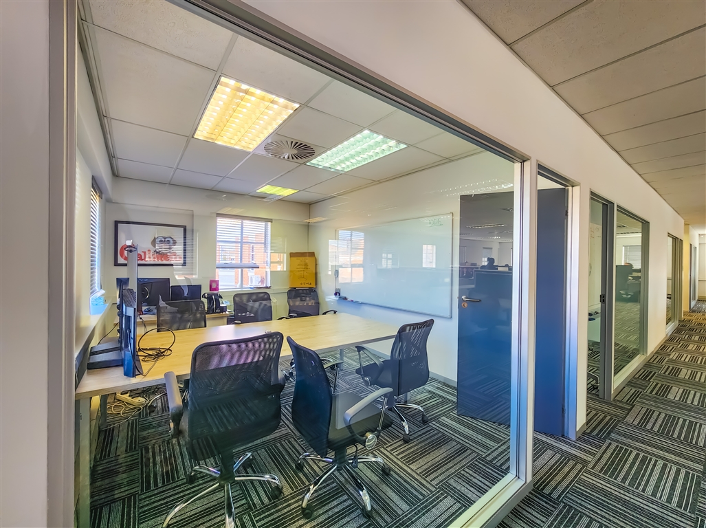 This affordable office to let in Fourways Golf Park offers a modern, functional layout designed for both professionalism and comfort. The office space opens with a stylish reception area, providing direct access to a generously sized storeroom. A passage leads you to a spacious kitchen with room for seating, a contemporary boardroom, and several private offices. Toward the rear, the layout transitions into an open-plan office complemented by four additional private offices overlooking the shared workspace. Featuring a combination of carpet and vinyl flooring, the premises are fully air-conditioned and filled with natural light, creating an inviting and productive working environment.