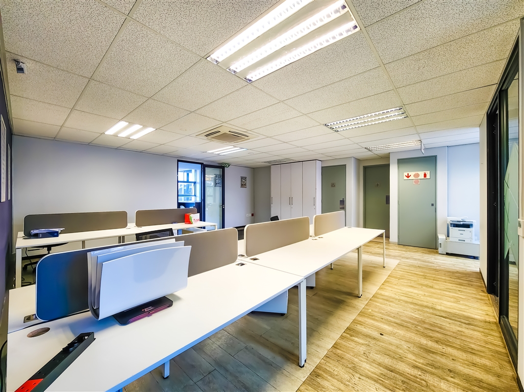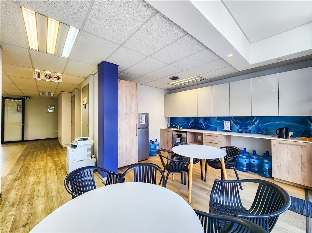 The office combines functionality with a polished, modern aesthetic— vinyl flooring and modern black aluminum accents, ideal for a professional working environment. This modern office available to rent offers a welcoming reception area that flows seamlessly into a spacious open-plan workspace accommodating up to 12 desks. Toward the rear, you’ll find two private offices and a generously sized kitchen, all of which enjoy direct access to a shared balcony—perfect for fresh air breaks or informal gatherings. The office further has access to private dedicated ladies and gents restrooms.