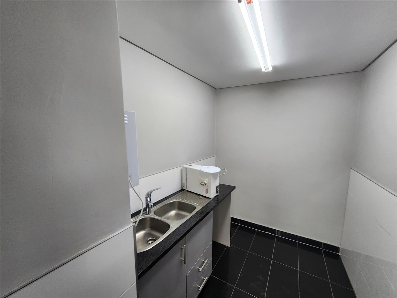 The space is whiteboxed and has a kitchenette