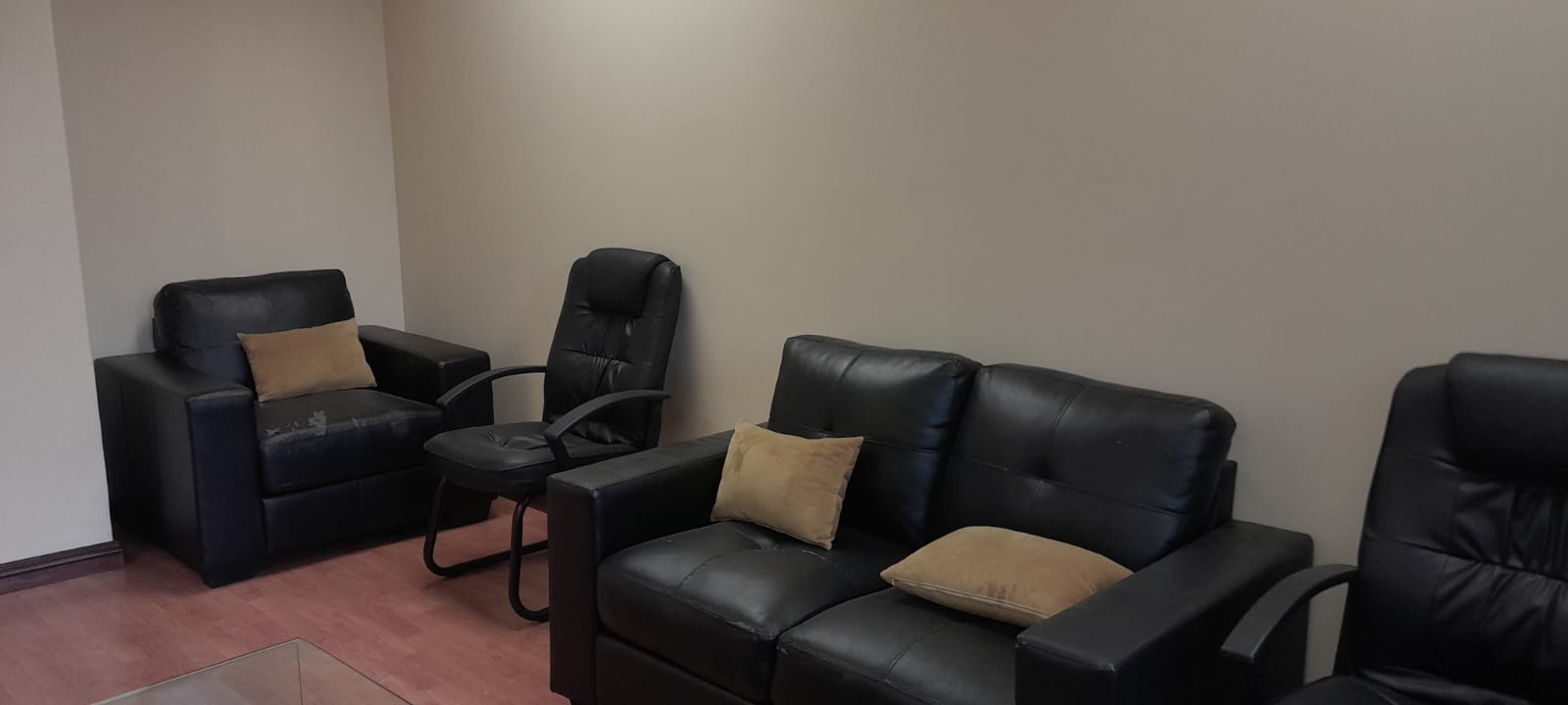 Enhancing the suite's appeal is a comfortable meeting lounge room, ideal for informal discussions and networking. The reception area is elegantly designed with downlights and full glass panel doors, creating an impressive first impression for visitors. Off-laminated flooring and modern office lighting throughout the suite contribute to a sleek and polished environment.