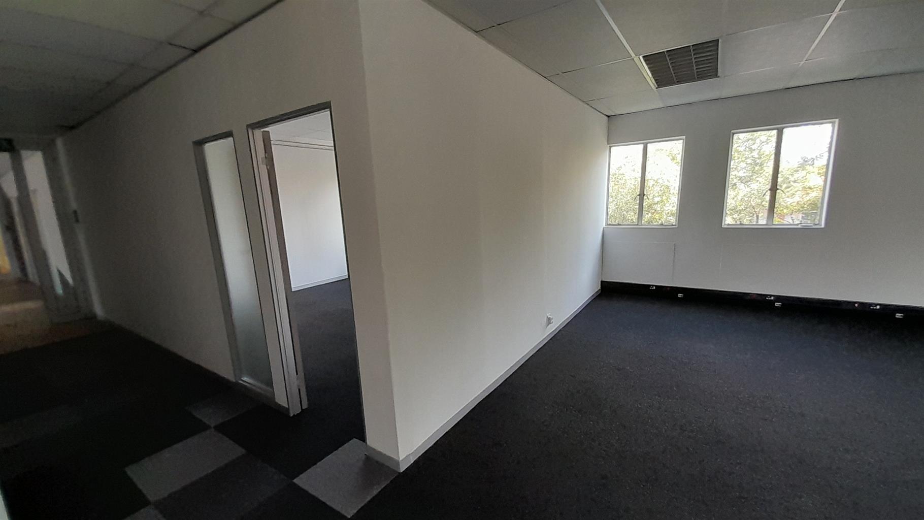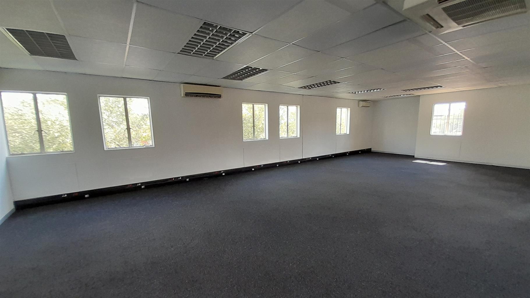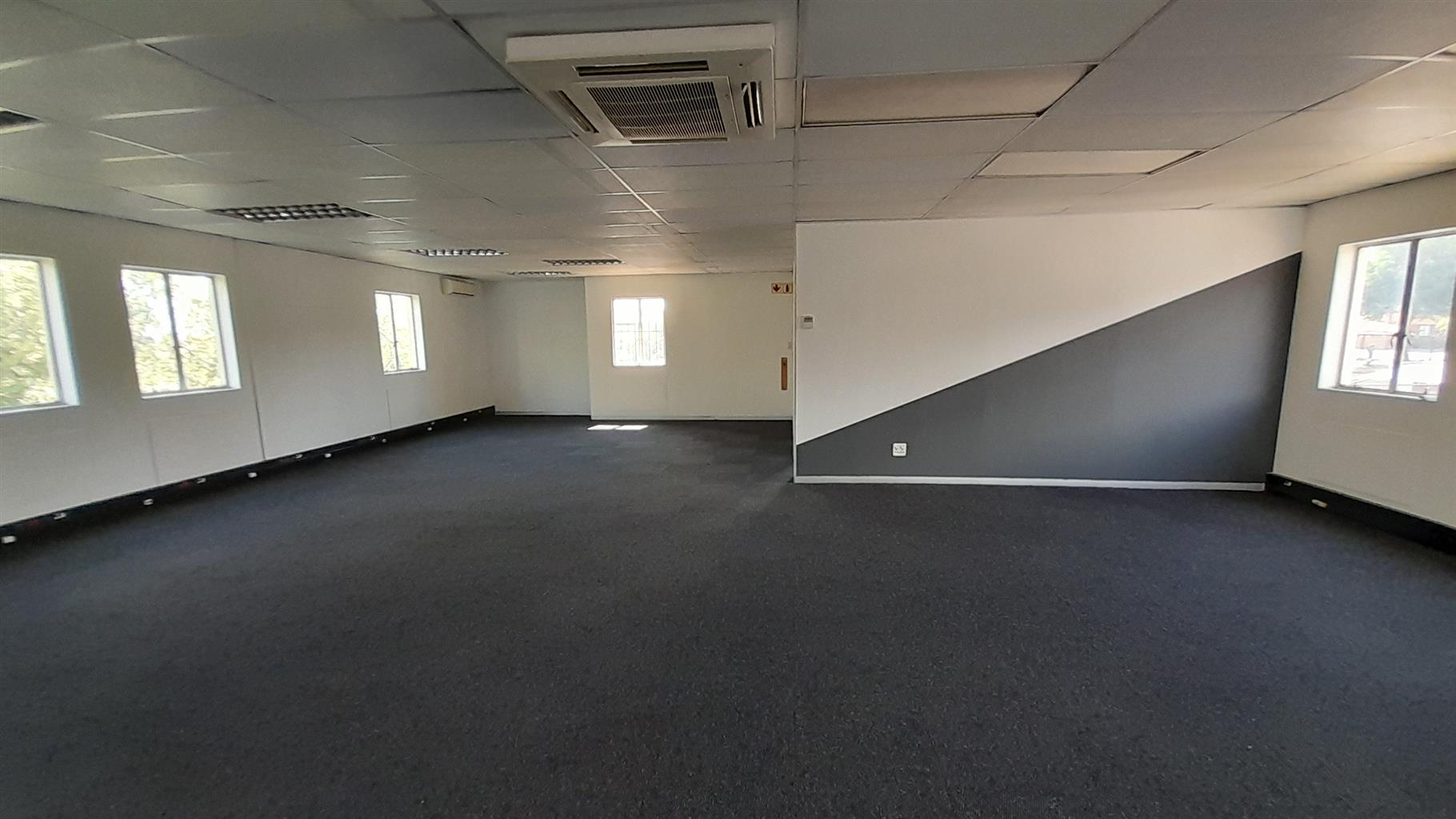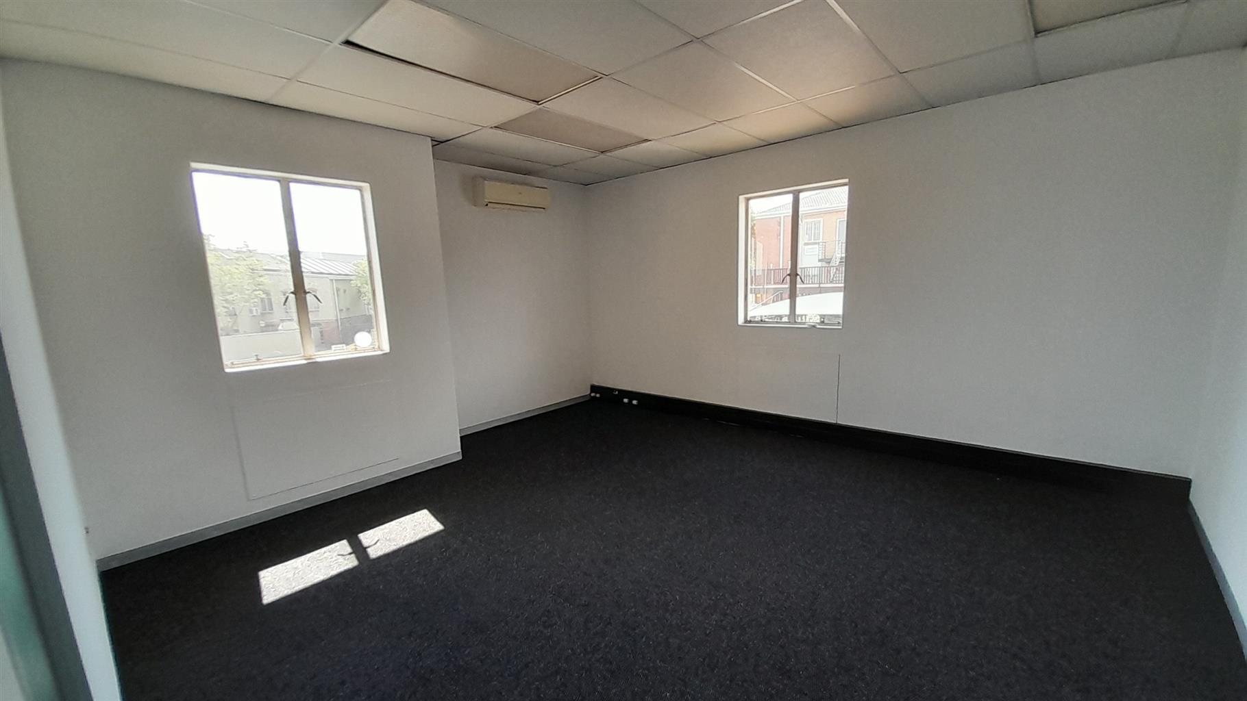 The layout comprises one boardroom, two closed offices, and a spacious open-plan area. The unit features carpet flooring throughout, central air conditioning, and excellent natural light from large perimeter windows, creating a bright and comfortable working environment. Communal ablutions and a shared kitchen are available within the building, which is multi-tenanted and fibre-ready for high-speed internet connectivity.