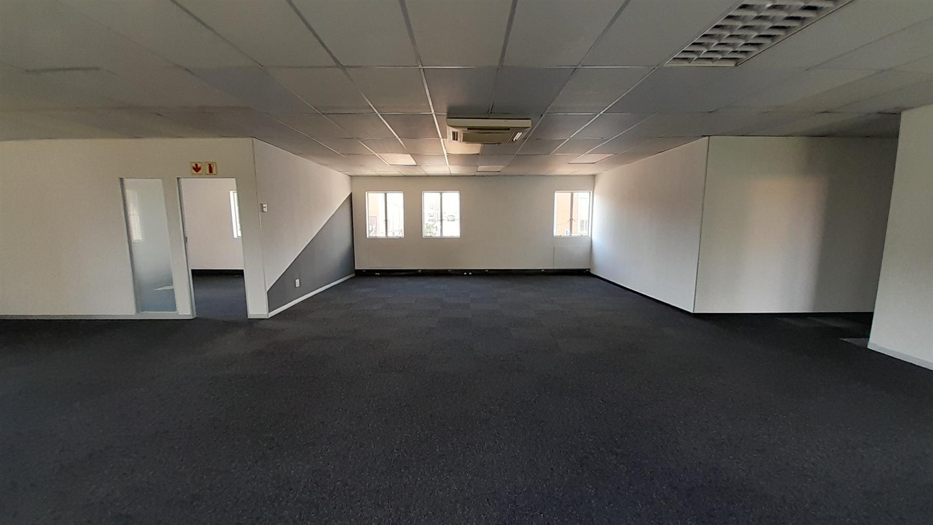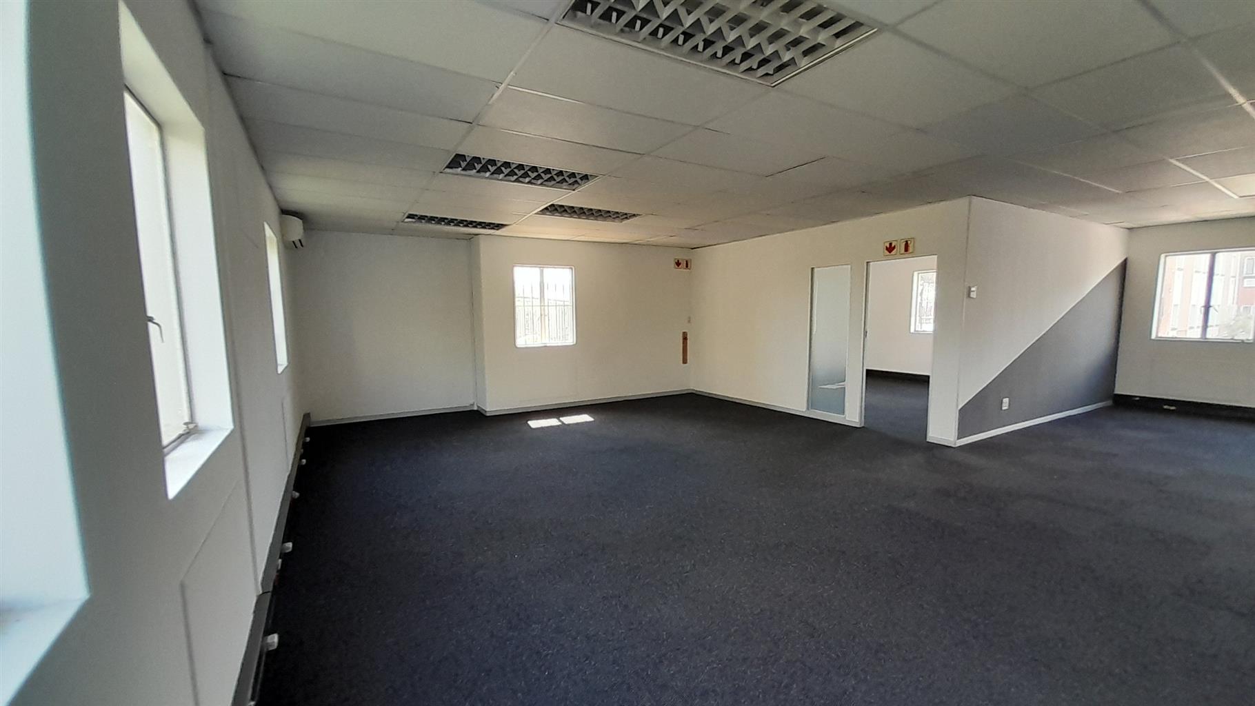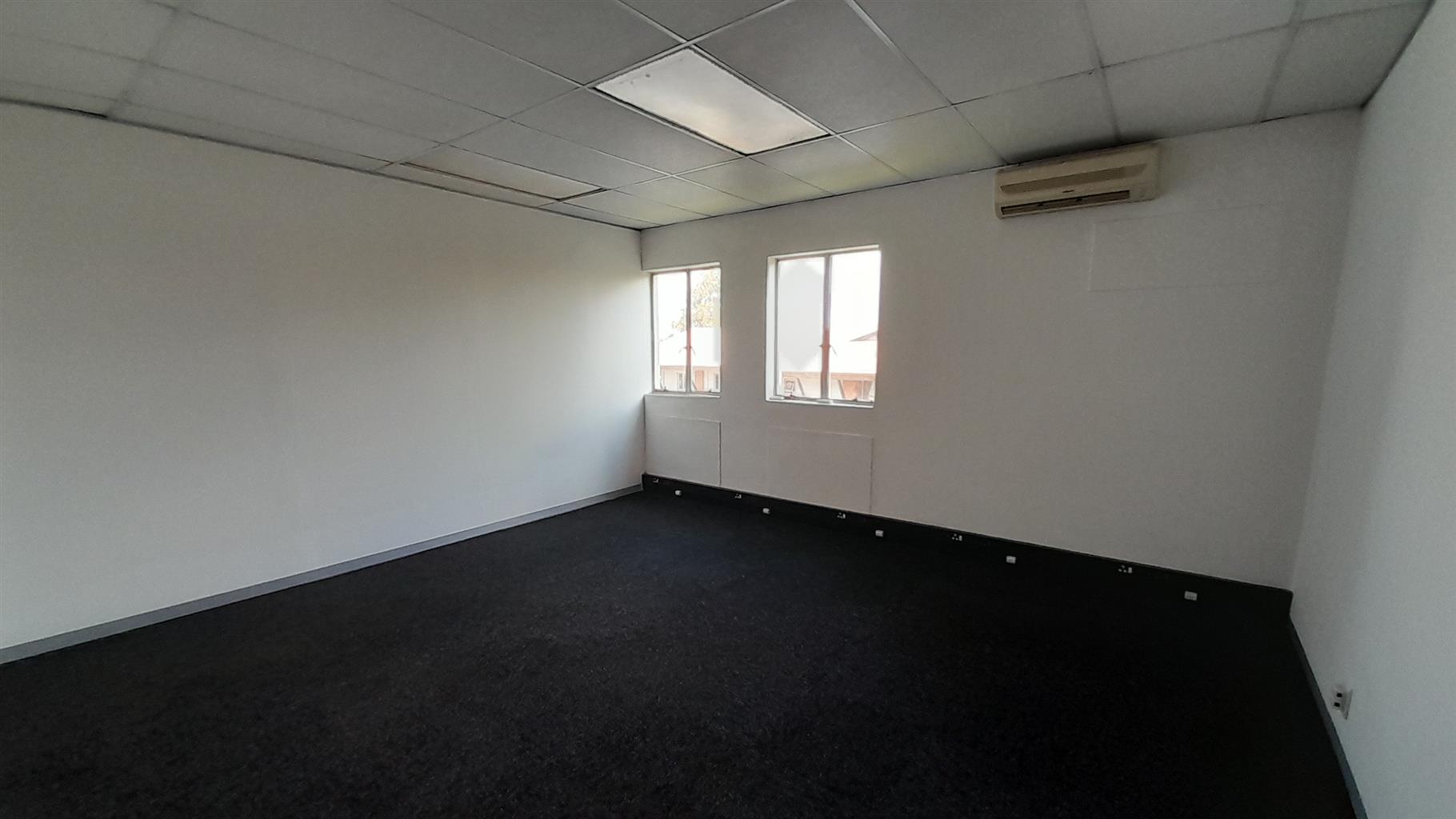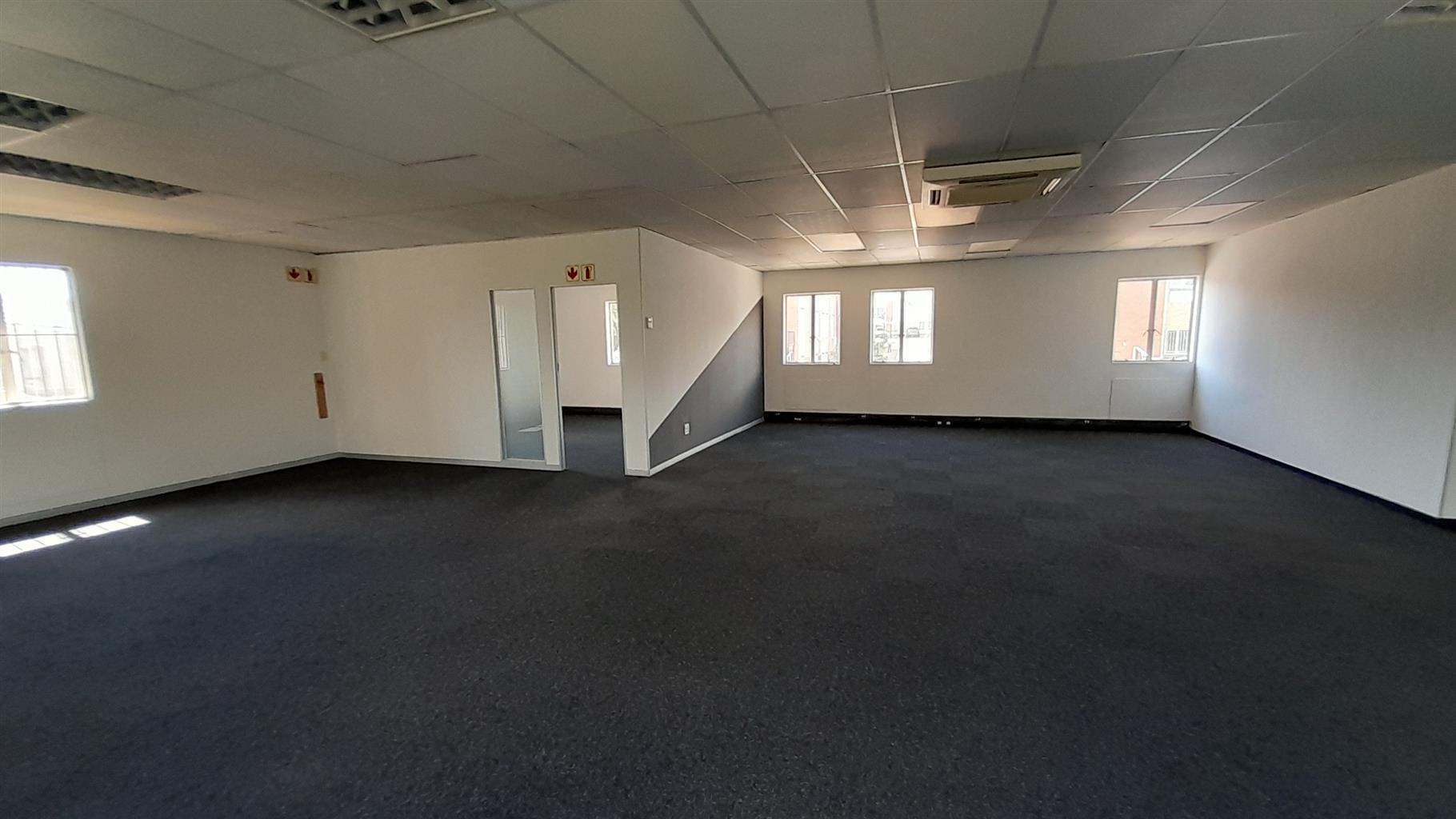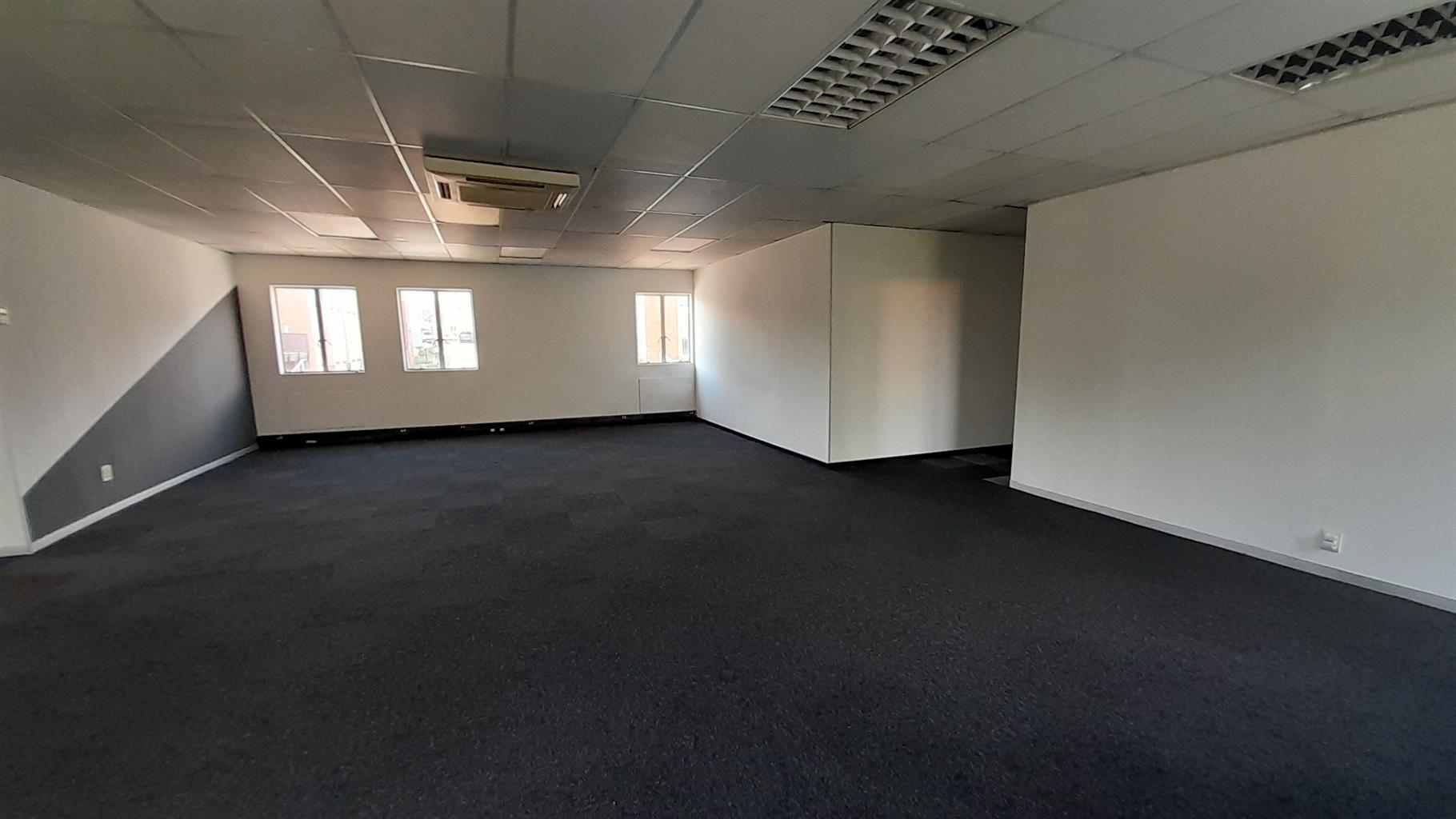 The layout comprises one boardroom, two closed offices, and a spacious open-plan area. The unit features carpet flooring throughout, central air conditioning, and excellent natural light from large perimeter windows, creating a bright and comfortable working environment. Communal ablutions and a shared kitchen are available within the building, which is multi-tenanted and fibre-ready for high-speed internet connectivity.