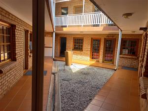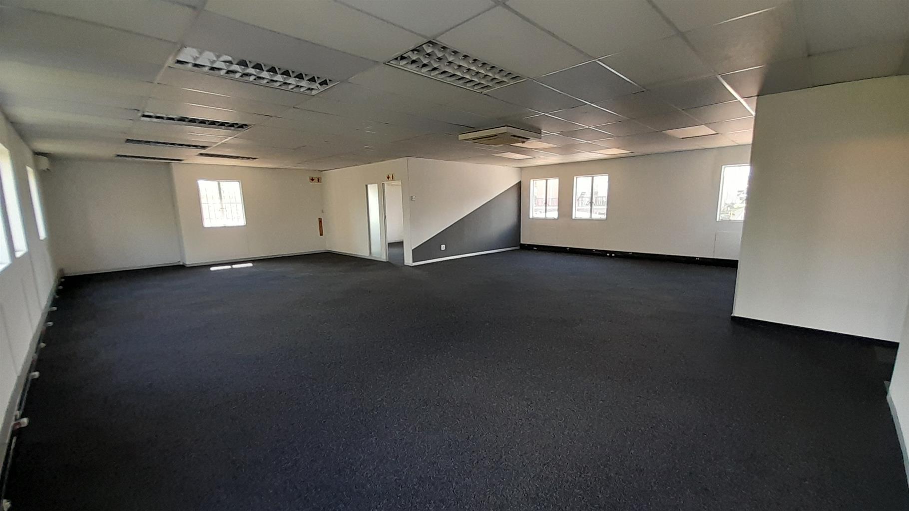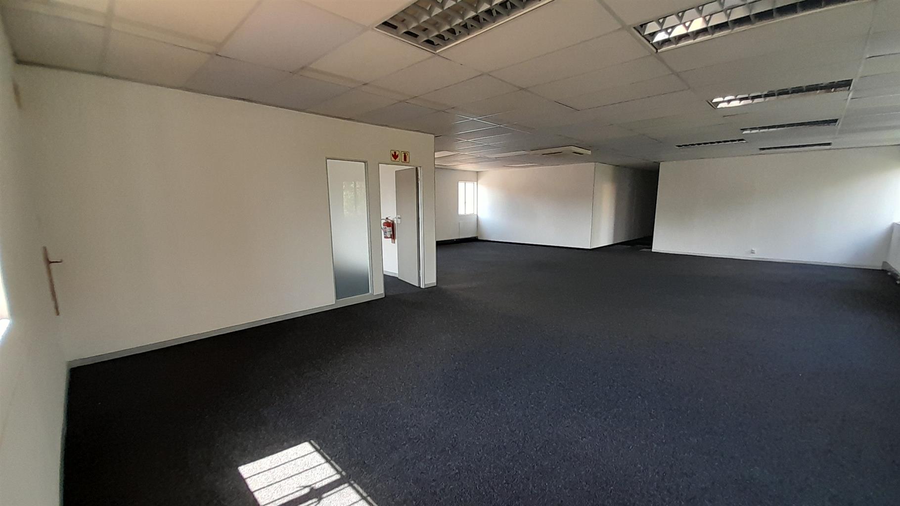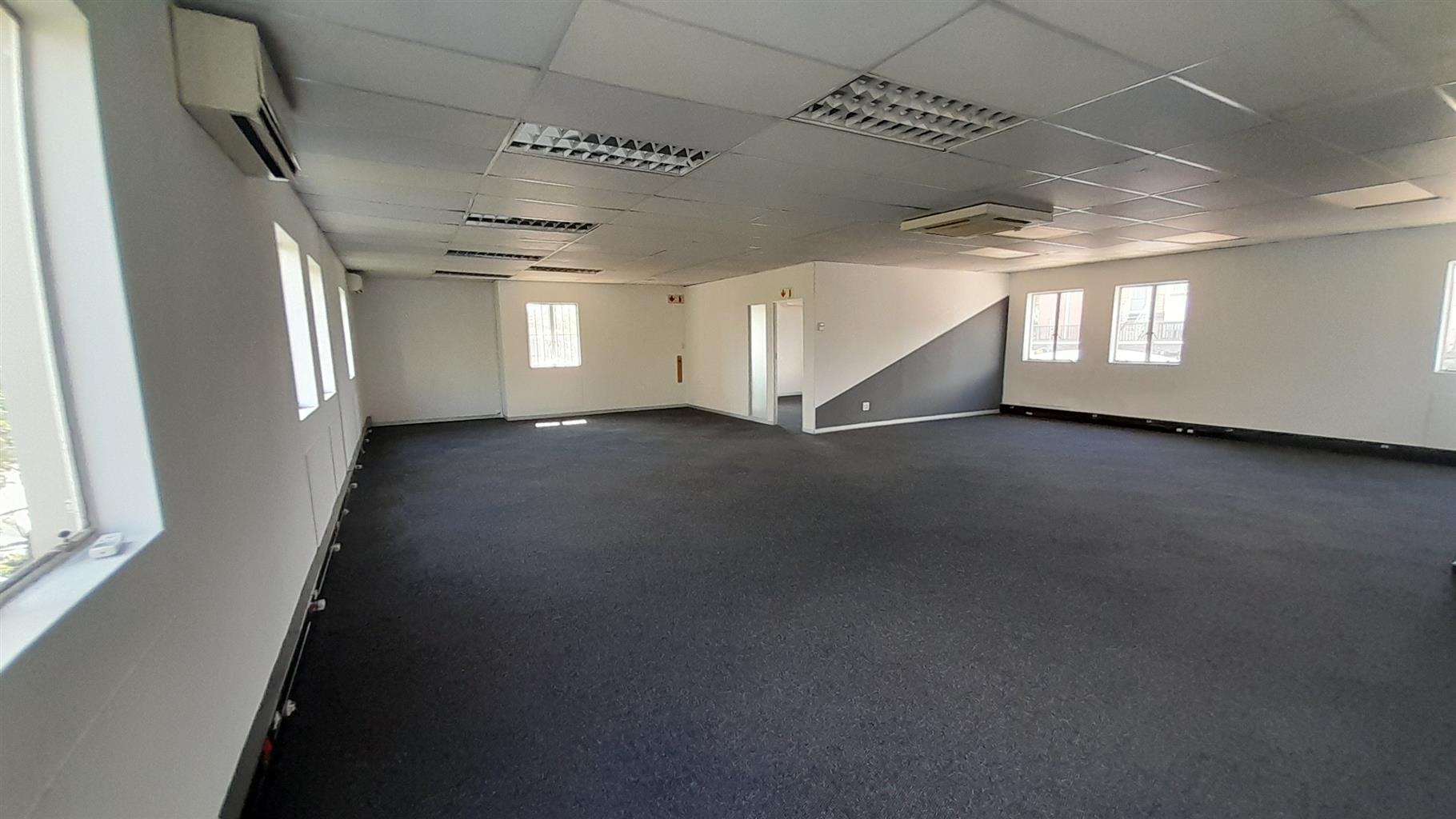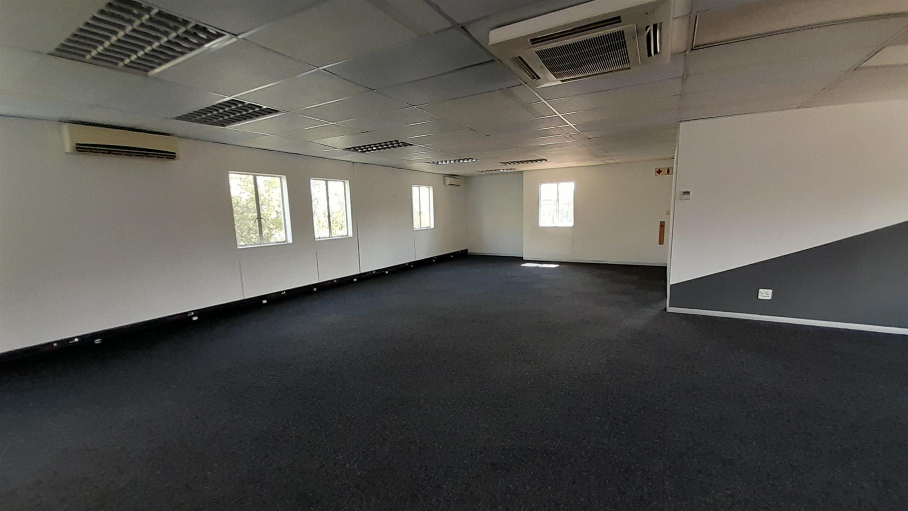The layout comprises one boardroom, two closed offices, and a spacious open-plan area. The unit features carpet flooring throughout, central air conditioning, and excellent natural light from large perimeter windows, creating a bright and comfortable working environment. Communal ablutions and a shared kitchen are available within the building, which is multi-tenanted and fibre-ready for high-speed internet connectivity.