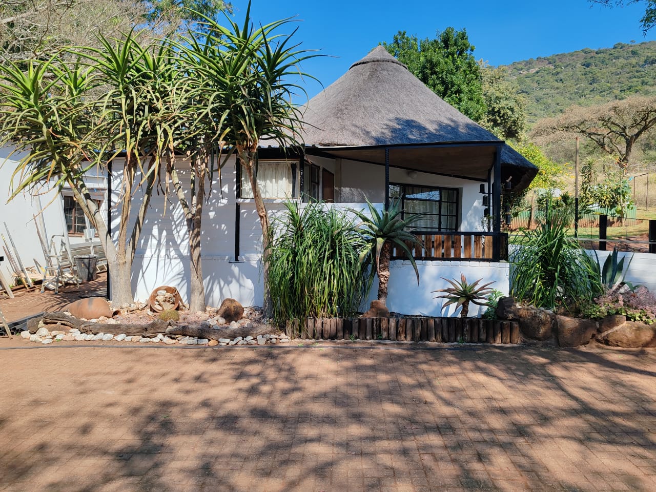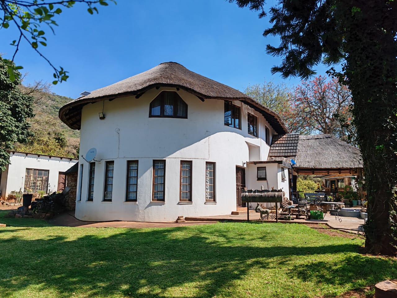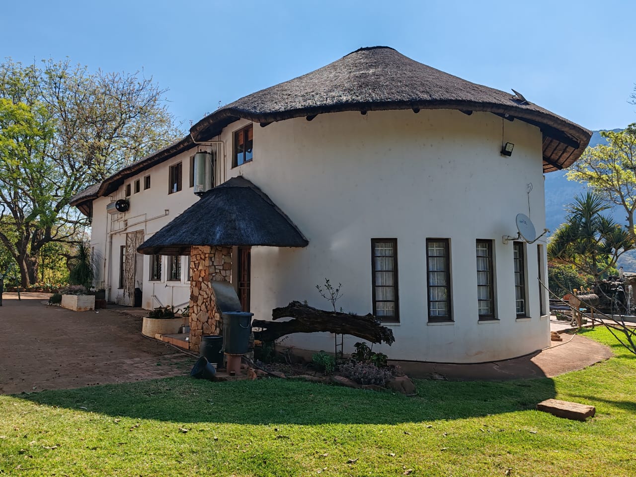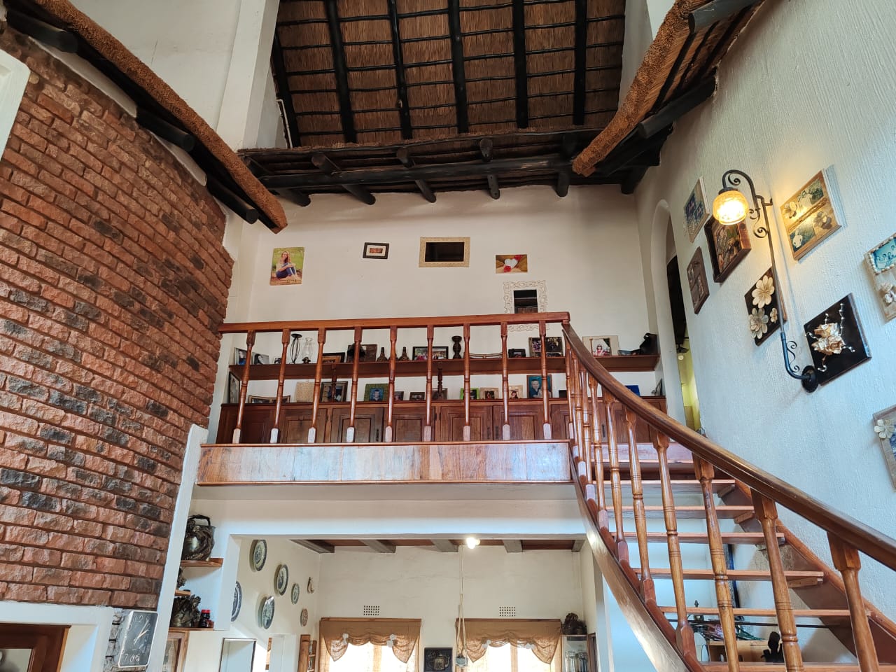 The double story thatched home is a huge elongated rondavels, the ends of the dwelling are the unique lounge and the opposite end the