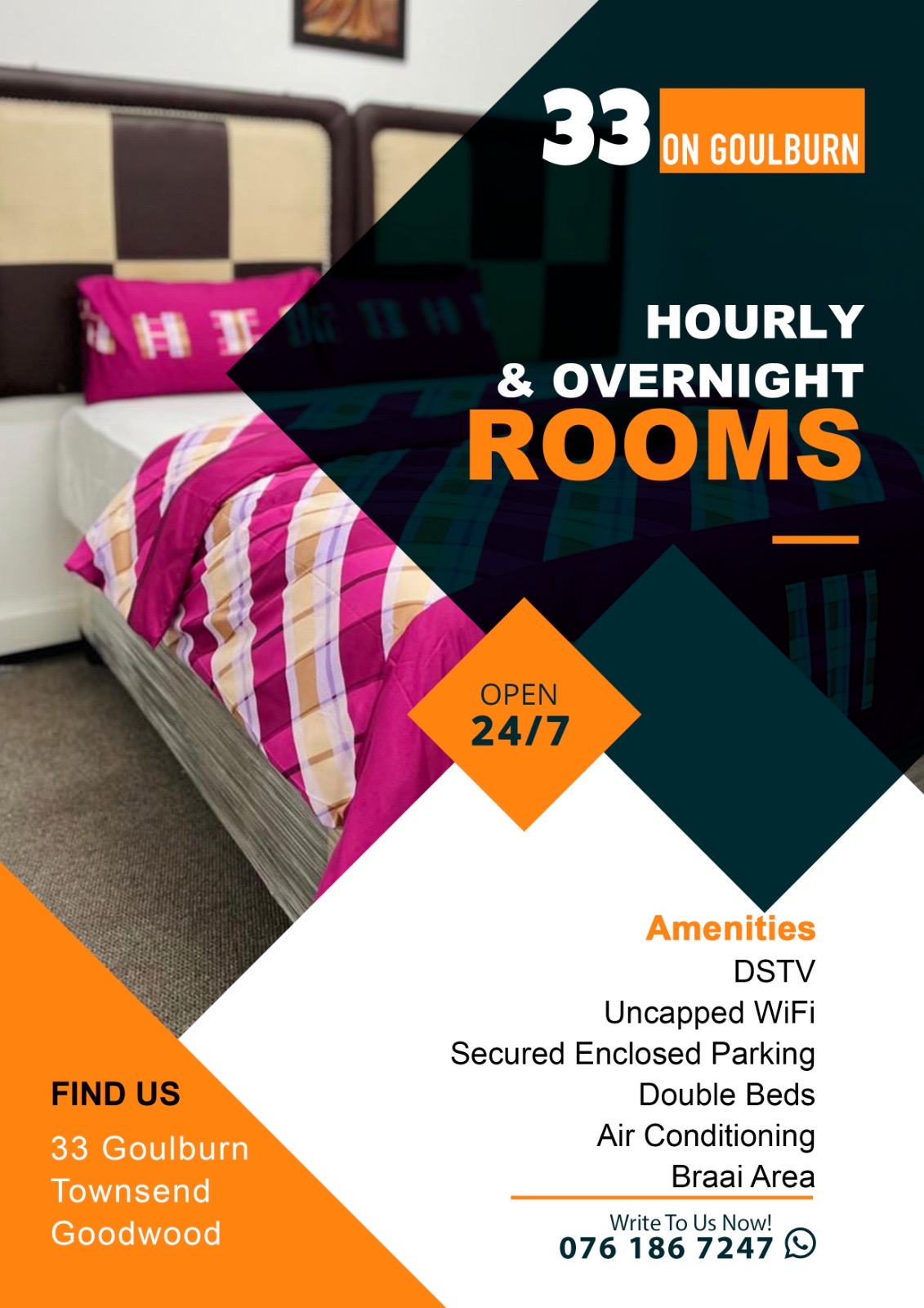33 Goulburn is a neat cosy guest house nestled in Goodwood offering homely,secure affordable and convenient private rooms tailored to meet the demands of each individual client. You can book a room for only the hours you need, for an overnight stay , weekend or long stay. Prices are pocket friendly and we are open 24/7. Self catering and laundry facilities available.