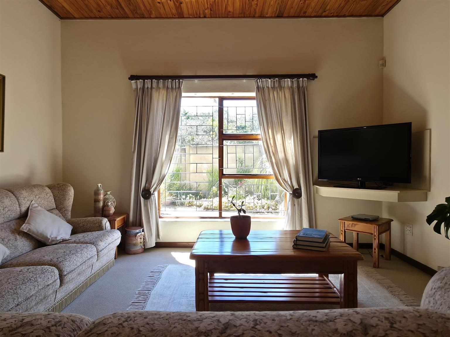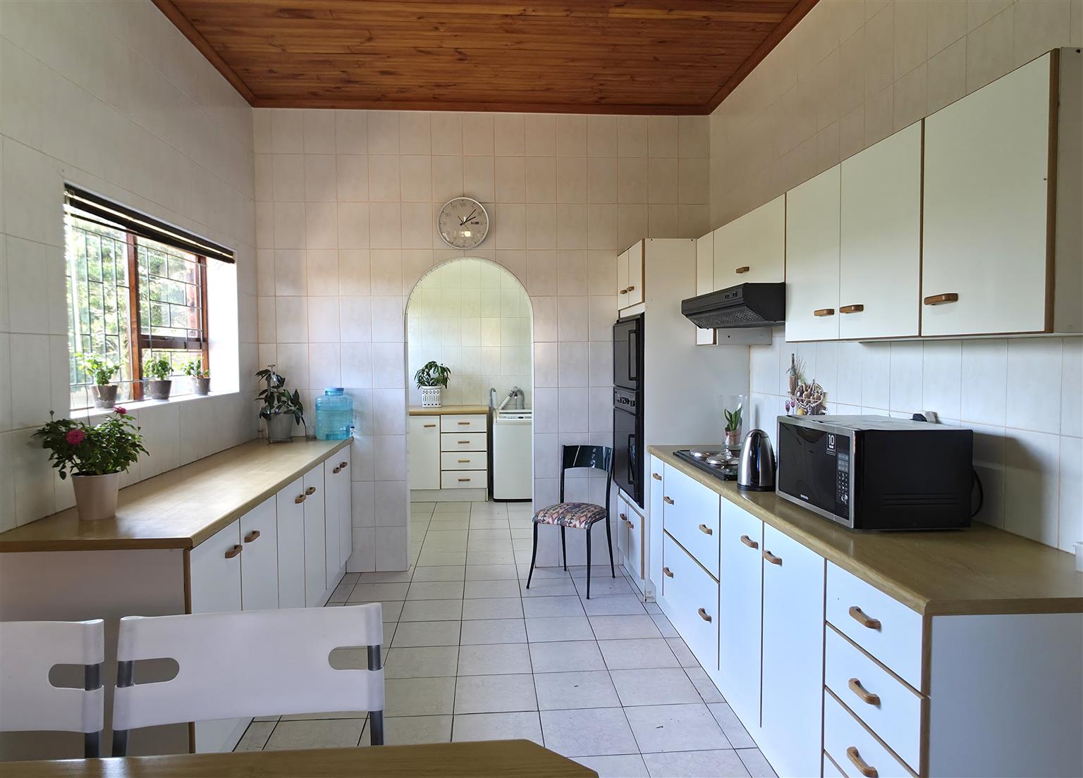 A lush, well-established garden provides a warm welcome at the entrance hall and sets the tone for the rest of this lovely home. The open-plan living and dining area flows seamlessly into a farm-style kitchen overlooking the garden and kloof — the perfect space for family gatherings and entertaining. A separate scullery and back door leading to the rear garden add practical convenience.