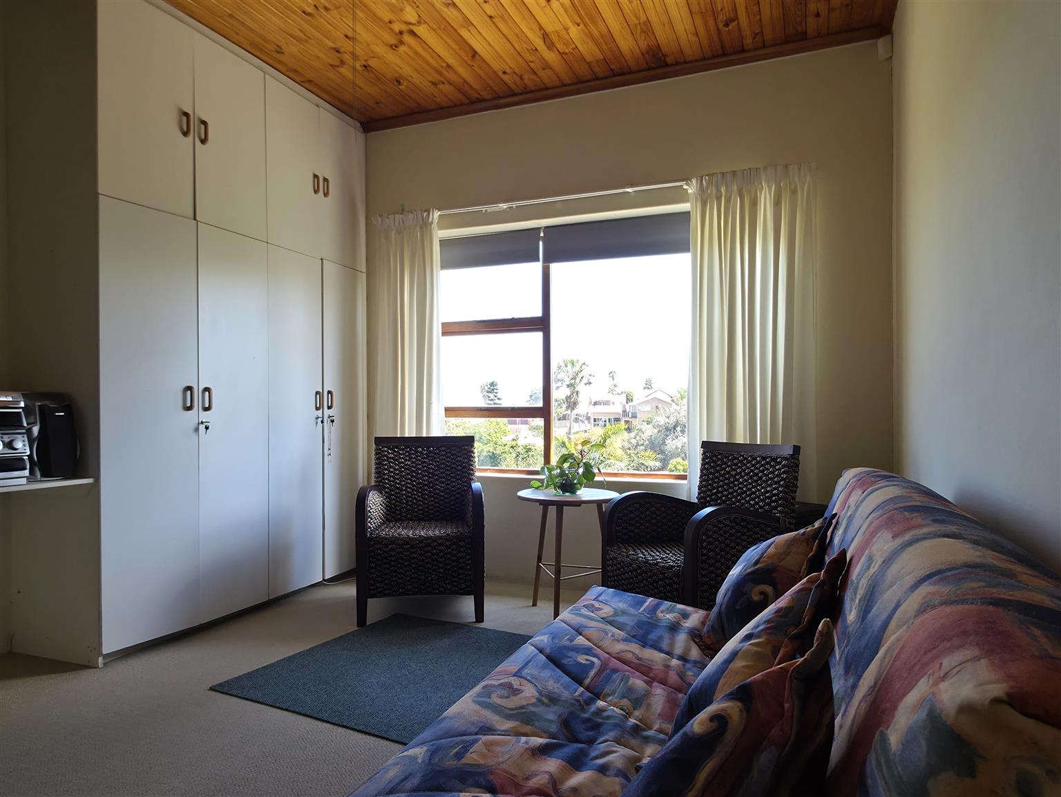 Upstairs, the extra-spacious master suite is truly impressive — large enough to create a private lounge, fitness corner, or reading nook. The en-suite bathroom complements the room beautifully, while large windows invite in natural light and open onto a timber deck with breathtaking views over the kloof and distant sea. Two additional bedrooms, also overlooking the kloof, complete the upper level.