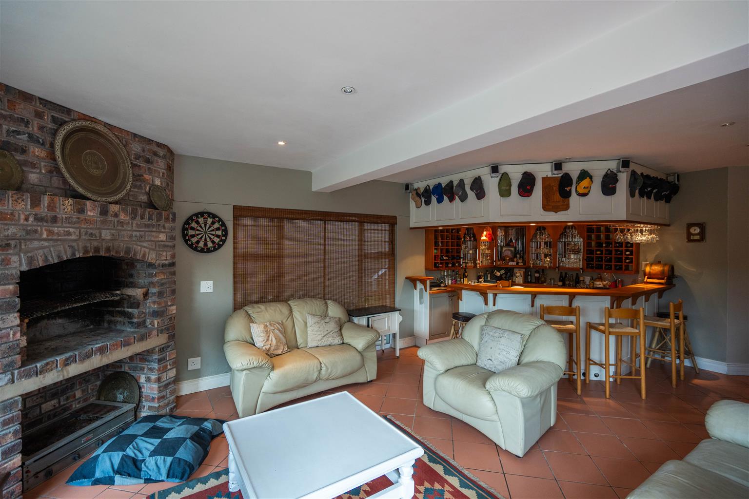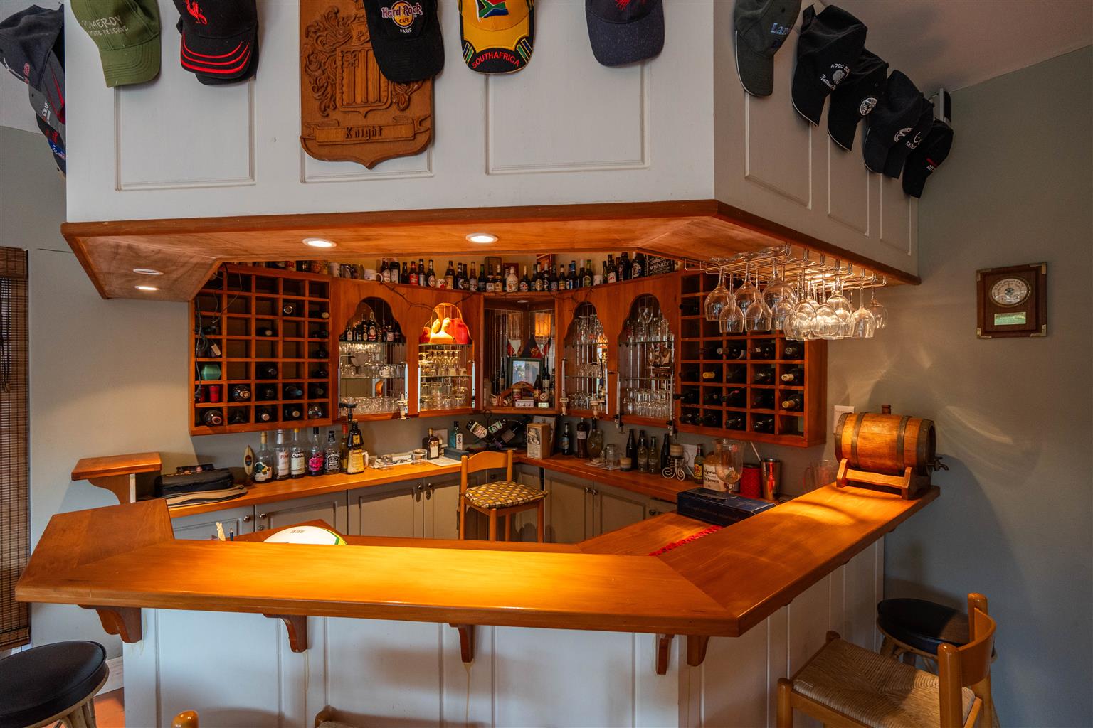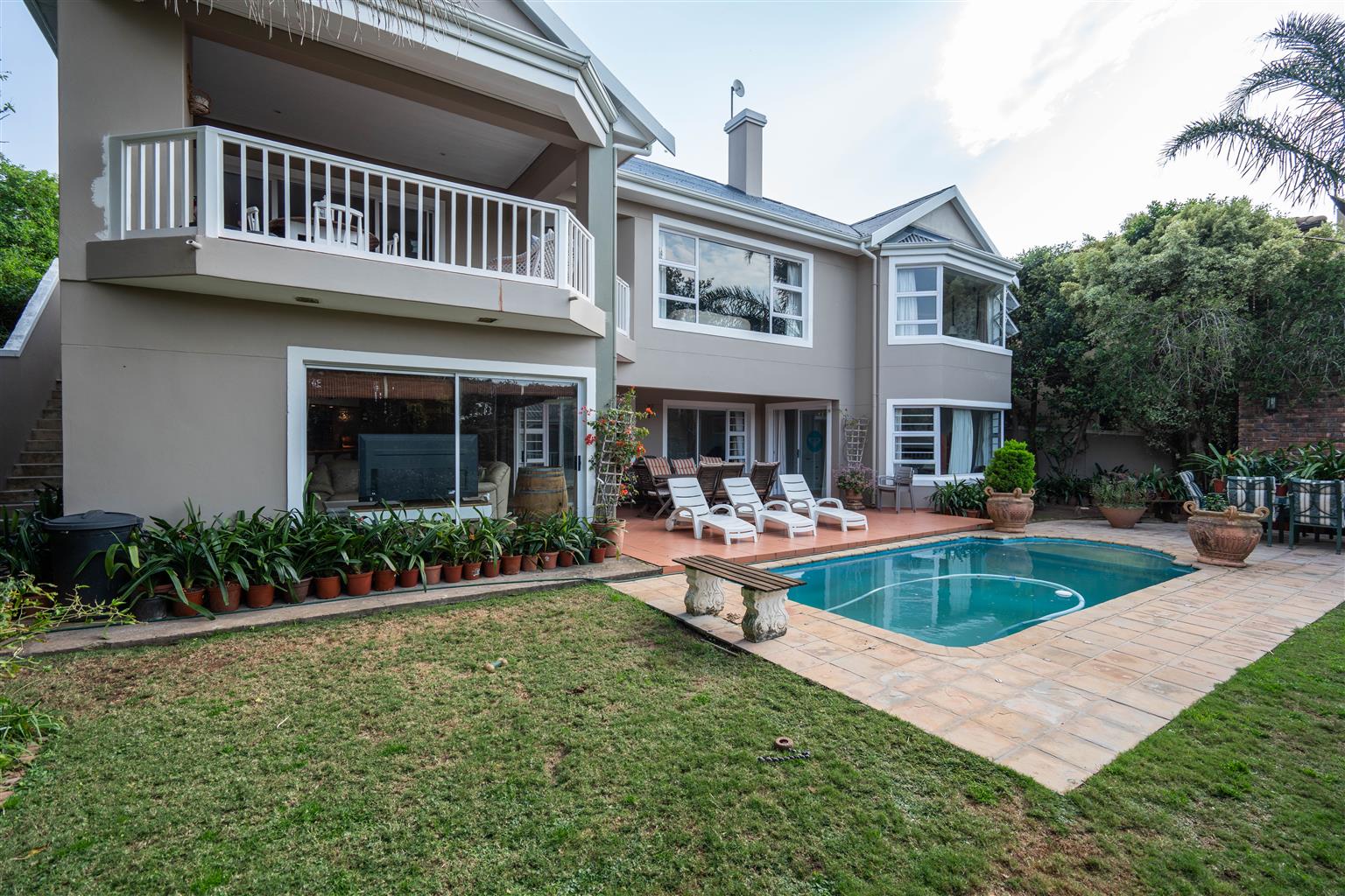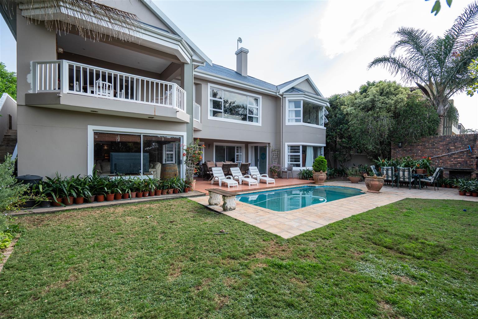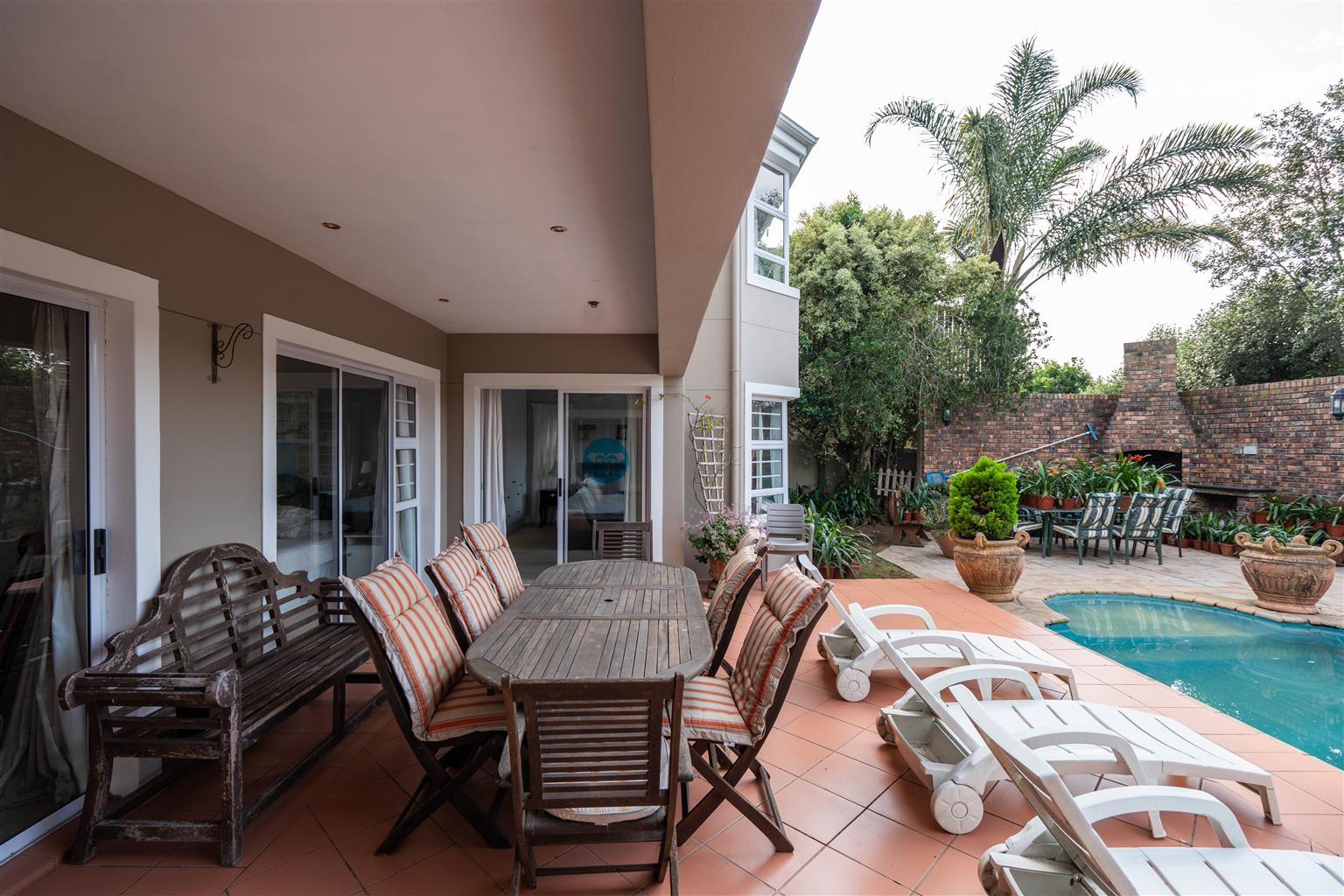 Upstairs there is a large bedroom en- suite. Downstairs there are four bedrooms and two bathrooms. There is an entertainment lounge and bar with built in braai leading out onto the patio area and pool. An ideal storeroom tucked away next to the bar area. An ideal spot for a cellar. The garden is filled with clivias. The open patio area is an ideal spot to sit while your children are playing in the pool.