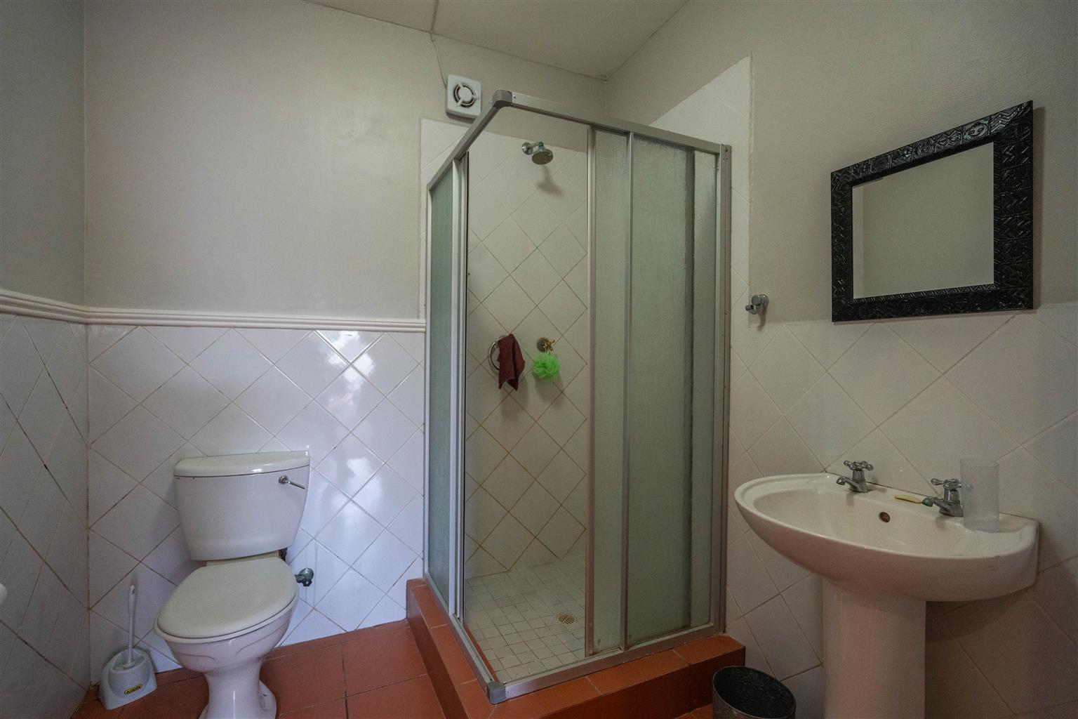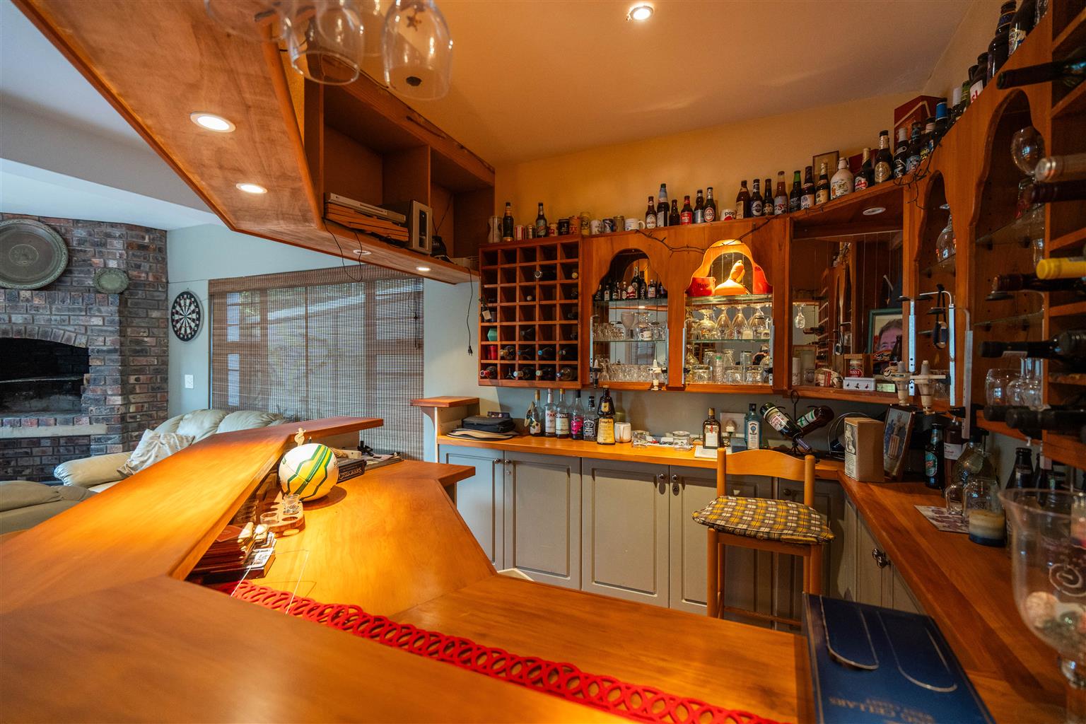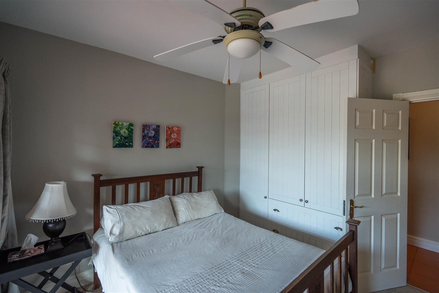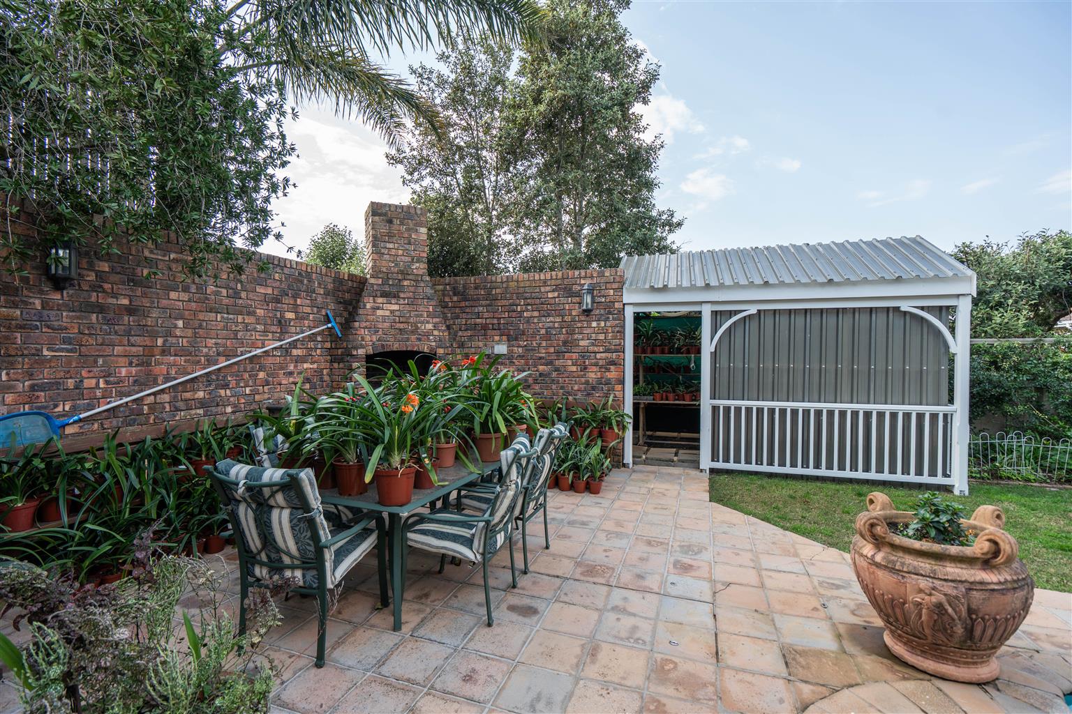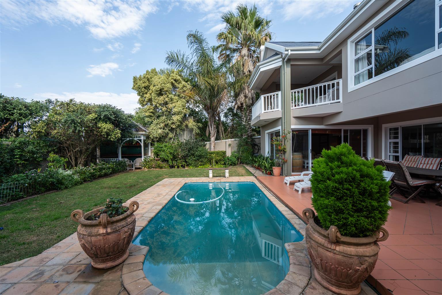 Upstairs there is a large bedroom en- suite. Downstairs there are four bedrooms and two bathrooms. There is an entertainment lounge and bar with built in braai leading out onto the patio area and pool. An ideal storeroom tucked away next to the bar area. An ideal spot for a cellar. The garden is filled with clivias. The open patio area is an ideal spot to sit while your children are playing in the pool.