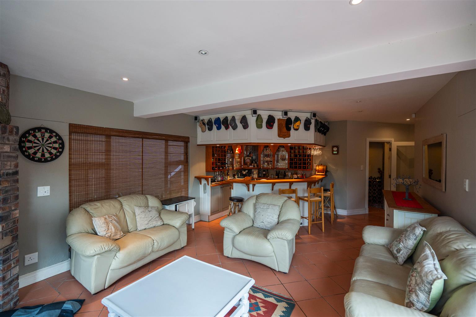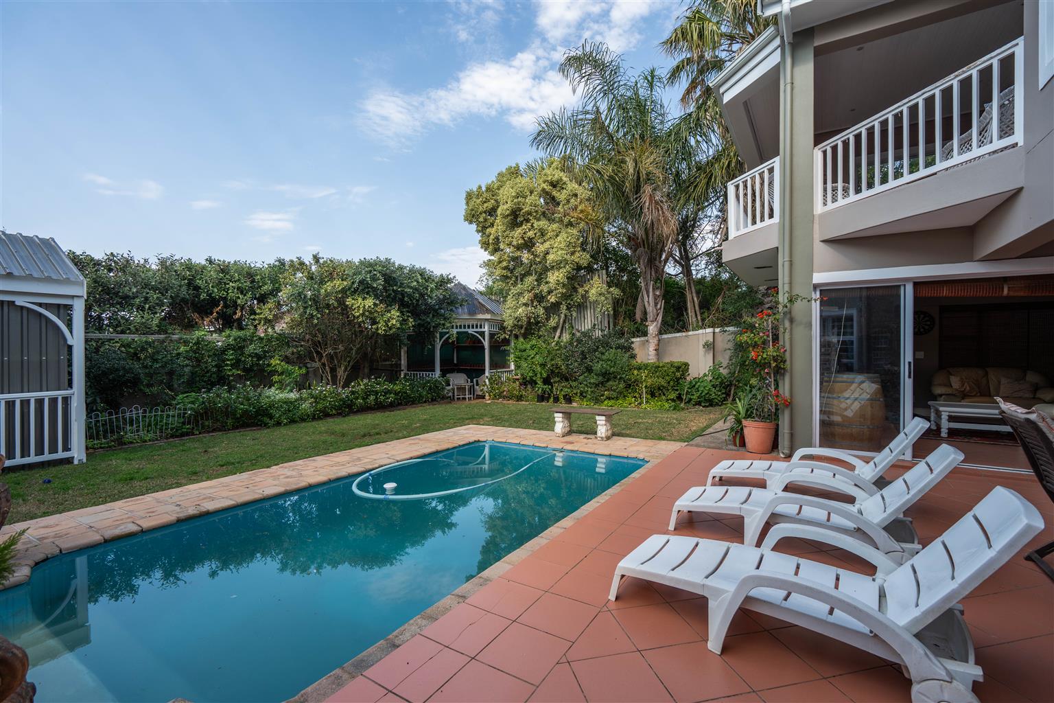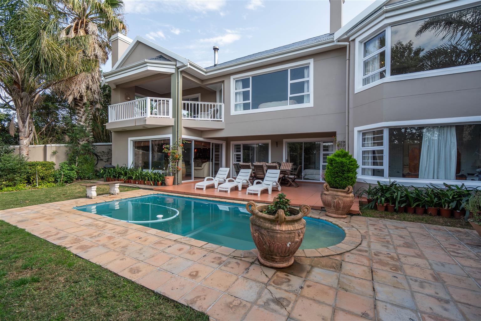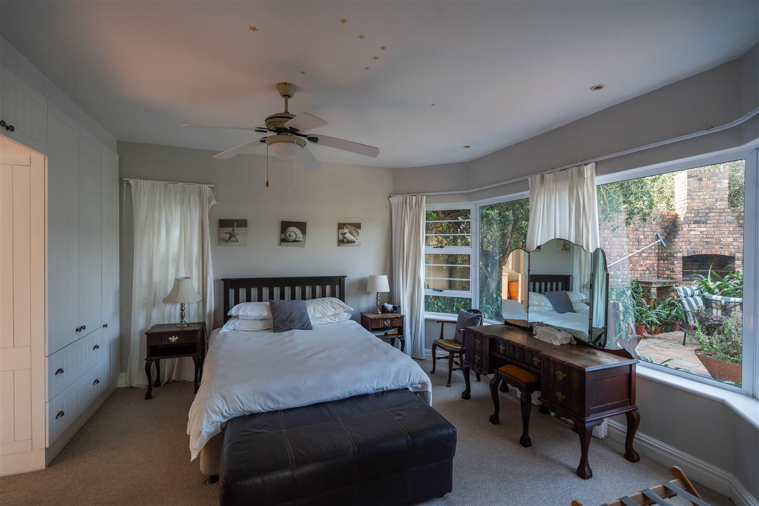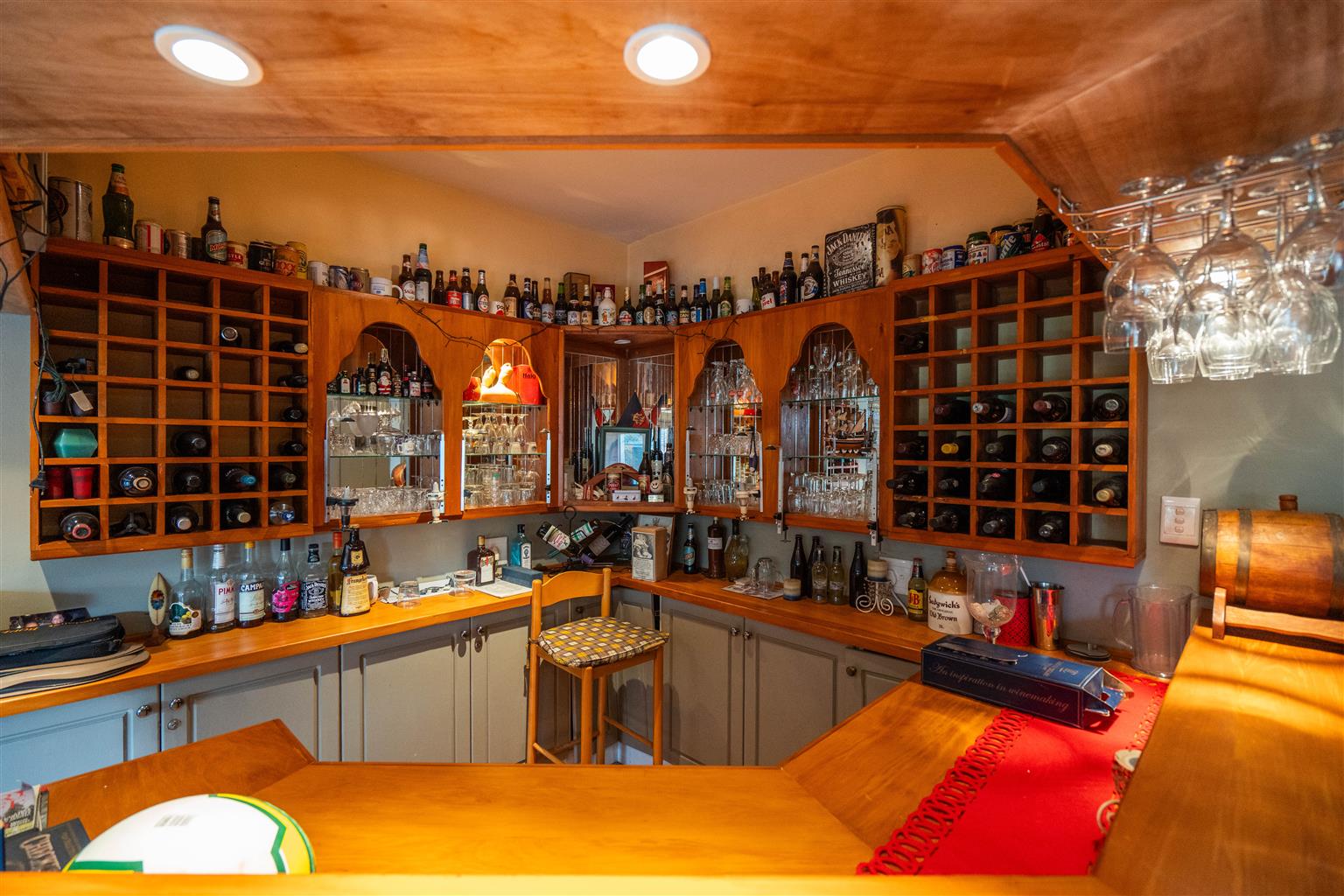 Upstairs there is a large bedroom en- suite. Downstairs there are four bedrooms and two bathrooms. There is an entertainment lounge and bar with built in braai leading out onto the patio area and pool. An ideal storeroom tucked away next to the bar area. An ideal spot for a cellar. The garden is filled with clivias. The open patio area is an ideal spot to sit while your children are playing in the pool.
