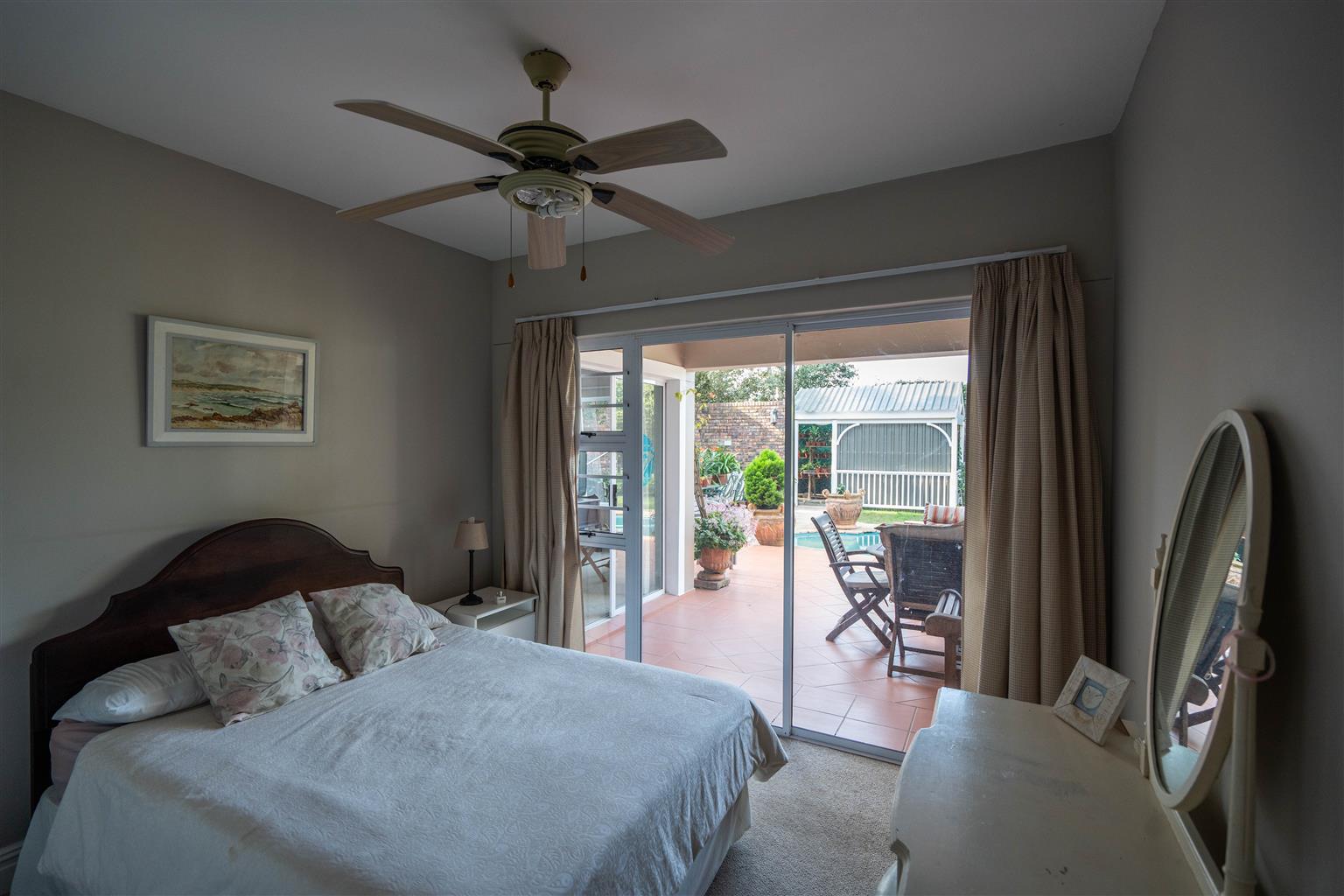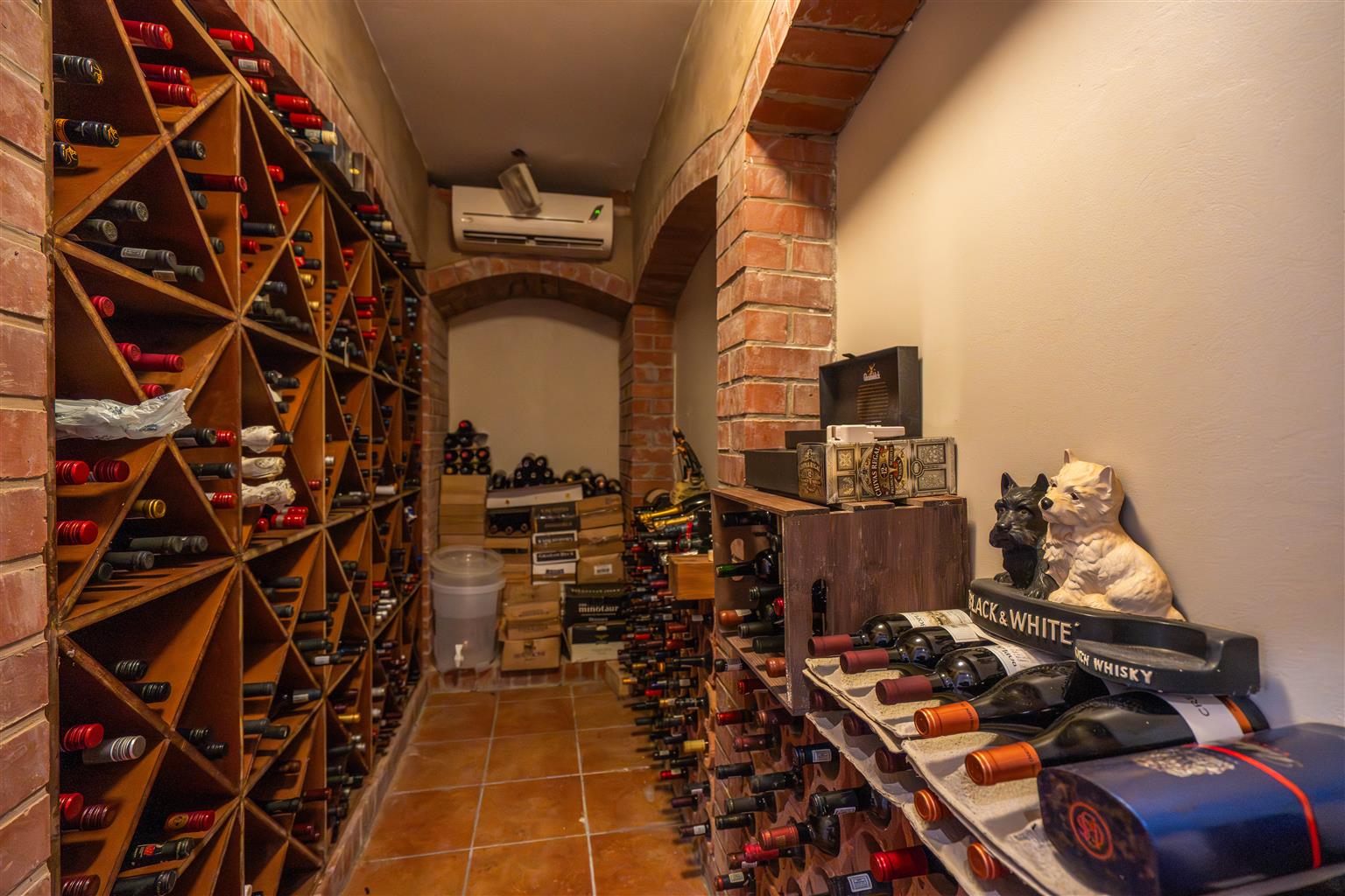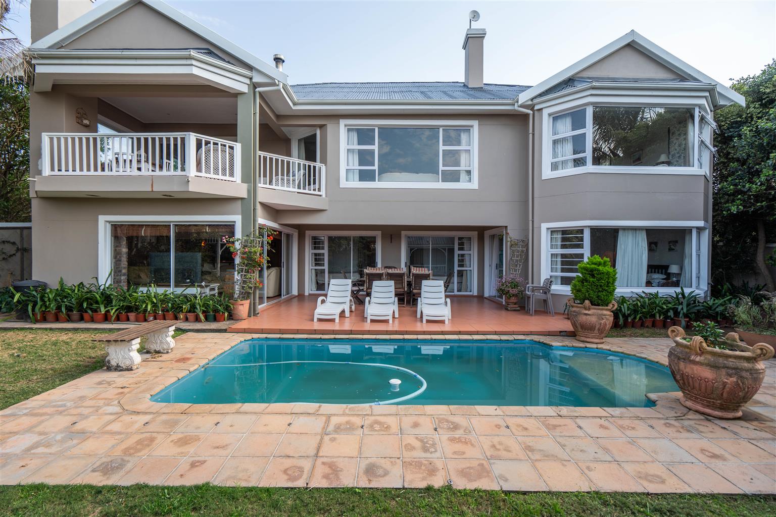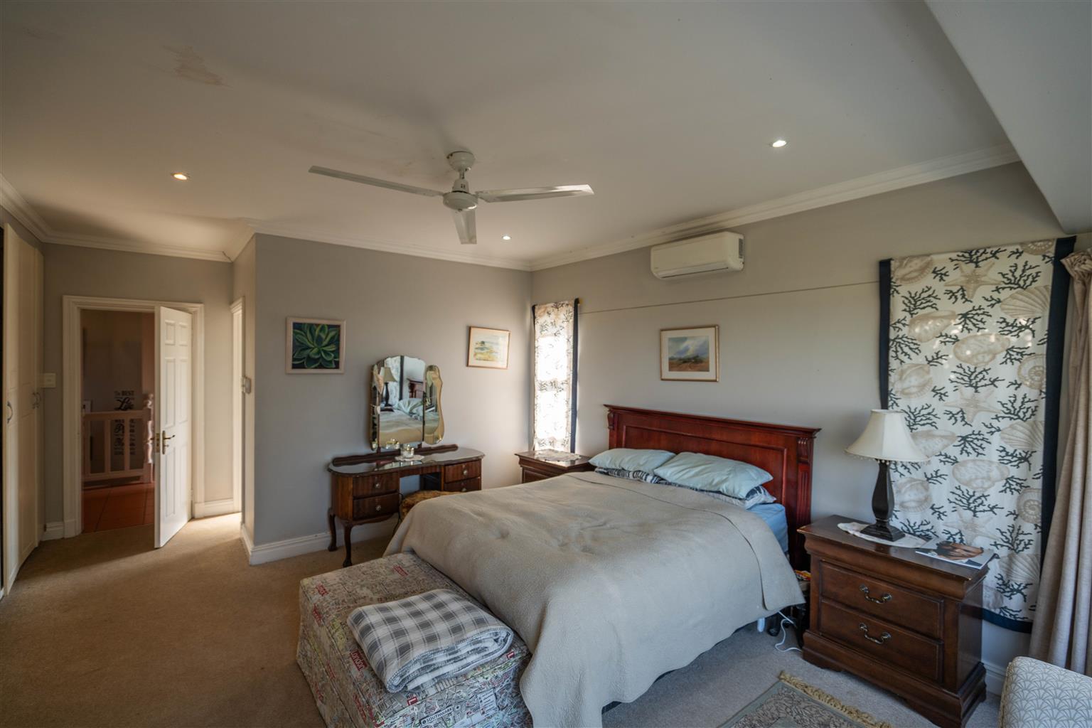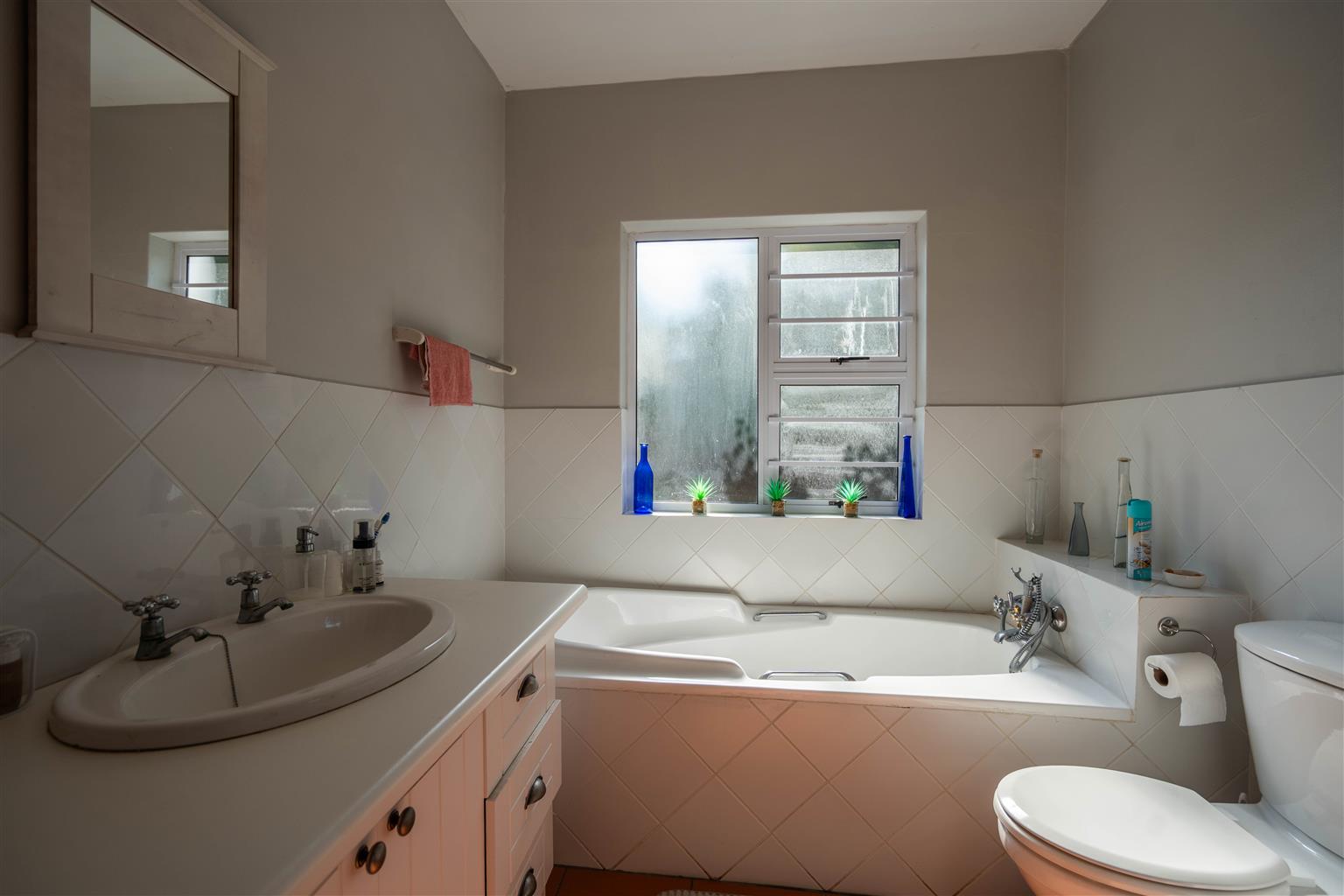 Upstairs there is a large bedroom en- suite. Downstairs there are four bedrooms and two bathrooms. There is an entertainment lounge and bar with built in braai leading out onto the patio area and pool. An ideal storeroom tucked away next to the bar area. An ideal spot for a cellar. The garden is filled with clivias. The open patio area is an ideal spot to sit while your children are playing in the pool.