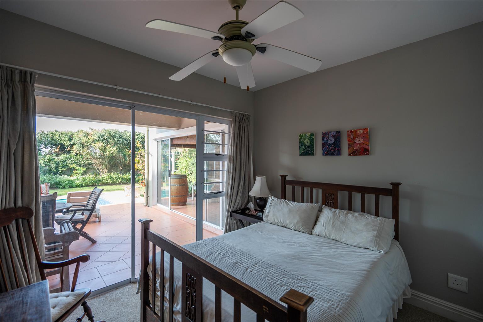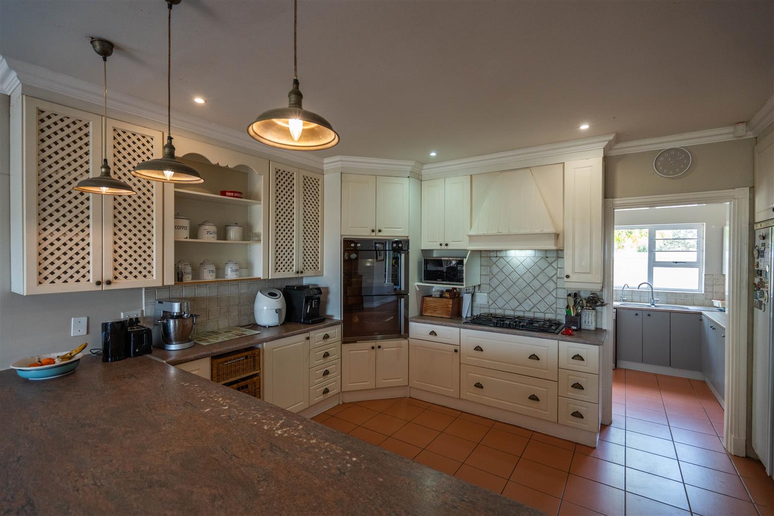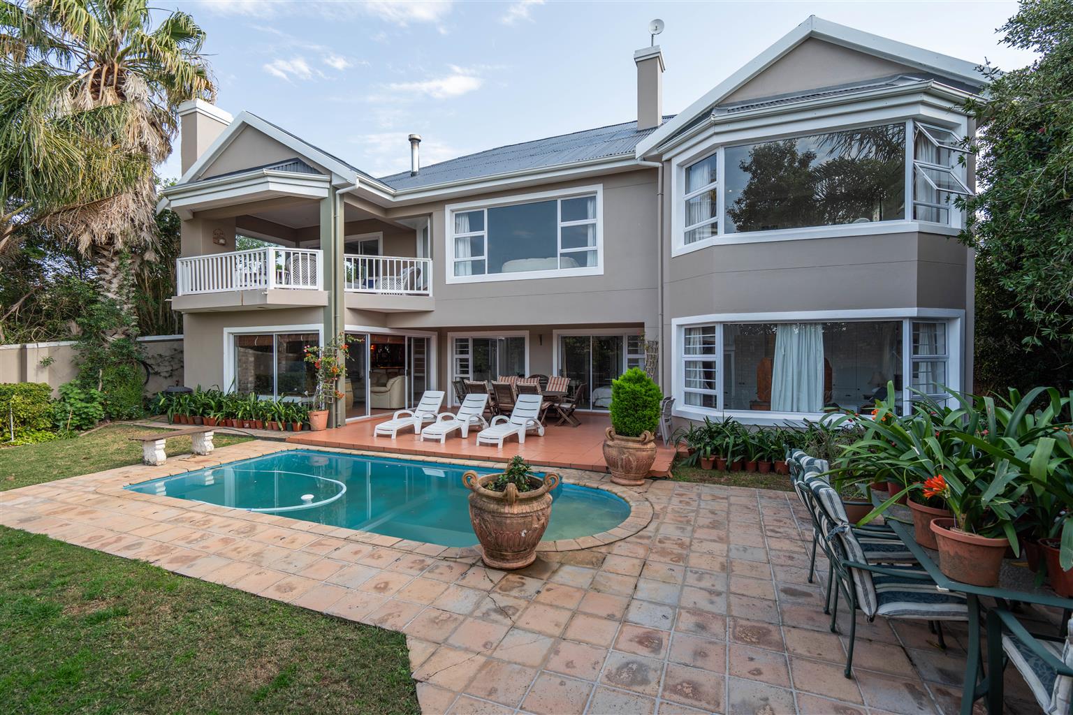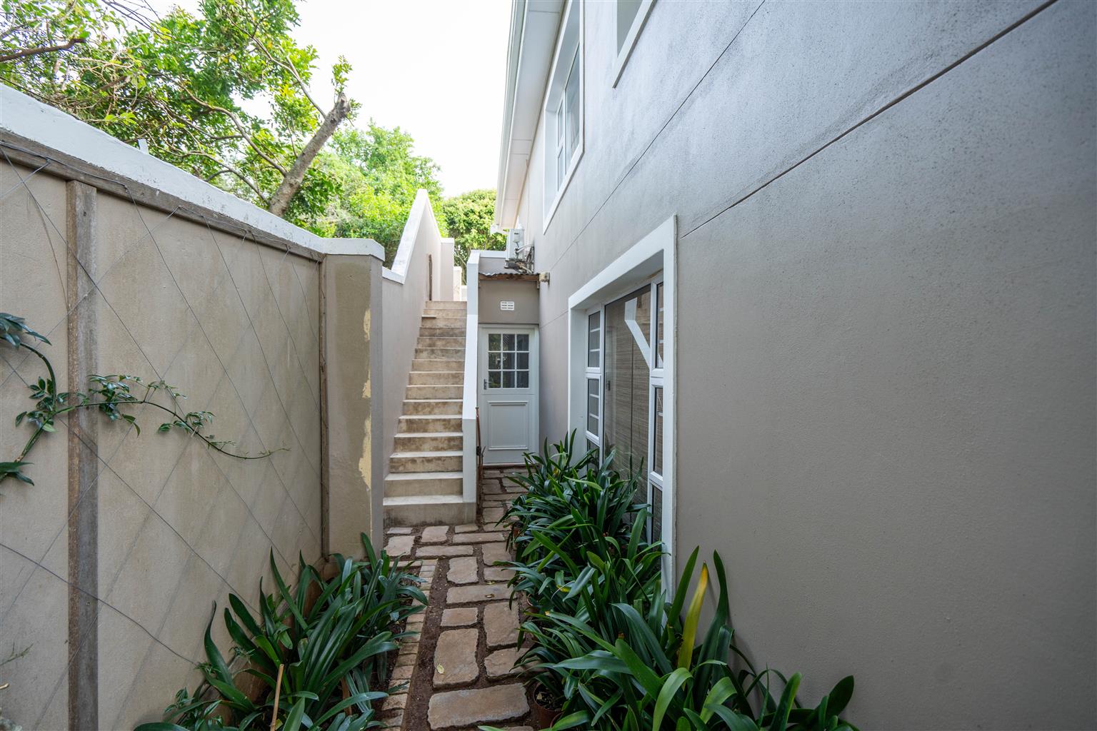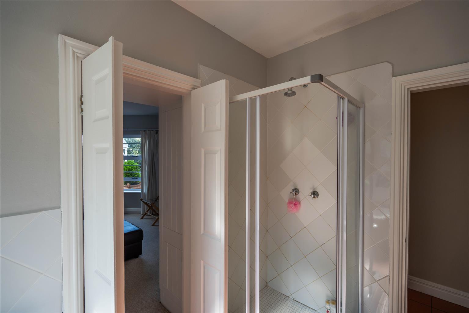 Upstairs there is a large bedroom en- suite. Downstairs there are four bedrooms and two bathrooms. There is an entertainment lounge and bar with built in braai leading out onto the patio area and pool. An ideal storeroom tucked away next to the bar area. An ideal spot for a cellar. The garden is filled with clivias. The open patio area is an ideal spot to sit while your children are playing in the pool.