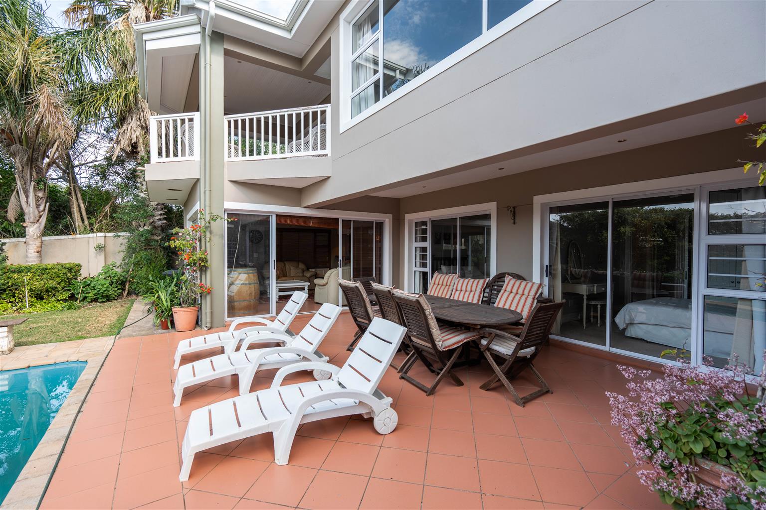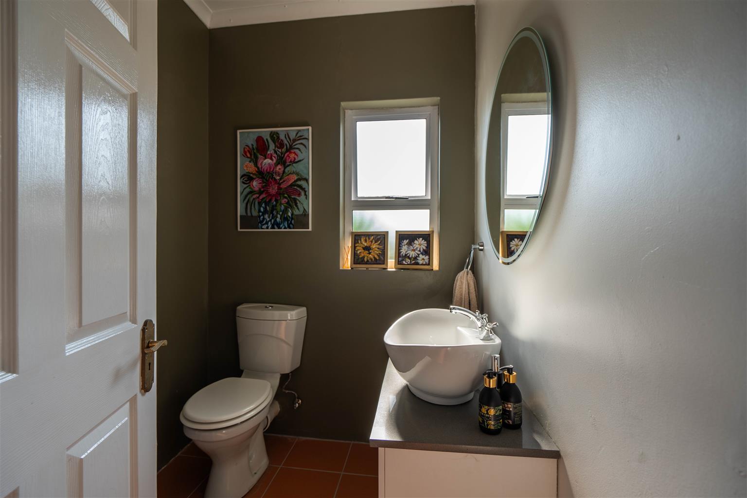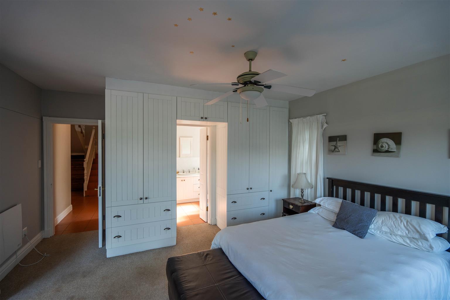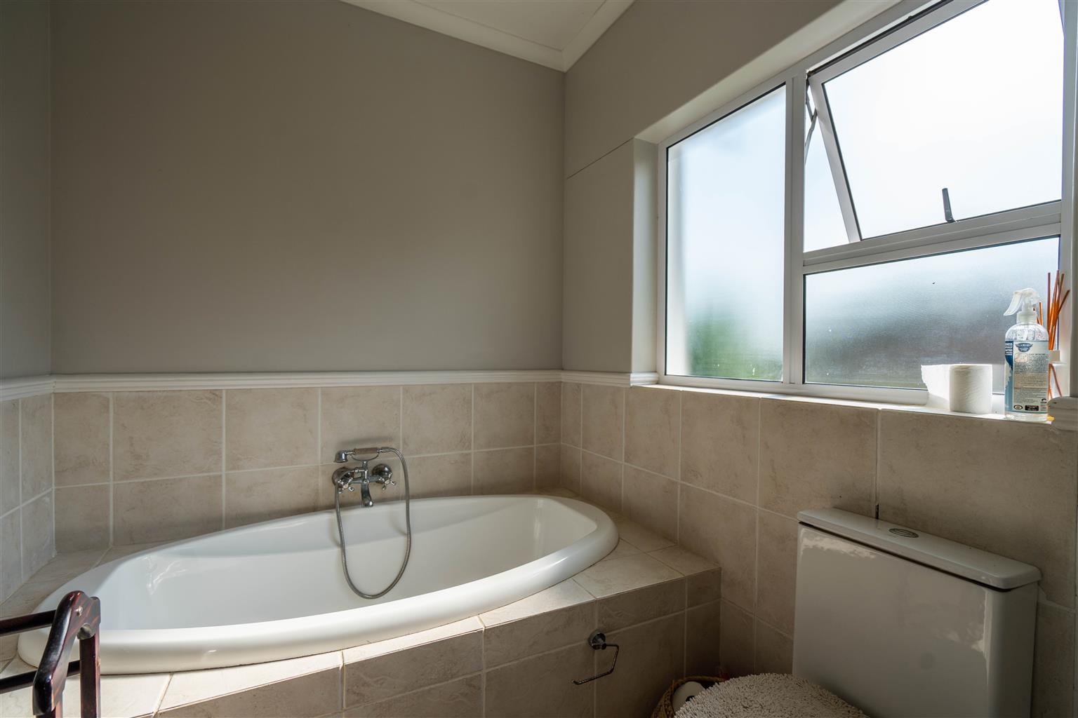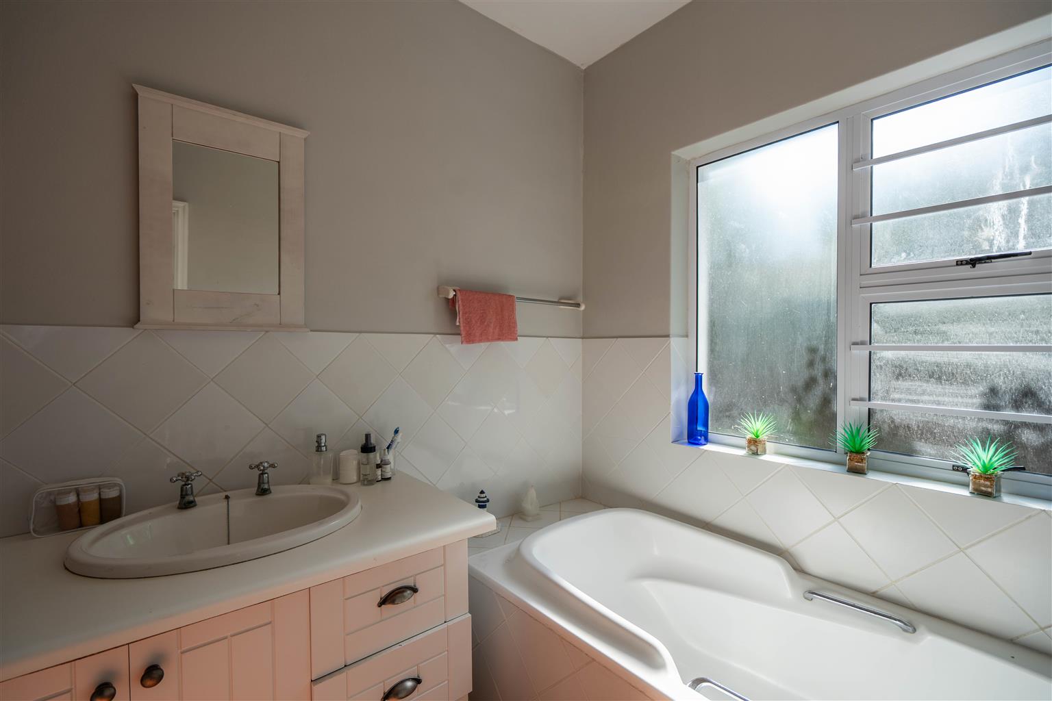 Upstairs there is a large bedroom en- suite. Downstairs there are four bedrooms and two bathrooms. There is an entertainment lounge and bar with built in braai leading out onto the patio area and pool. An ideal storeroom tucked away next to the bar area. An ideal spot for a cellar. The garden is filled with clivias. The open patio area is an ideal spot to sit while your children are playing in the pool.