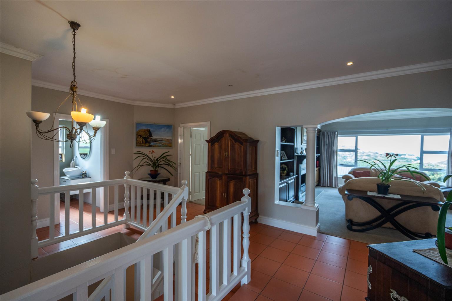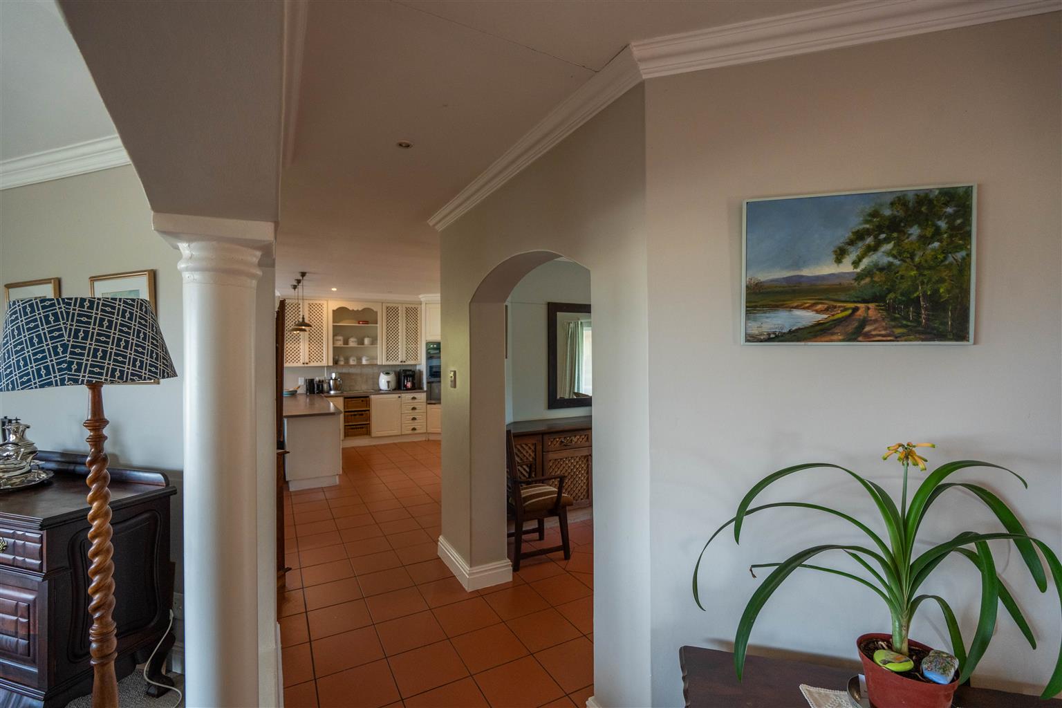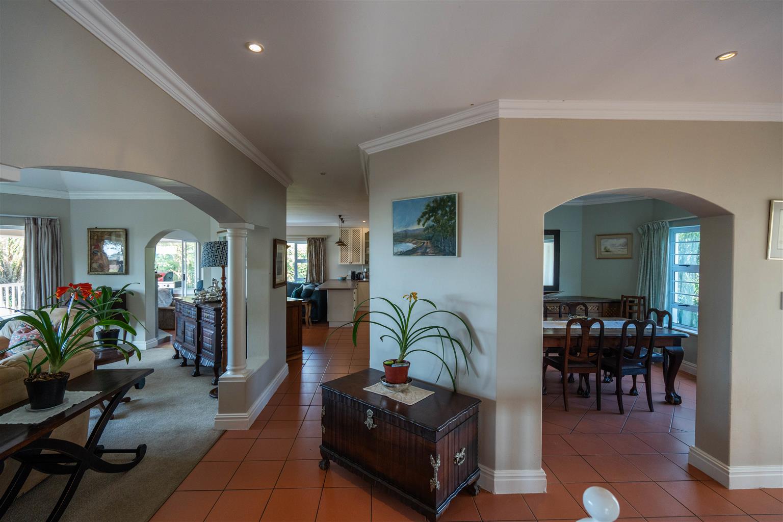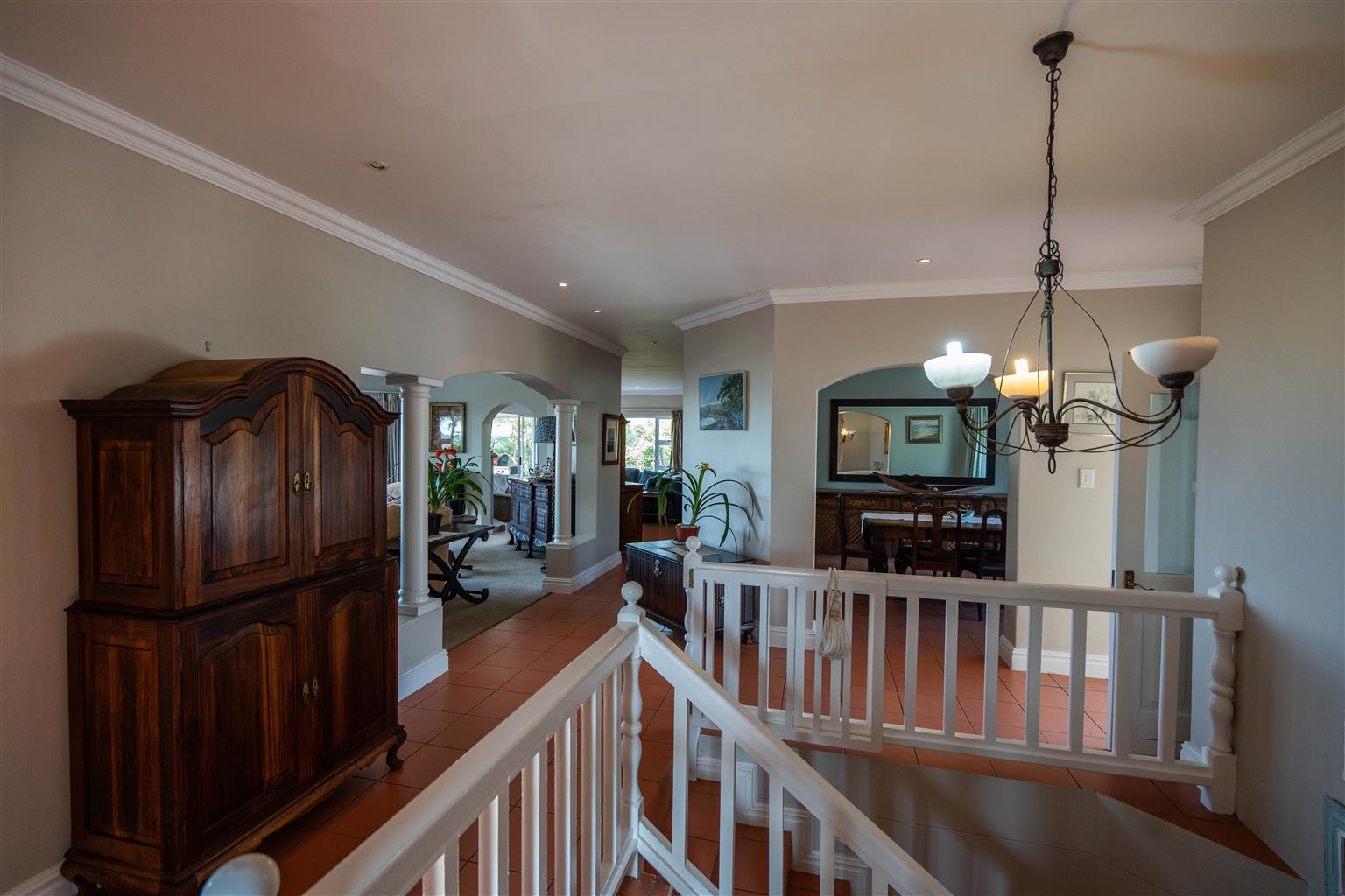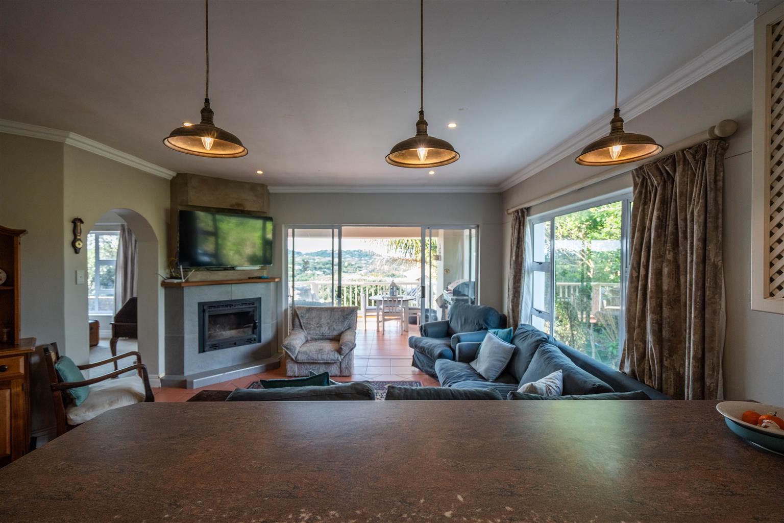 A hallway with dining room on the right of the entrance, leading into a comfortable lounge, superb views. Next to the lounge an open plan TV lounge, kitchen and scullery with enclosed washline area at the back of the home. The TV lounge leads onto a balcony with views of the beautiful garden and pool. A fireplace in the lounge and TV area, perfect for chilly evenings. The double garage leads onto the top floor landing, easily accessible.