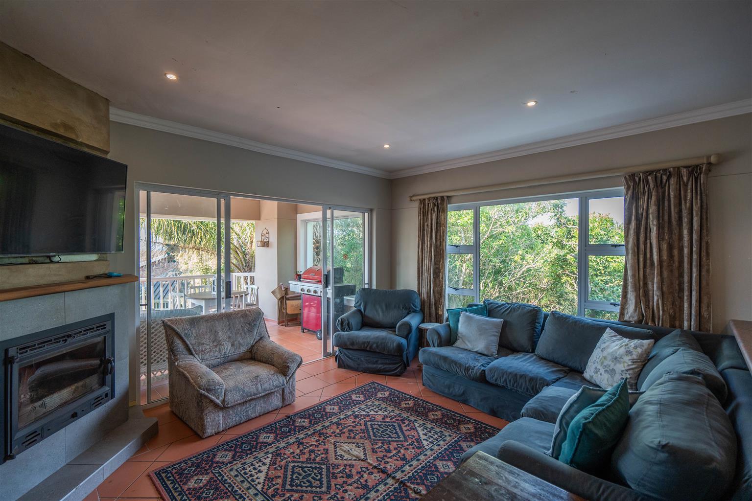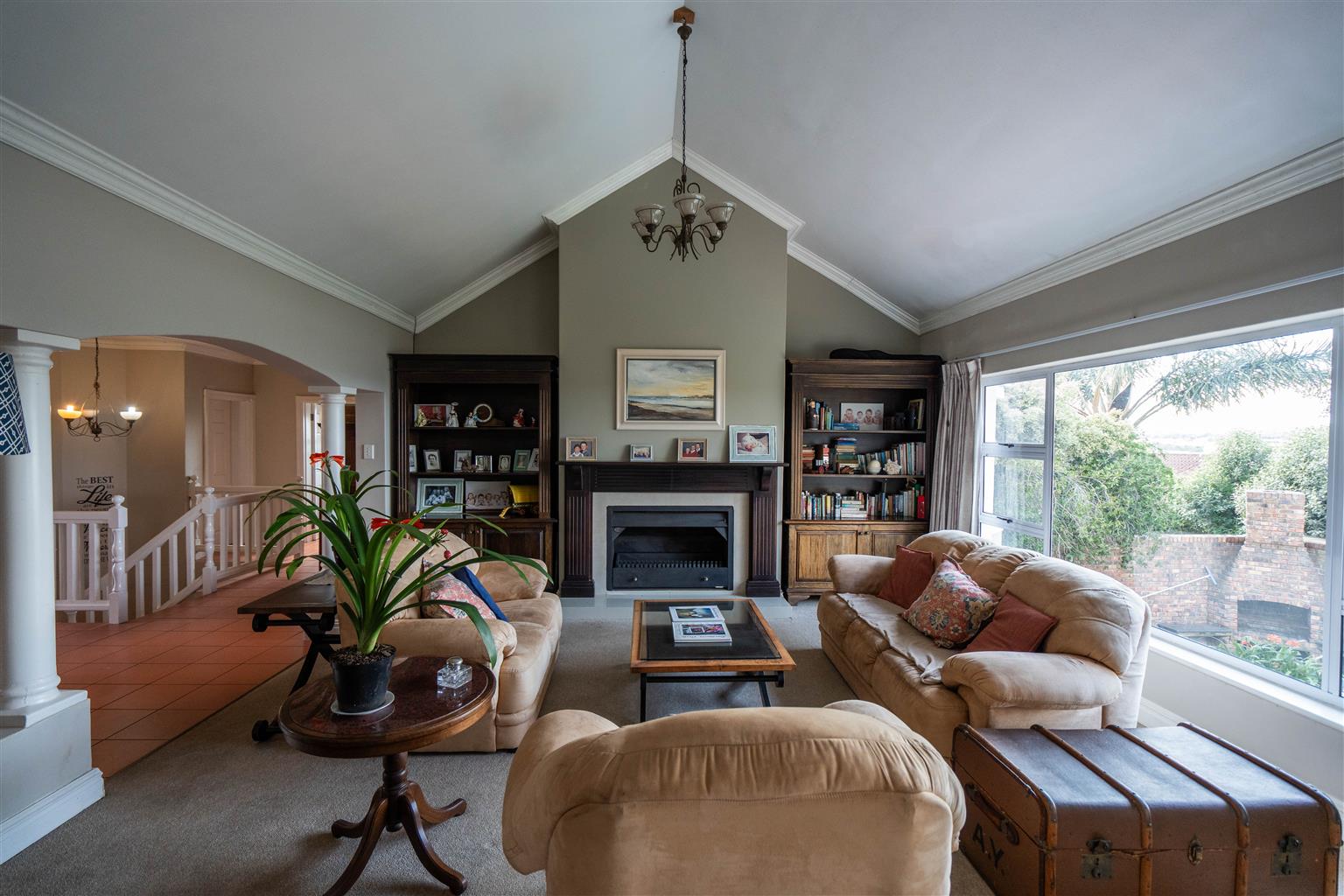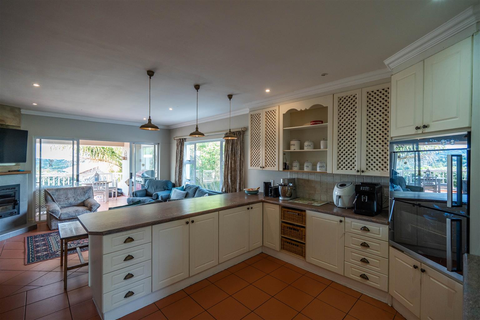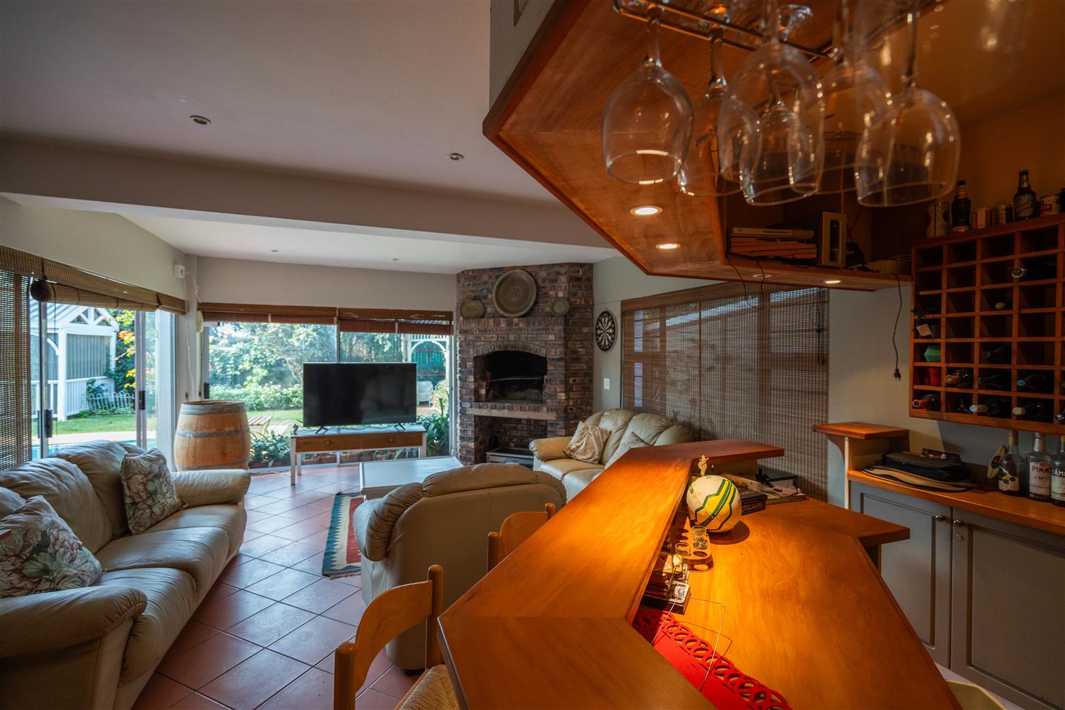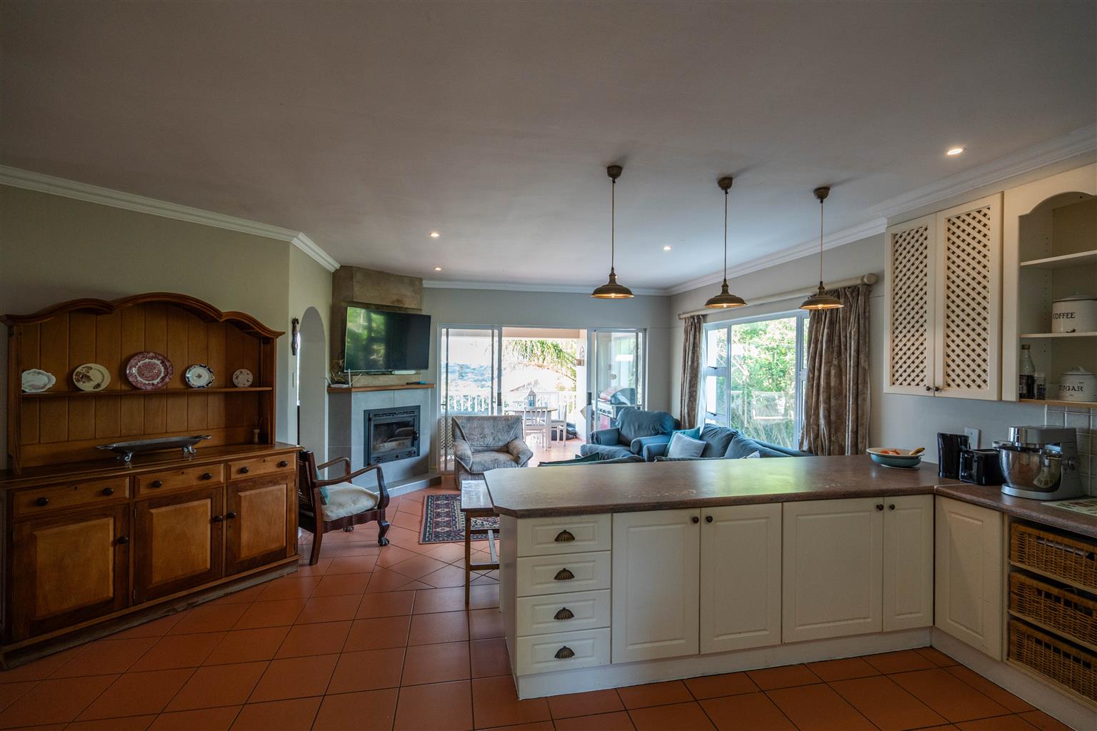 A hallway with dining room on the right of the entrance, leading into a comfortable lounge, superb views. Next to the lounge an open plan TV lounge, kitchen and scullery with enclosed washline area at the back of the home. The TV lounge leads onto a balcony with views of the beautiful garden and pool. A fireplace in the lounge and TV area, perfect for chilly evenings. The double garage leads onto the top floor landing, easily accessible.