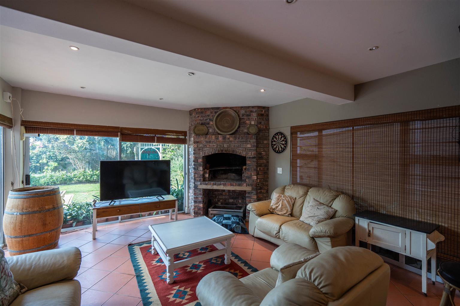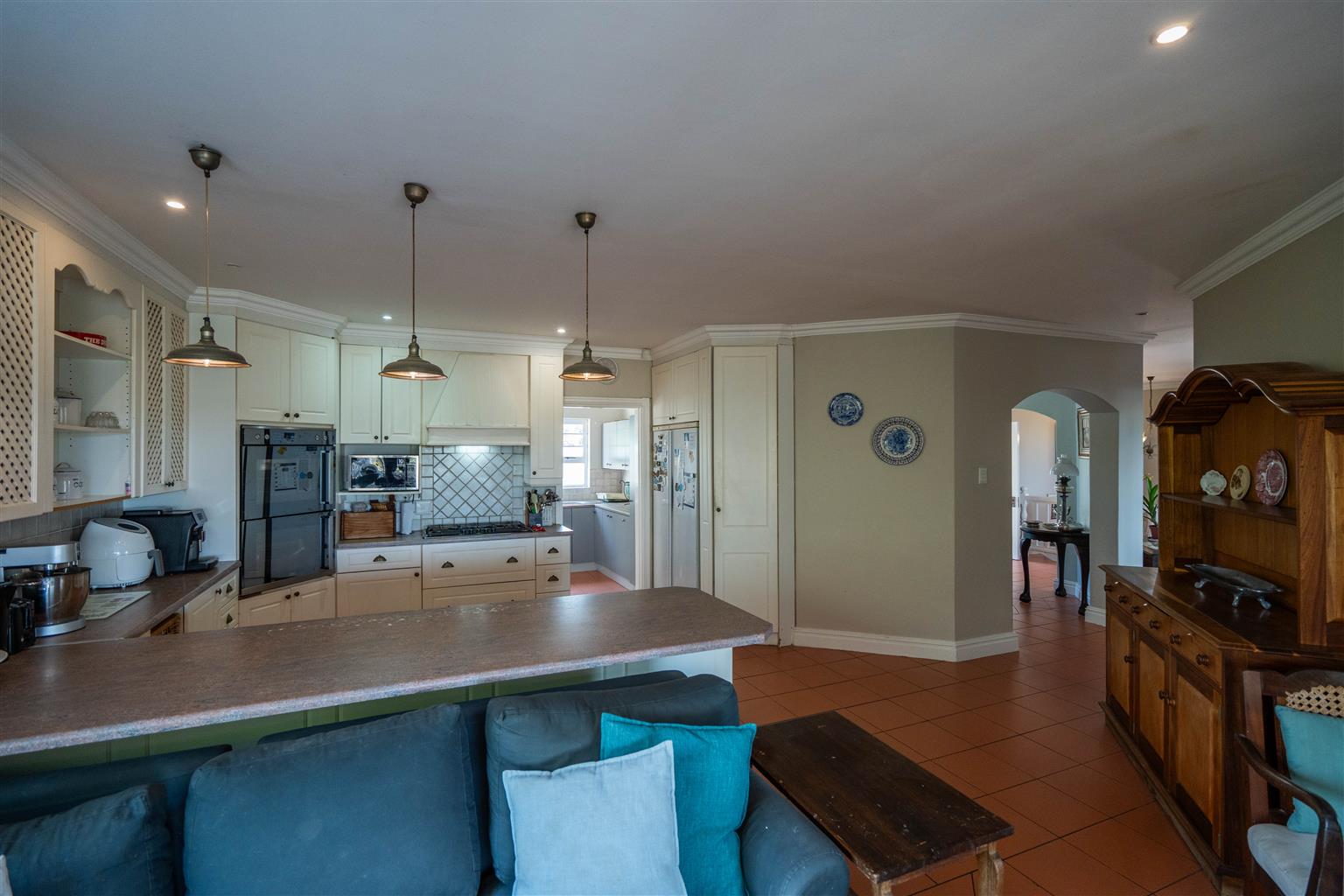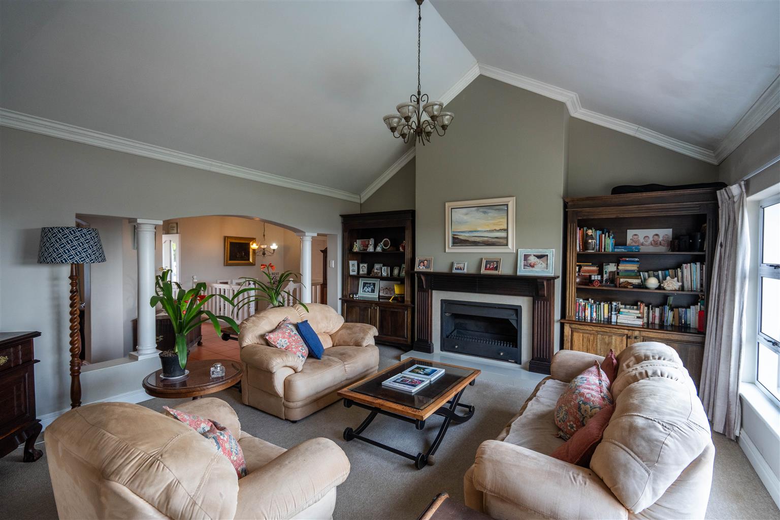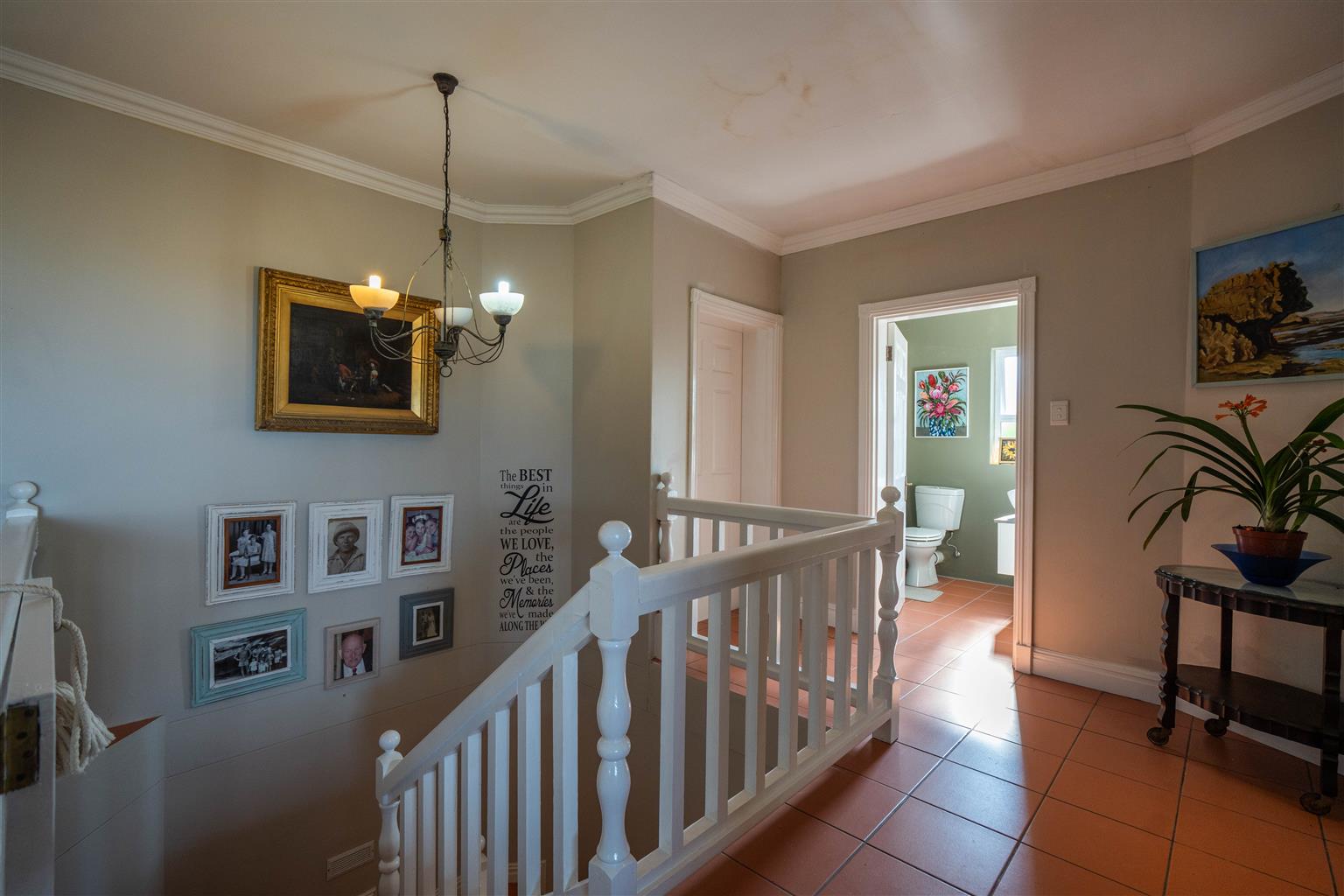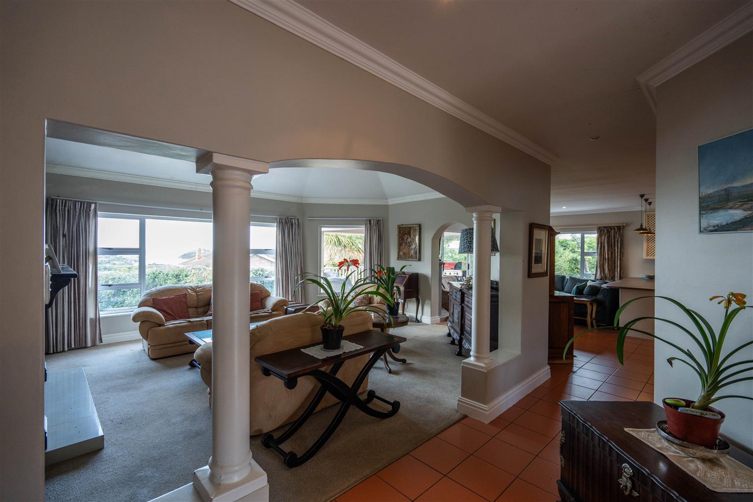 A hallway with dining room on the right of the entrance, leading into a comfortable lounge, superb views. Next to the lounge an open plan TV lounge, kitchen and scullery with enclosed washline area at the back of the home. The TV lounge leads onto a balcony with views of the beautiful garden and pool. A fireplace in the lounge and TV area, perfect for chilly evenings. The double garage leads onto the top floor landing, easily accessible.